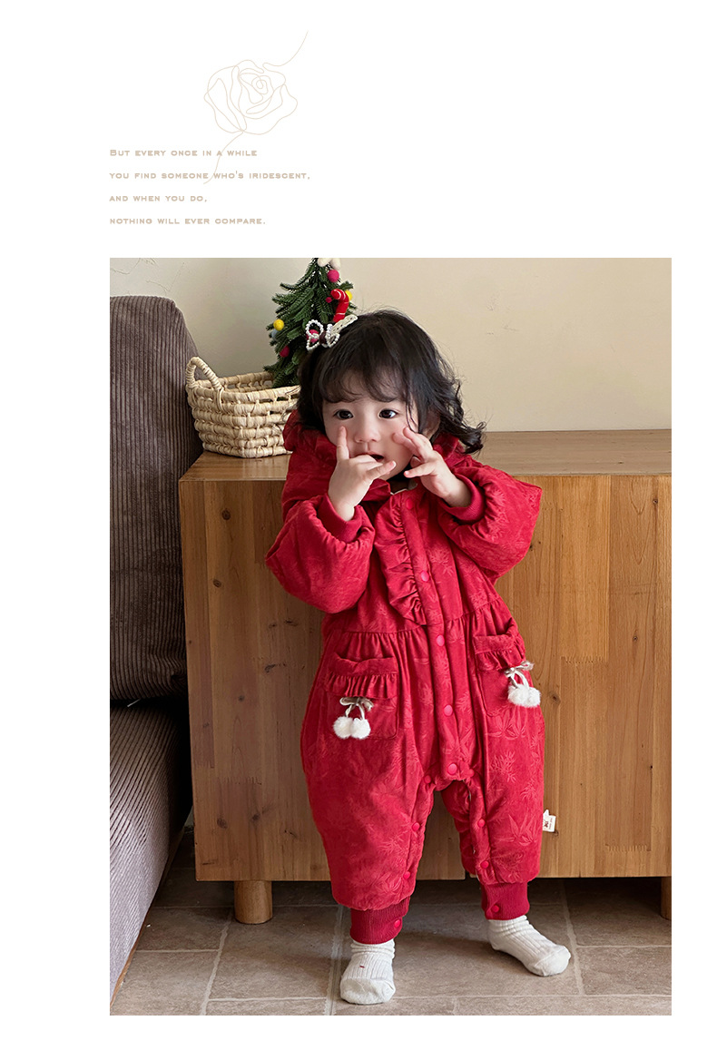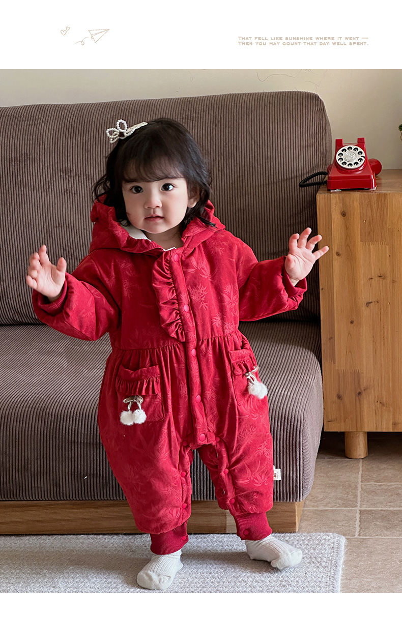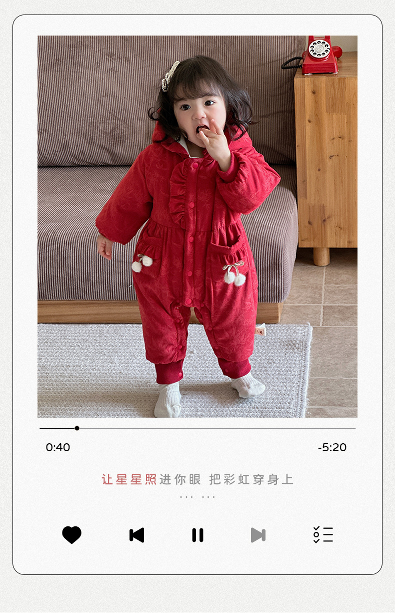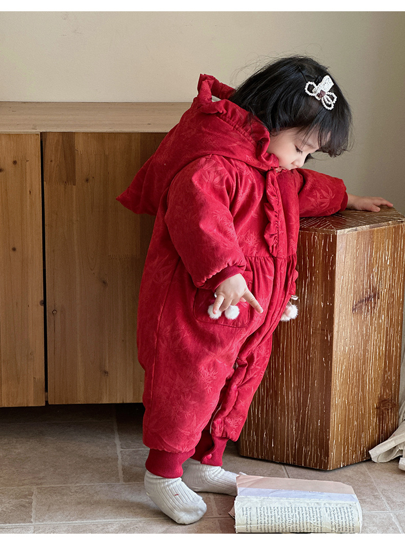 2024 nuevo producto de invierno mono de bebé lindo bolsillo de cereza grueso cálido y cómodo vestido de salida con capucha mamelero