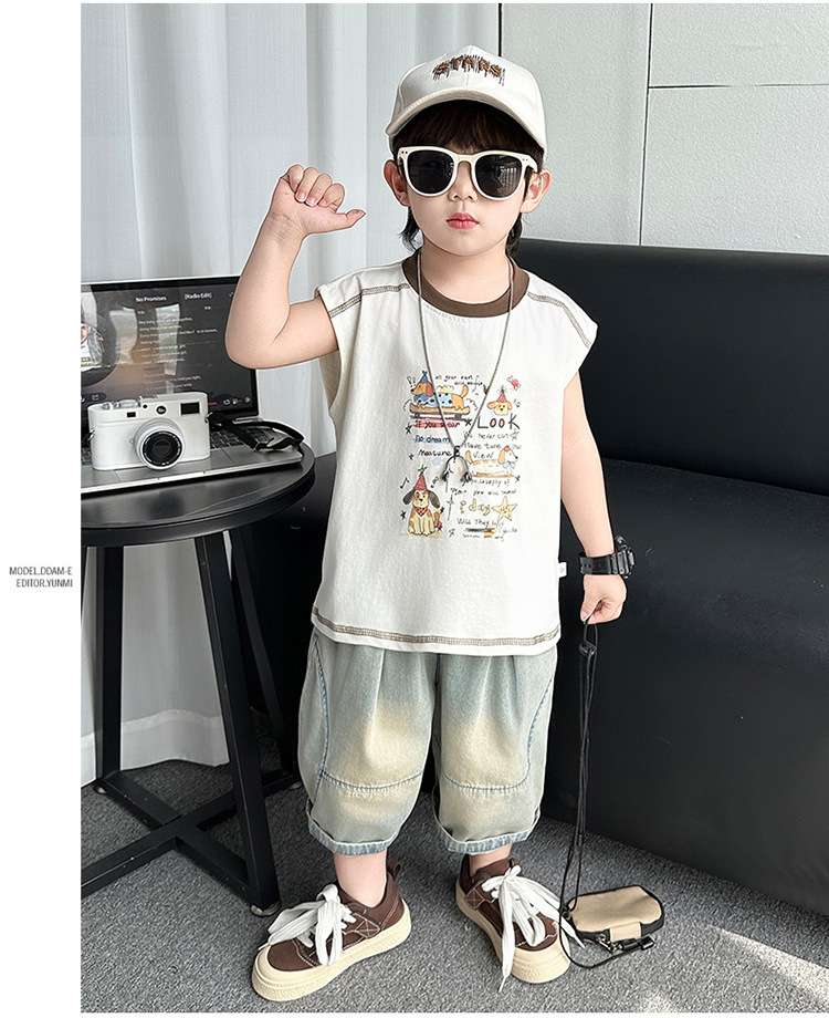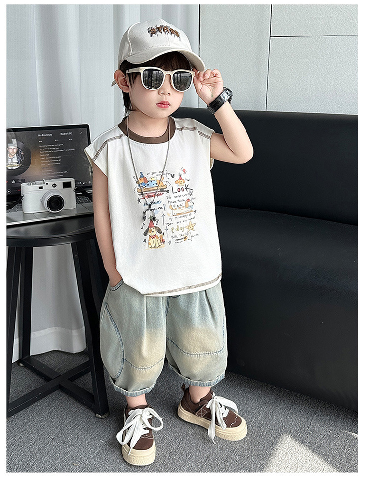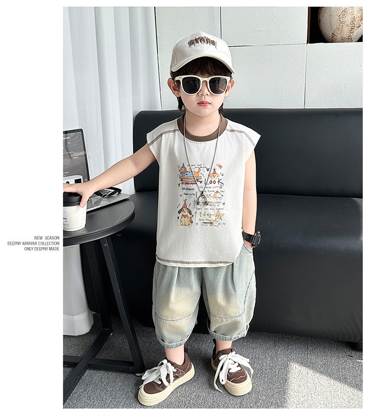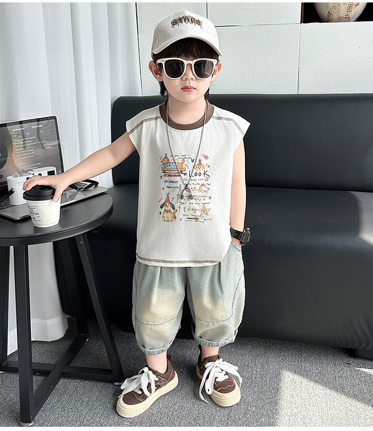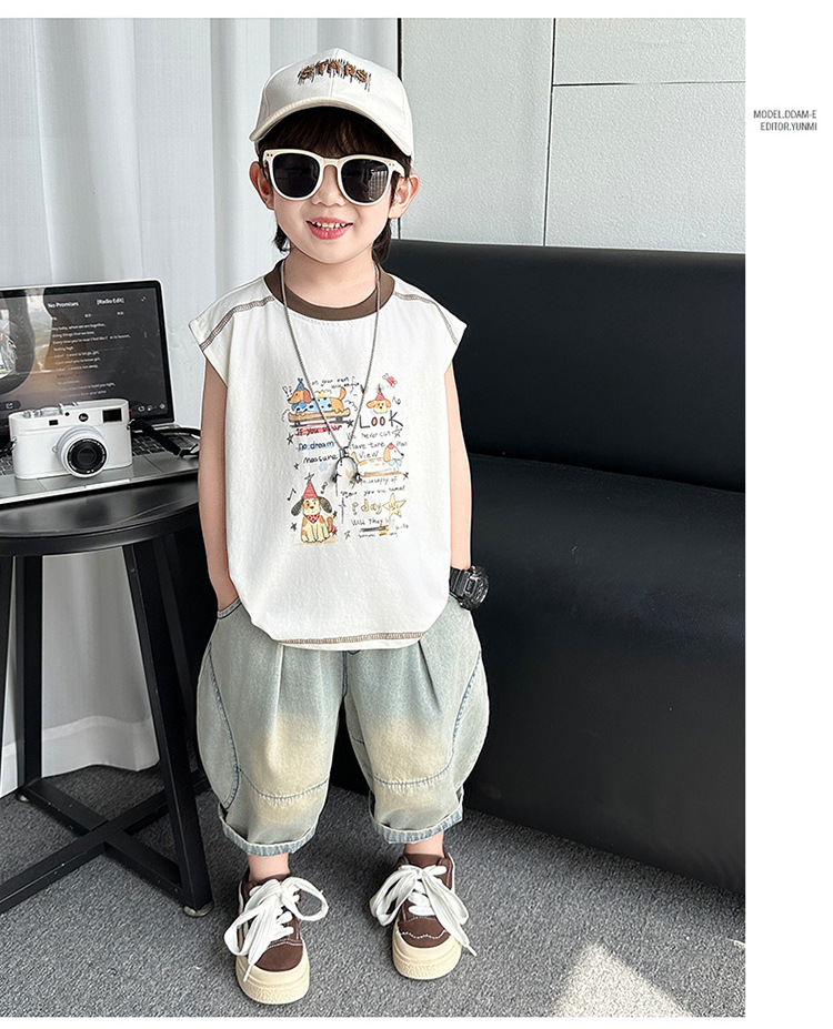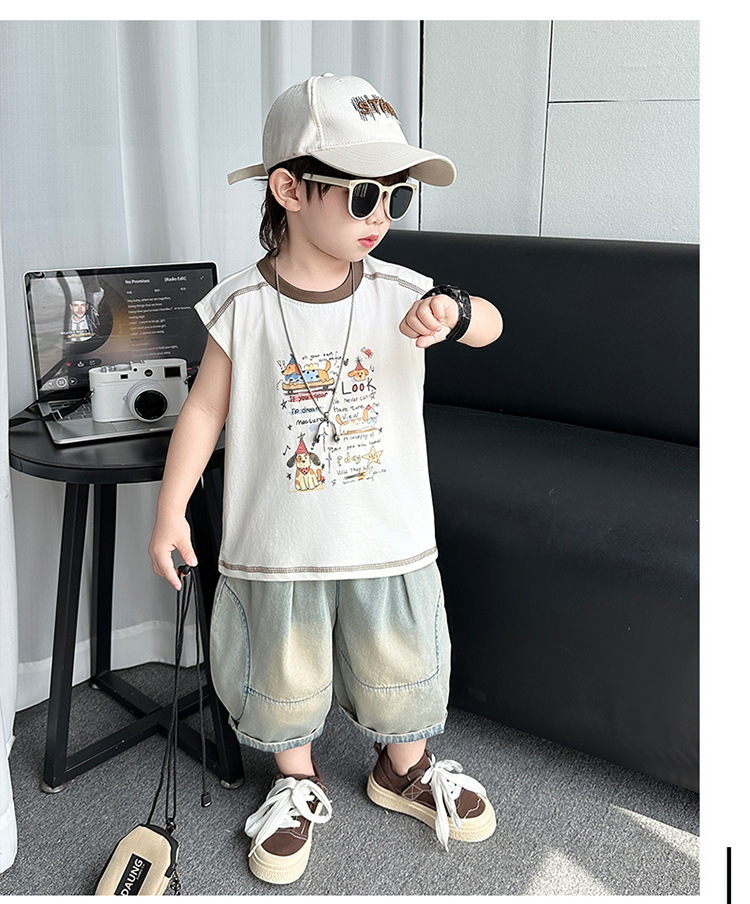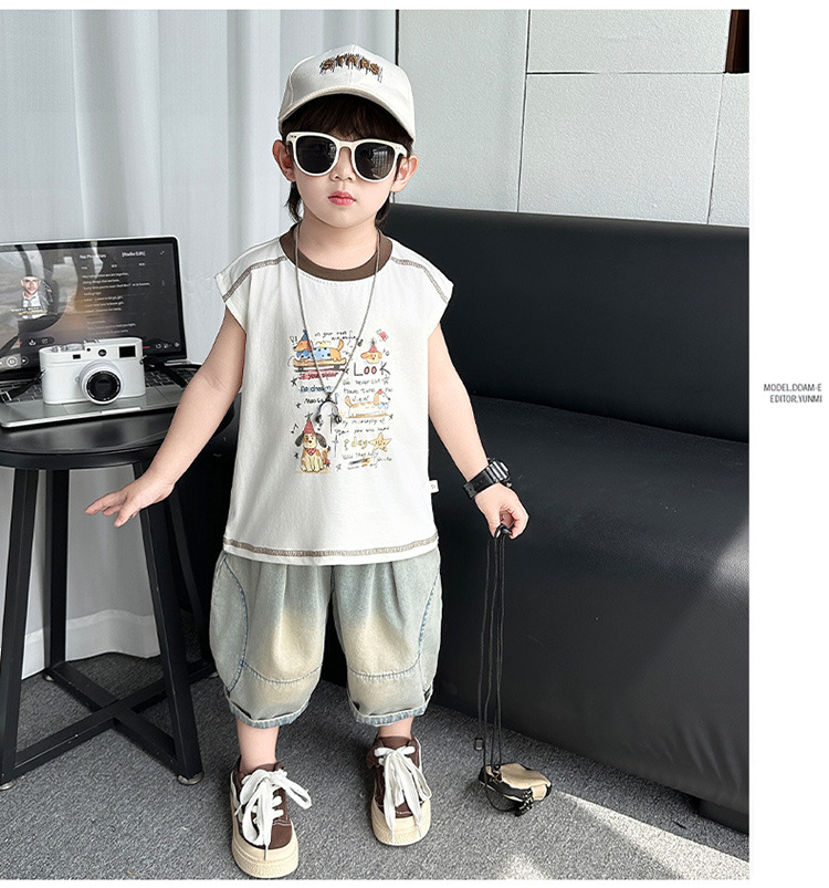 7396 traje de chaleco para niños verano 2025 nuevo vestido de verano sin mangas para niños fresco y guapo bebé delgado de dos piezas de verano