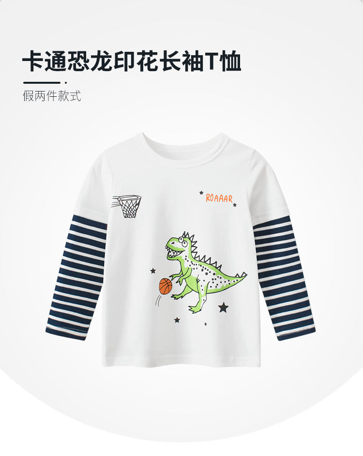 27kids marca ropa para niños otoño nuevo 2024 camiseta de manga larga para niños transfronterizos camisa de fondo para hombres dos dinosaurios falsos