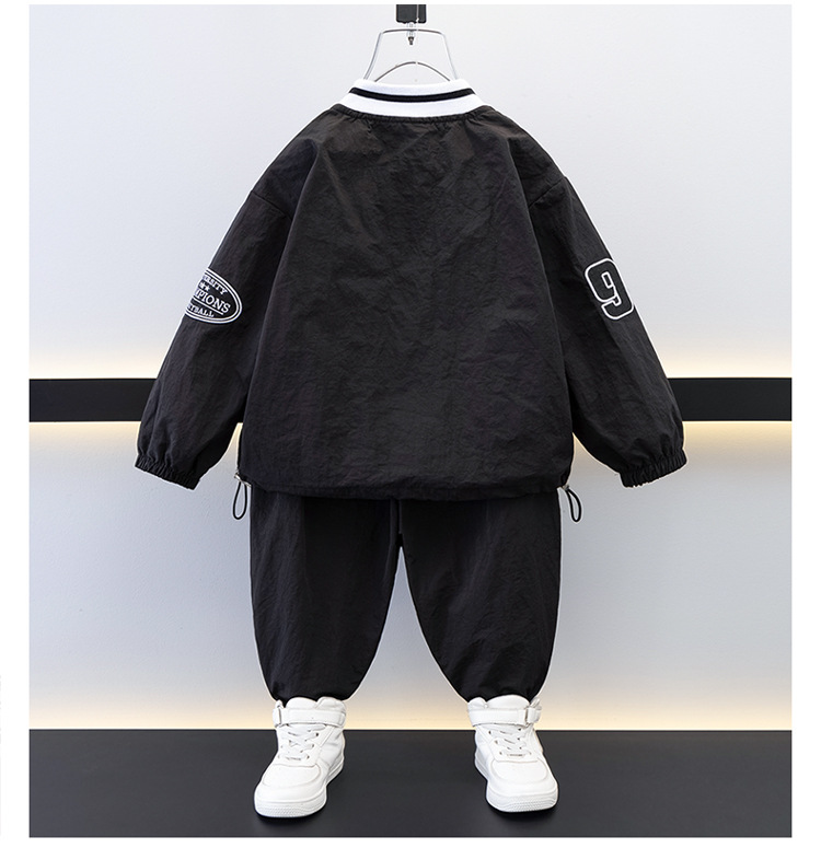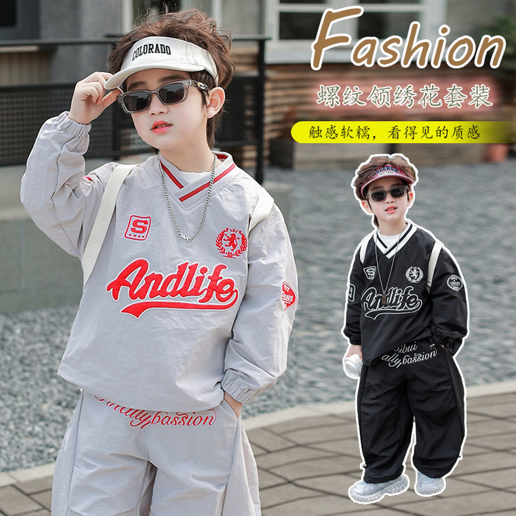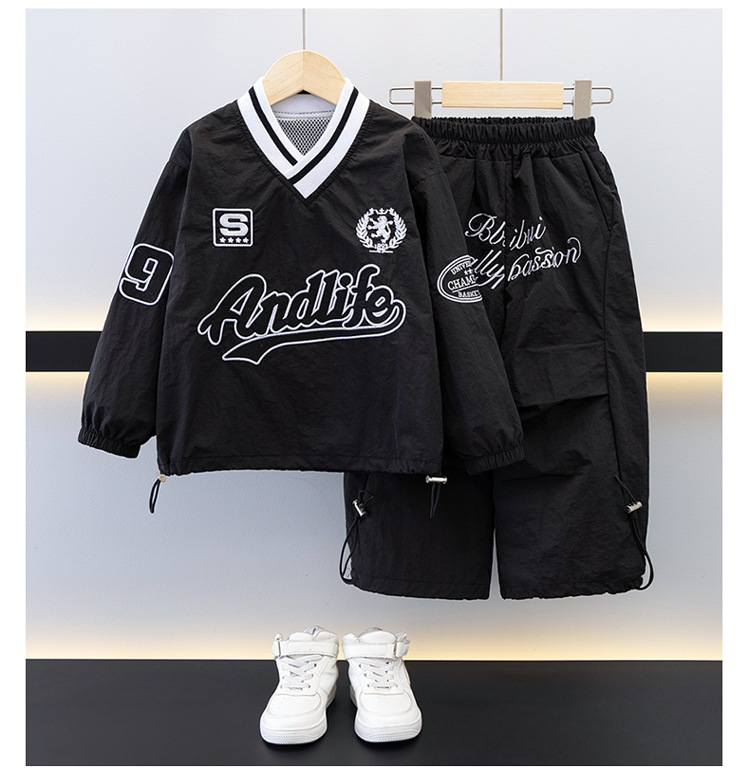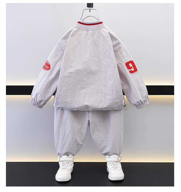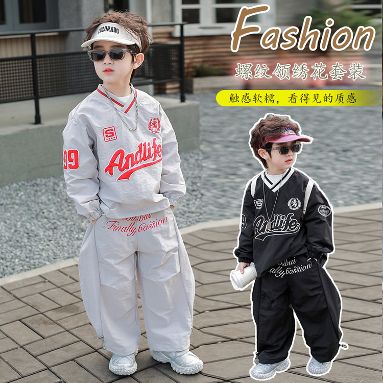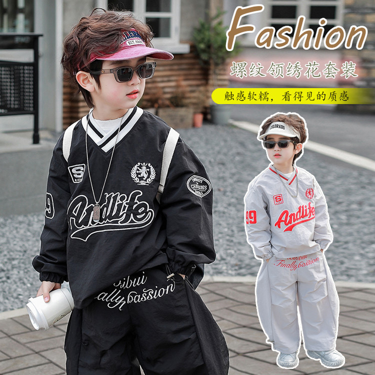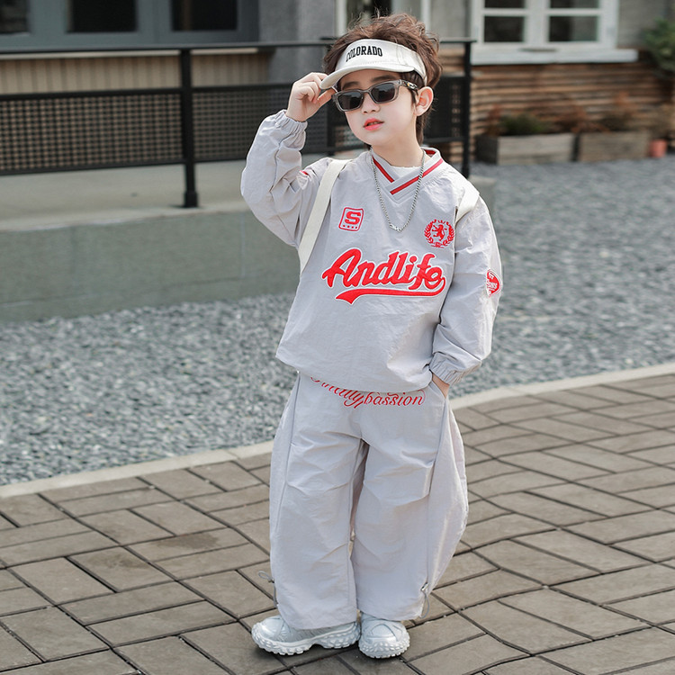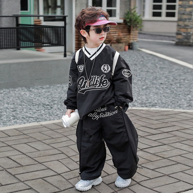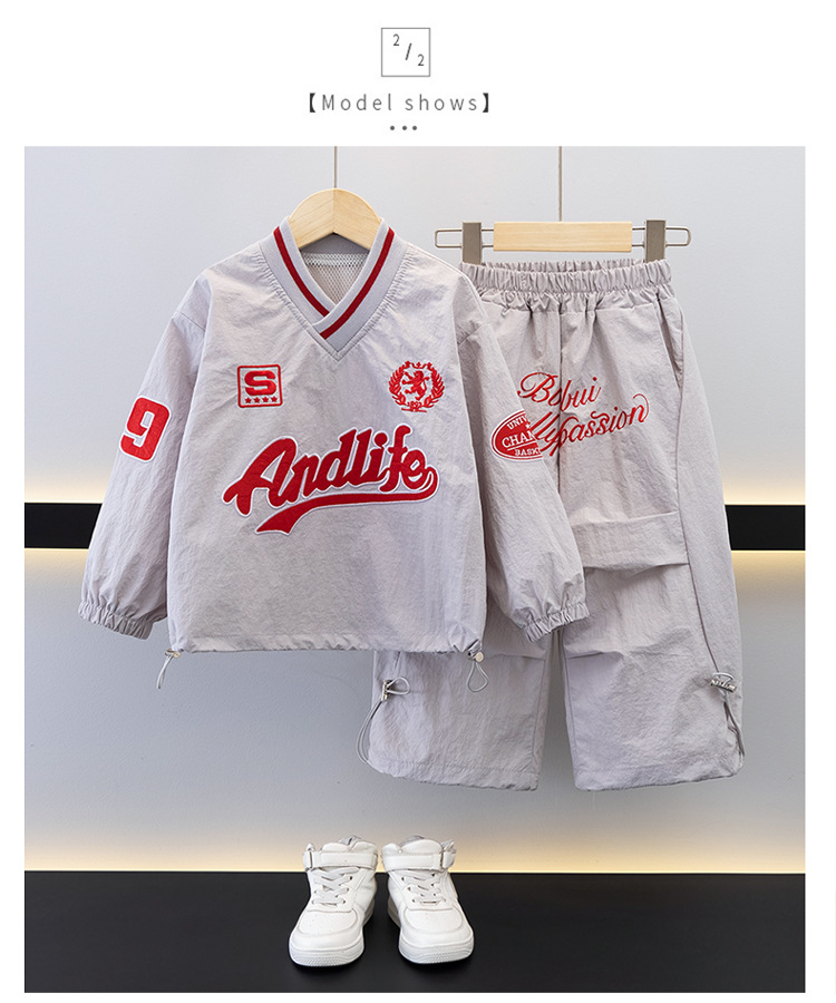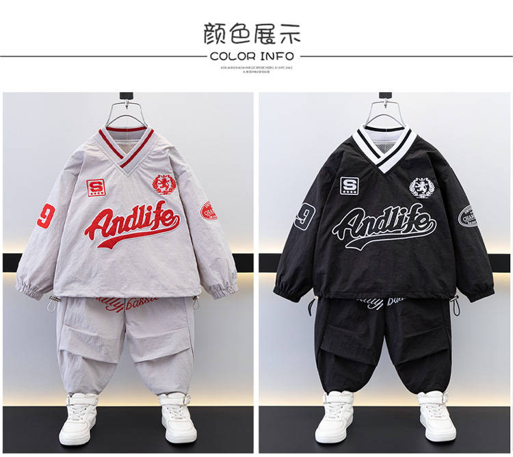 7693 Traje de ocio de herramientas para niños 2025 Primavera Nuevo estilo para niños pequeños y medianos Top de letras para bebés Pantalones de dos piezas