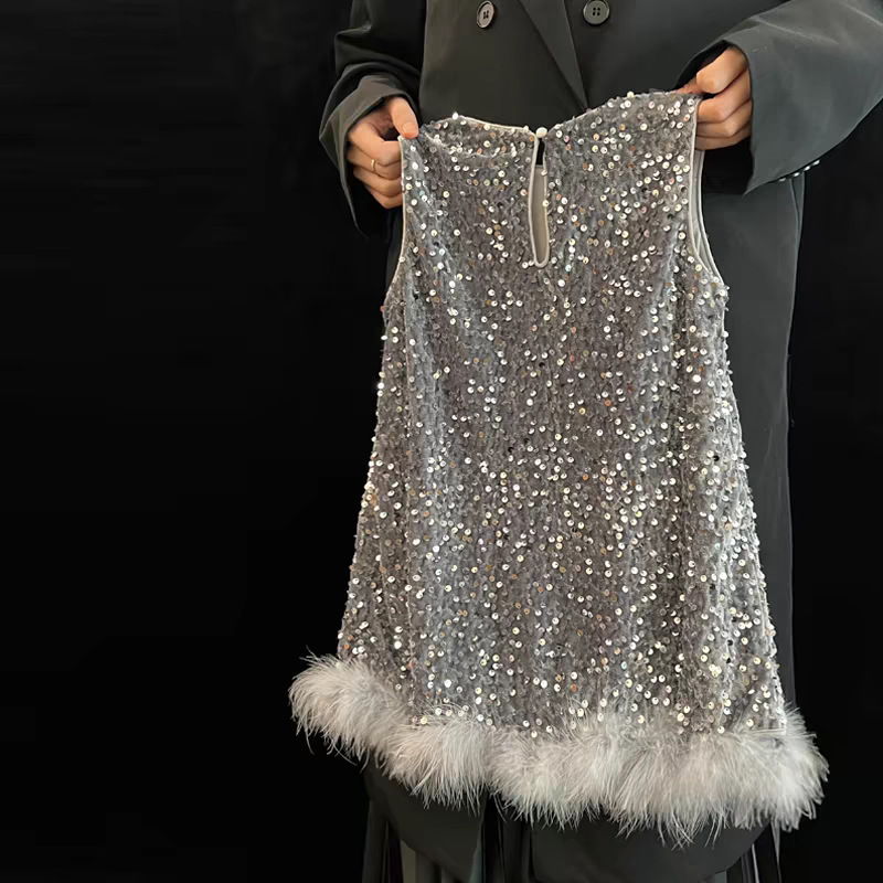 Ropa de marca infantil 2025 primavera nuevo vestido de niña niño de alta sensibilidad chaleco de plumas vestido vestido princesa