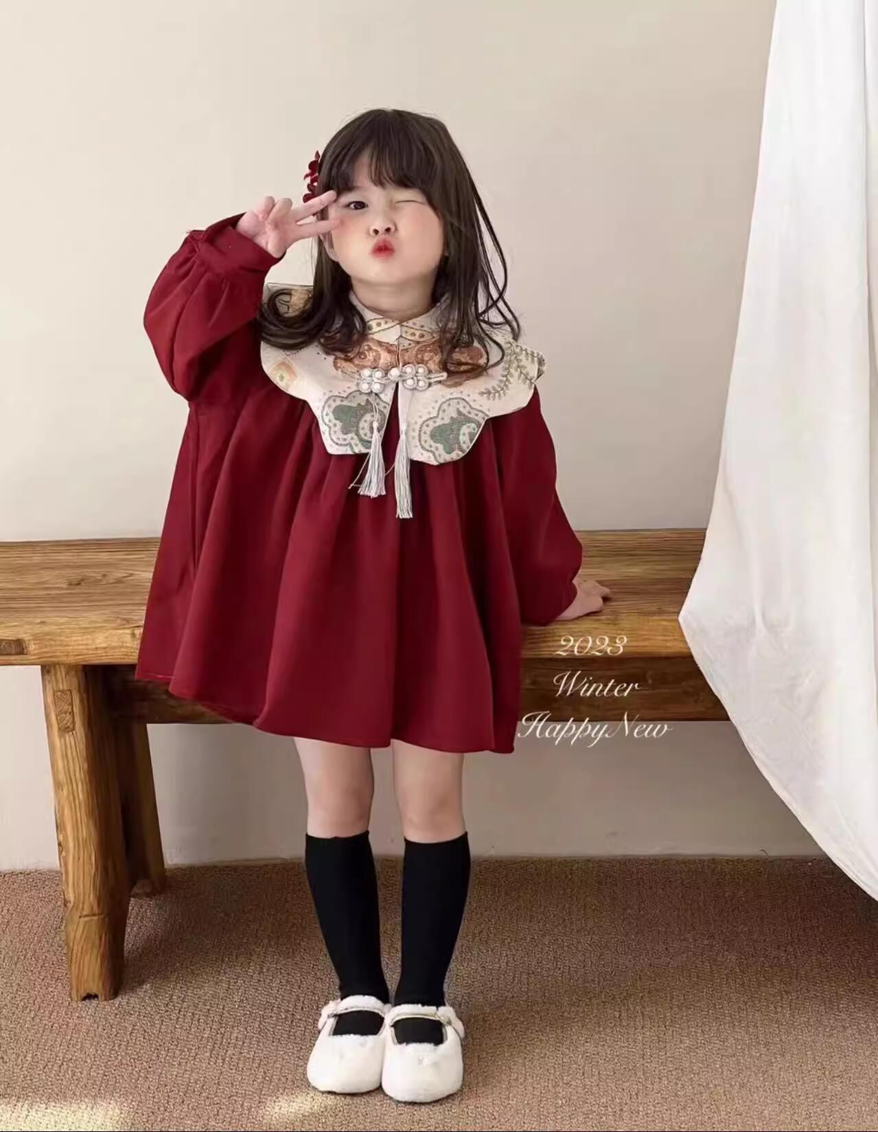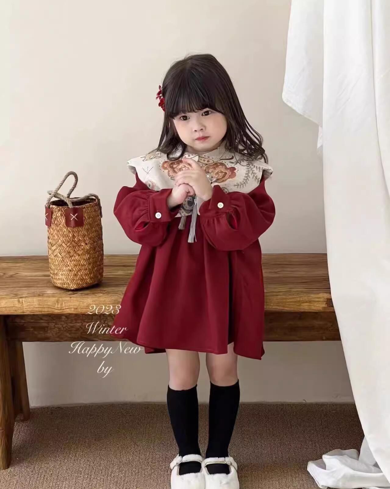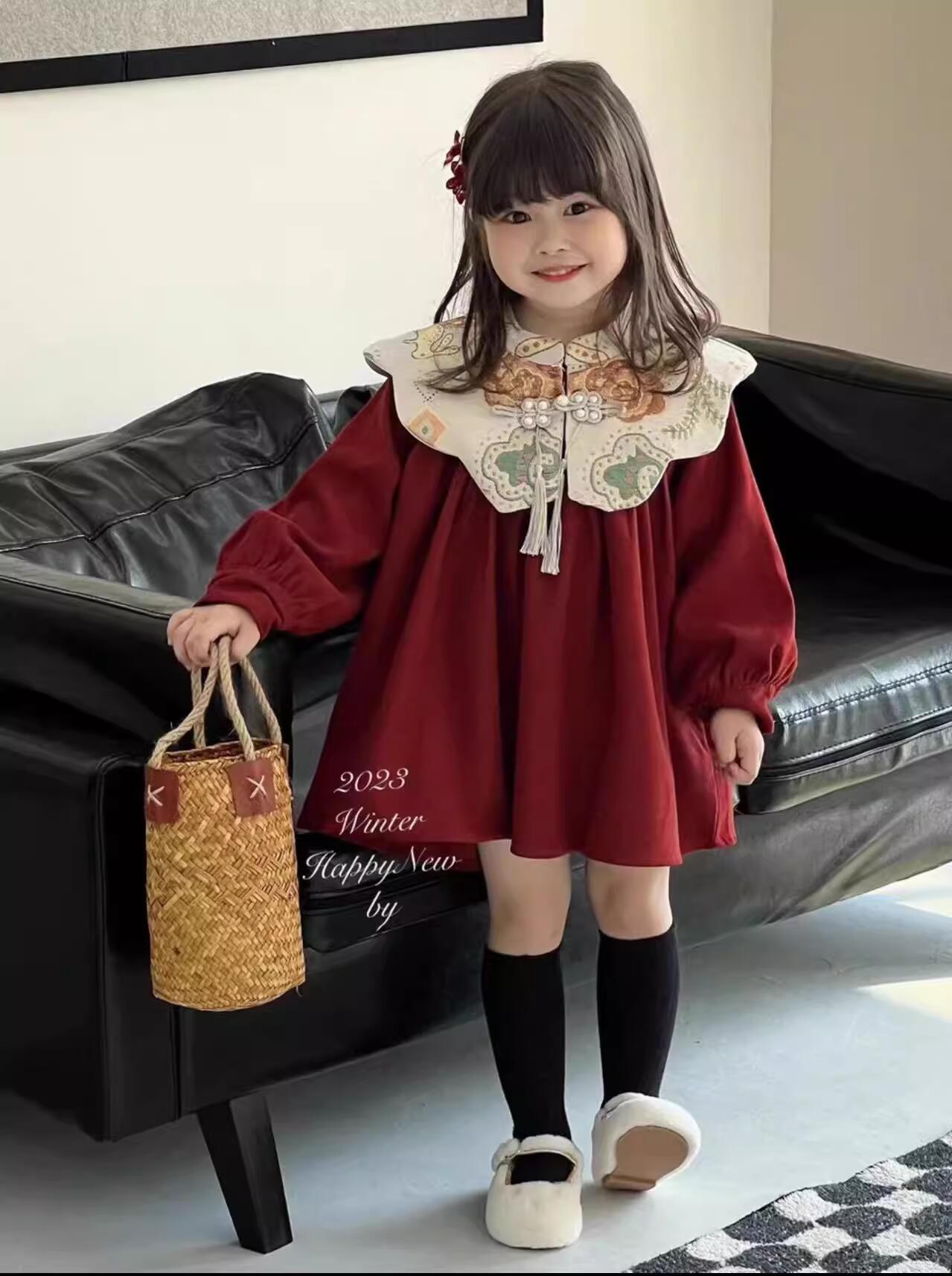 Niñas invierno bordado vestido de hombro nublado vestido de Año Nuevo vestido rojo vestido de Año Nuevo chino vestido de princesa infantil