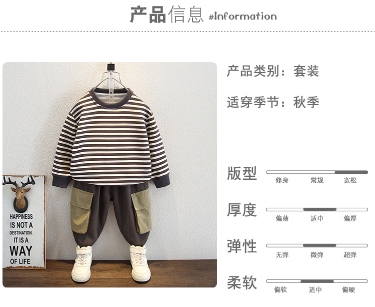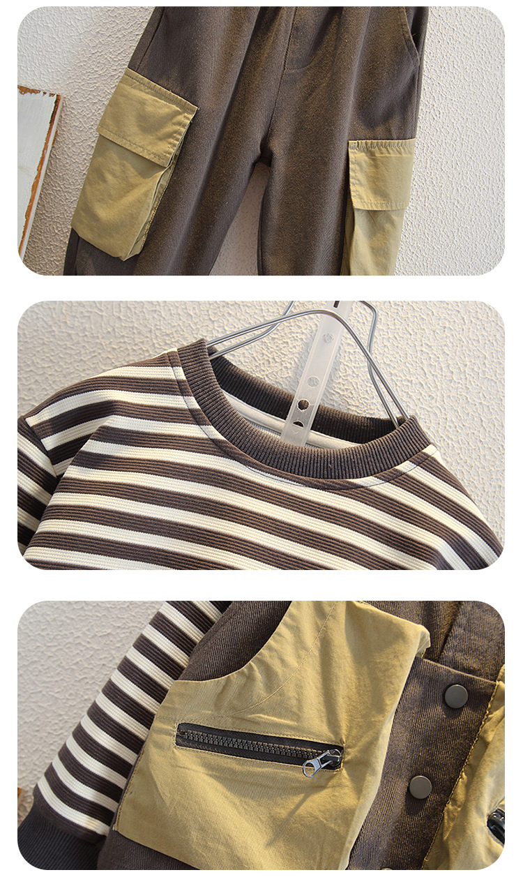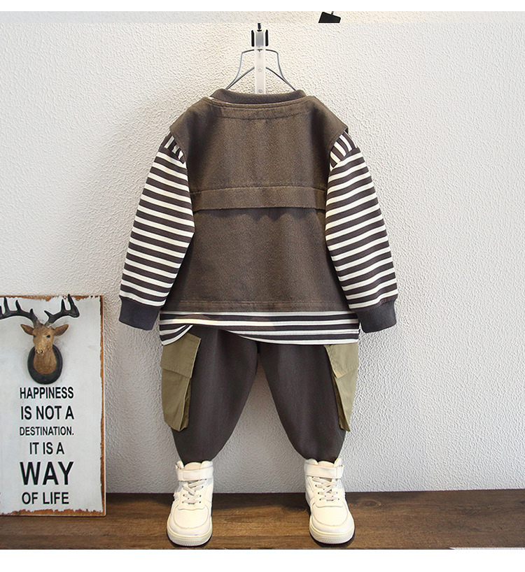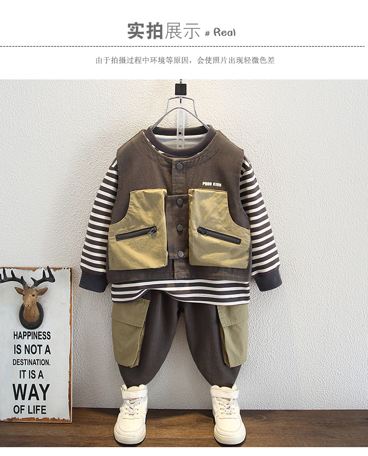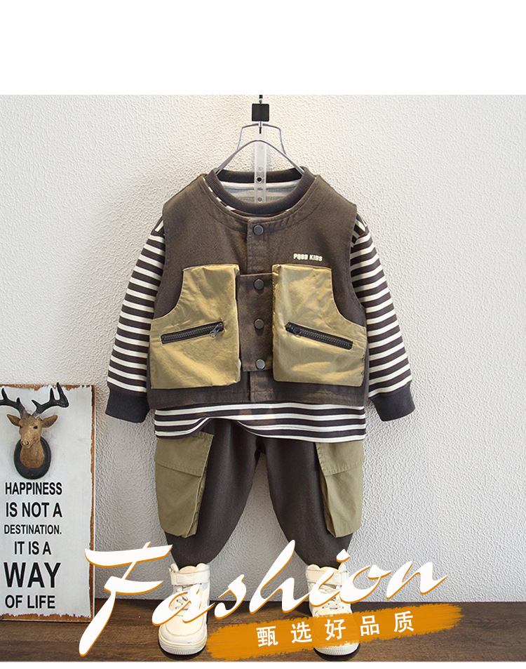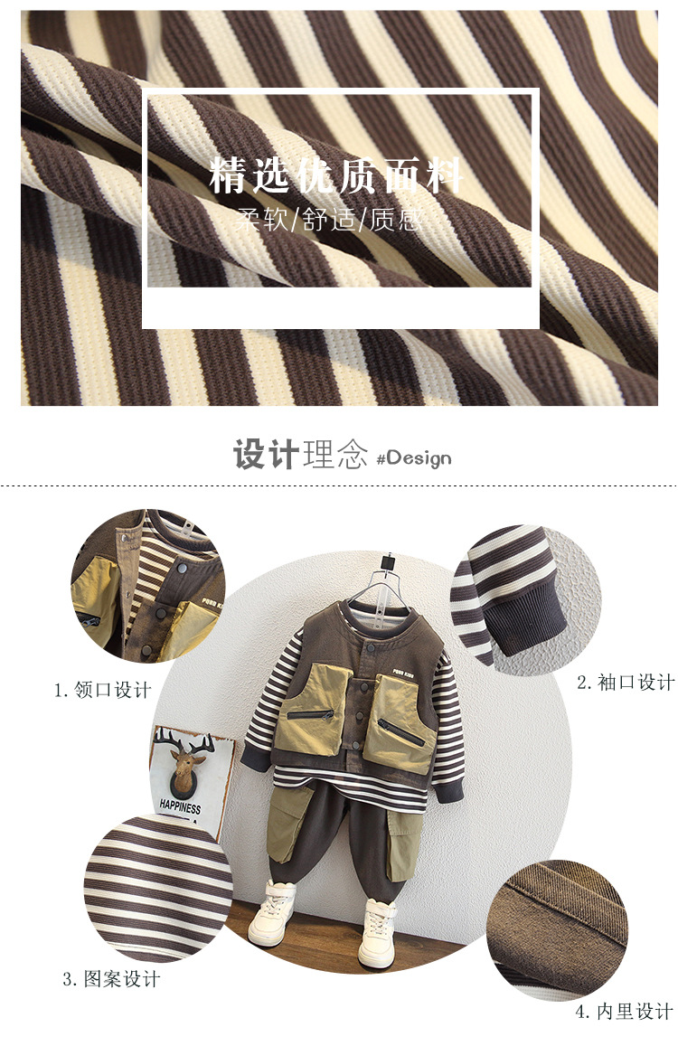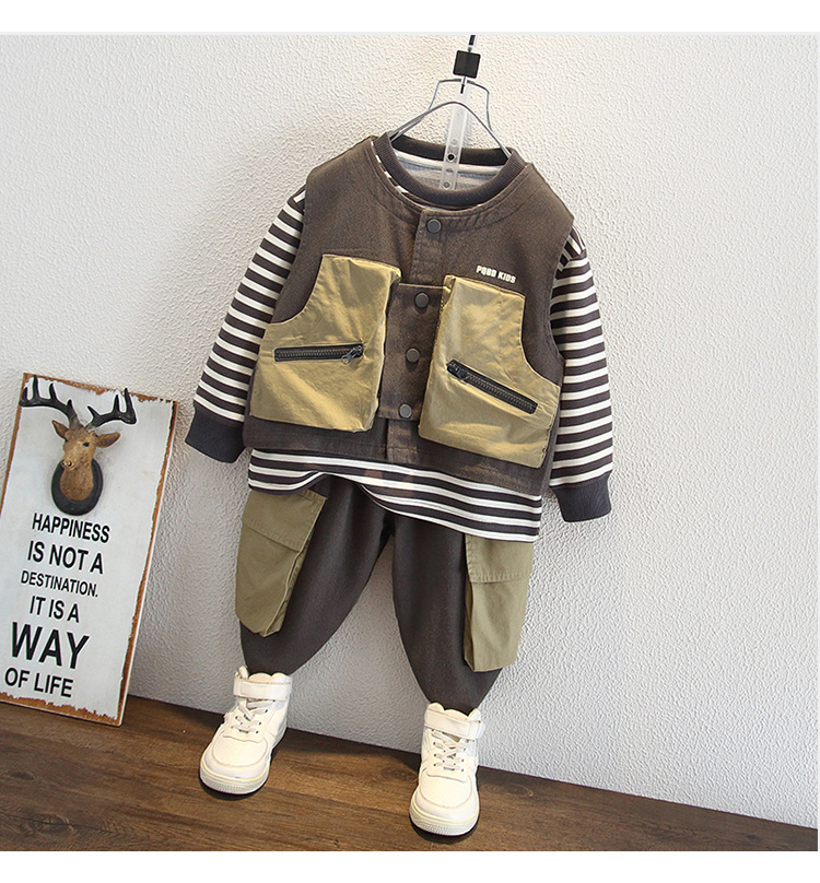 5954 traje de otoño para niños 2024 nuevo abrigo a rayas para niños de tres piezas chaleco coreano de primavera y otoño para bebés