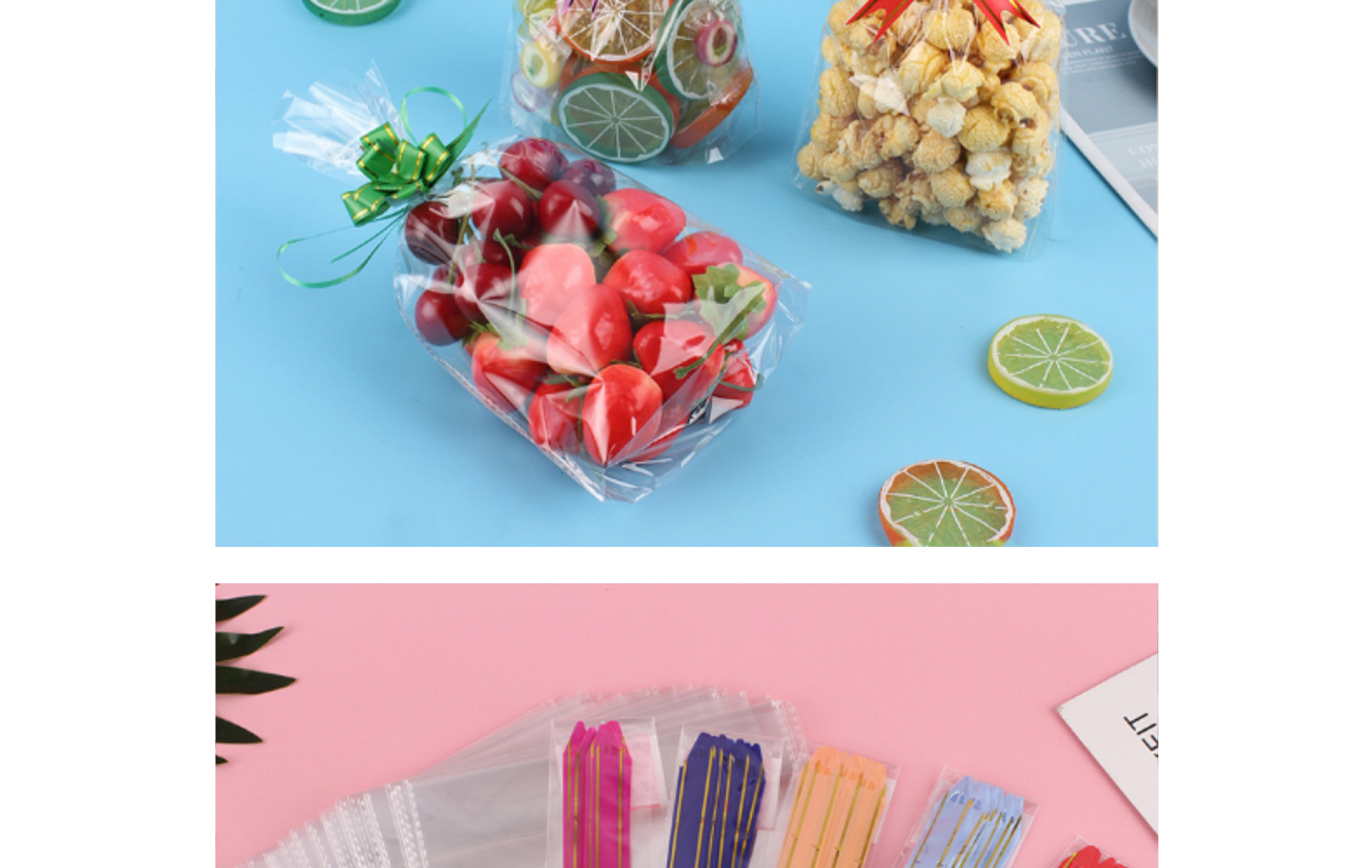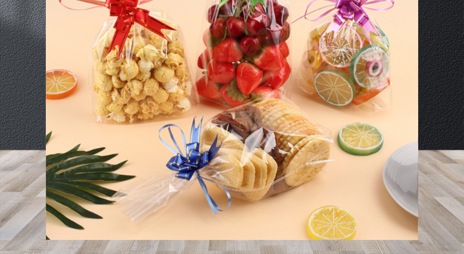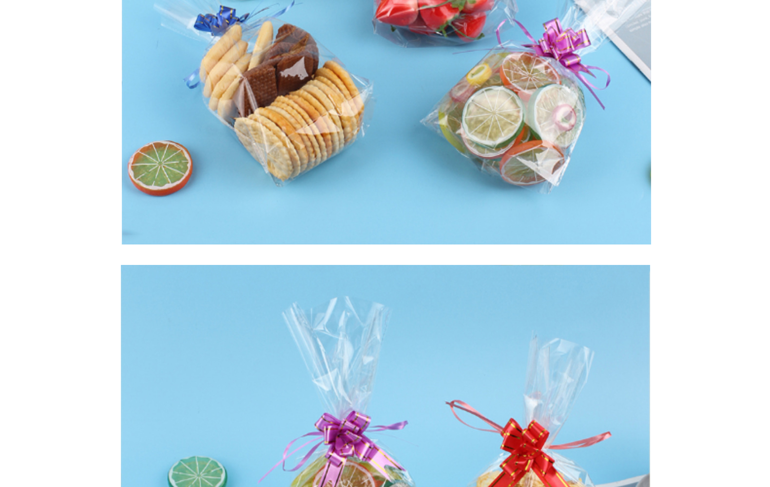 En stock al por mayor OPP transparente bolsillo plano caramelo bolsa de embalaje de plástico con arco de diez colores Garland bolsillo con cordón