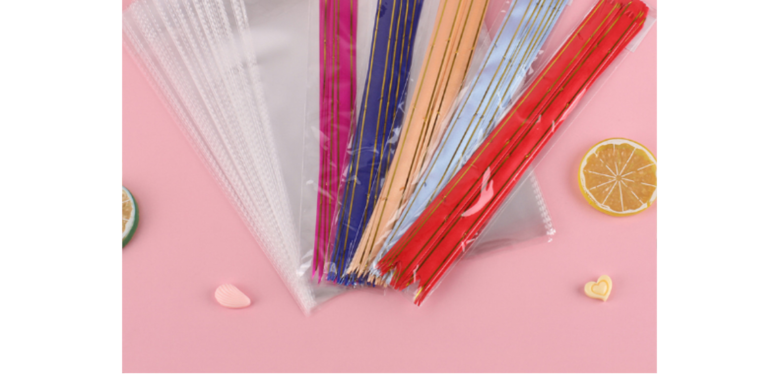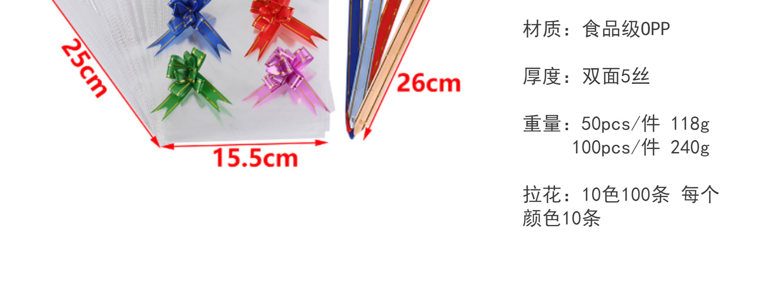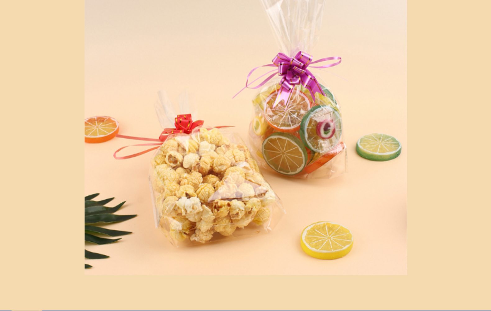 En stock al por mayor OPP transparente bolsillo plano caramelo bolsa de embalaje de plástico con arco de diez colores Garland bolsillo con cordón