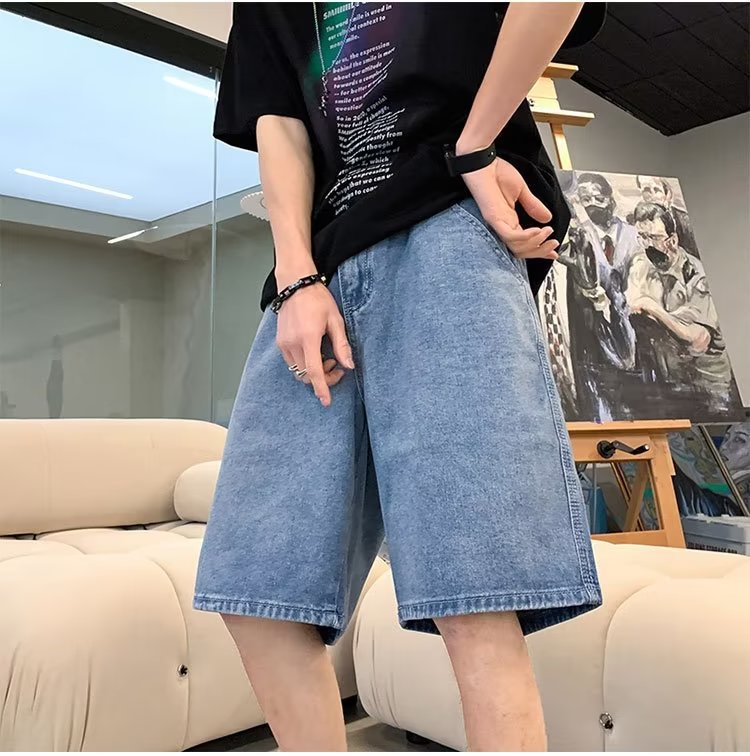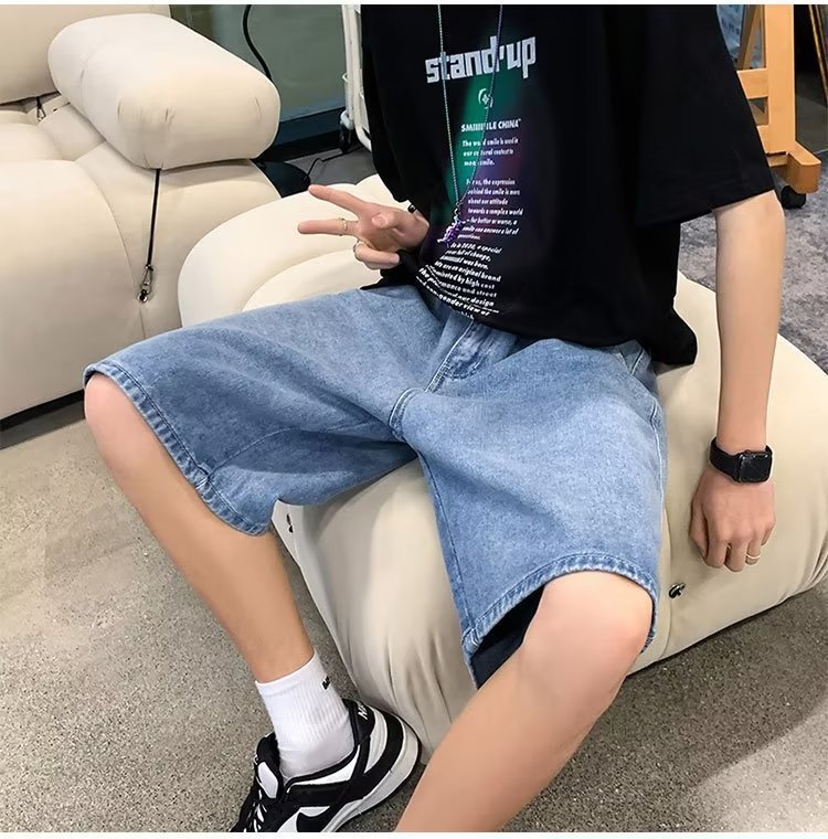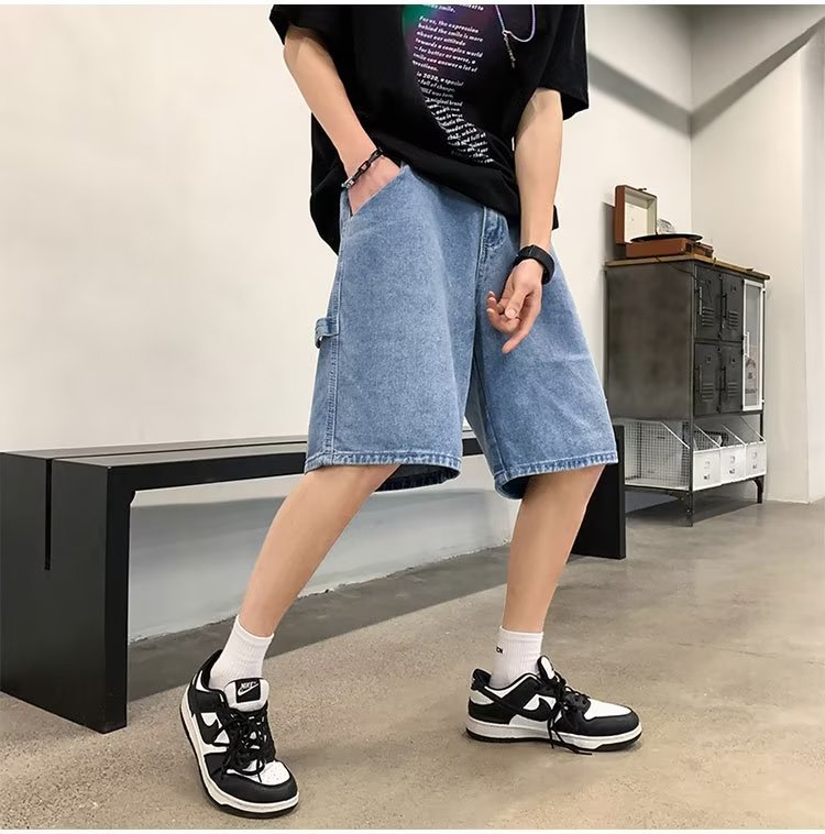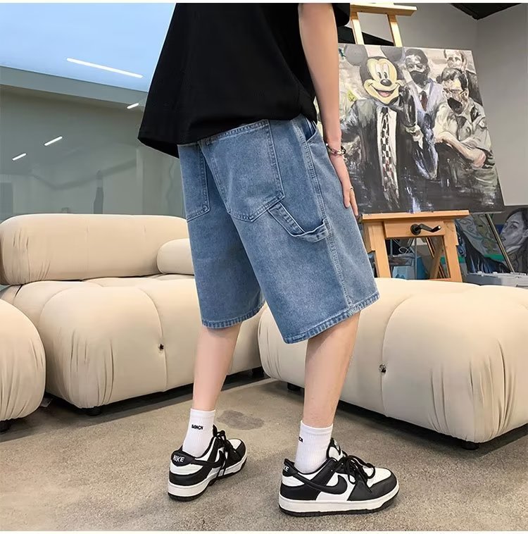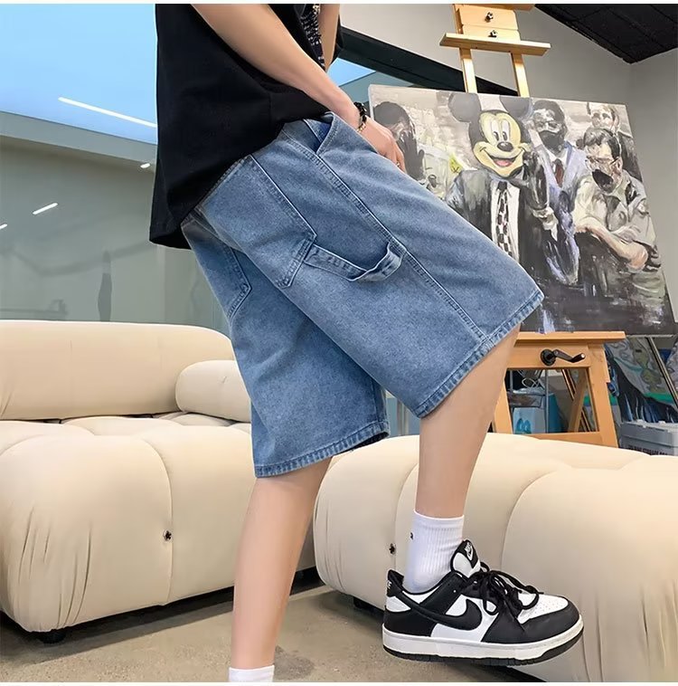 Ropa de trabajo pantalones cortos de mezclilla pantalones cortos de pierna ancha estilo de Hong Kong de estilo fino de verano para hombres pantalones sueltos de marca de moda con bolsillos grandes