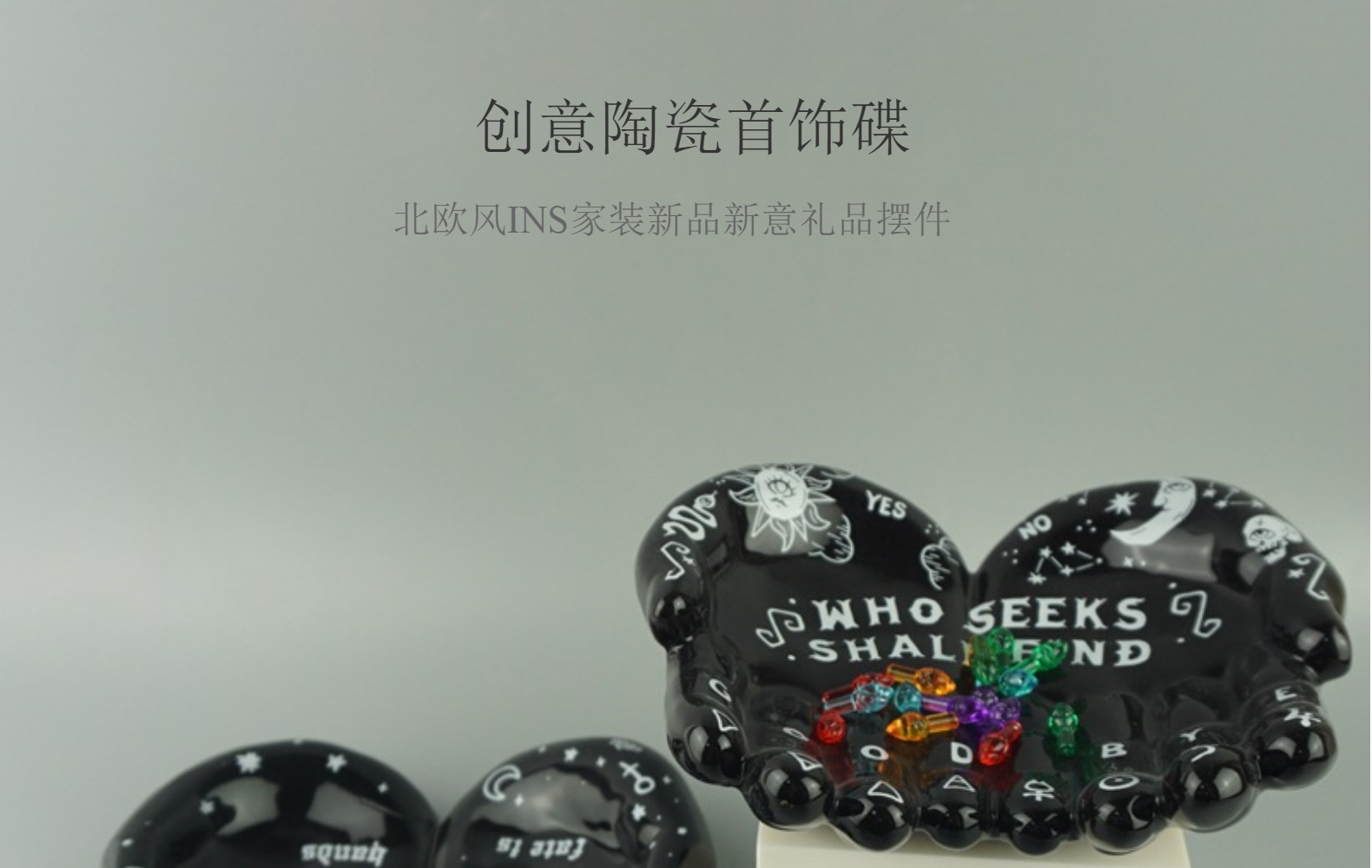 Placa de exhibición de almacenamiento de joyería de Halloween cuidadosamente seleccionada Placa de anillo de joyería de cerámica negra Placa de collar de soporte de joyería de palma de Buda