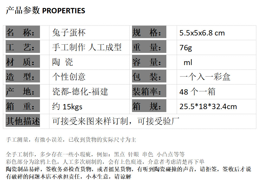 Conejo de Pascua transfronterizo Taza de huevo Artesanía de cerámica creativa Decoración del hogar diario Taza de conejo Decoración linda Dehua
