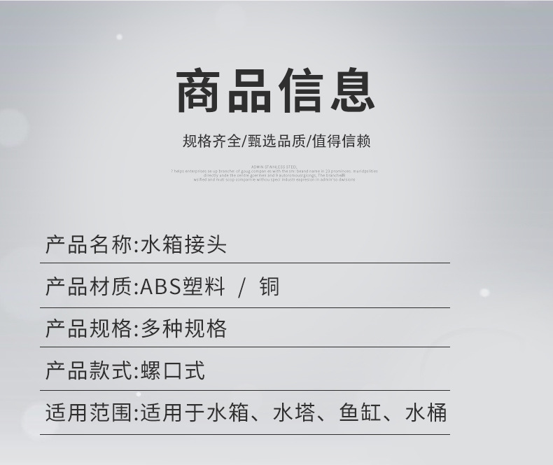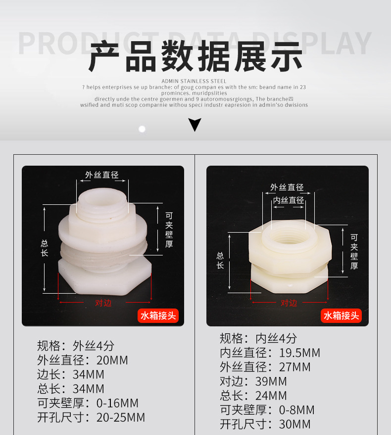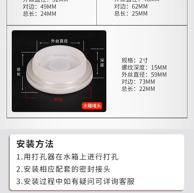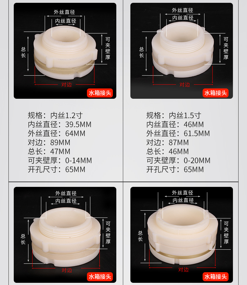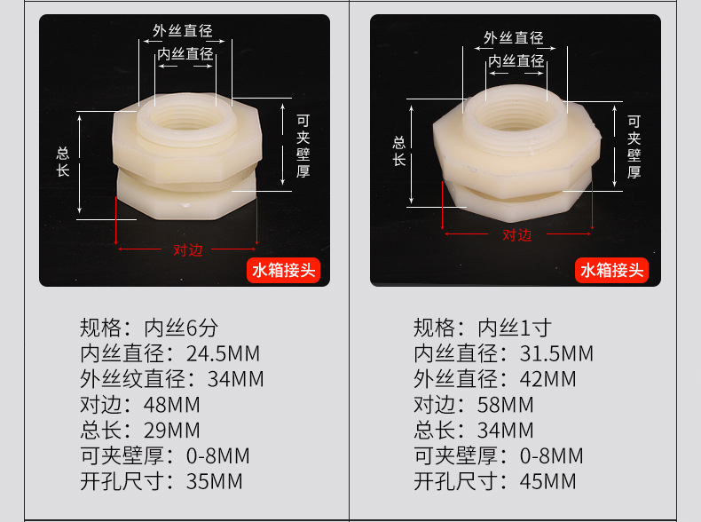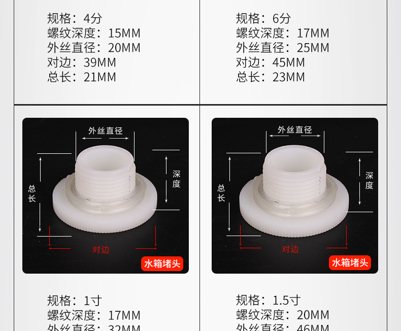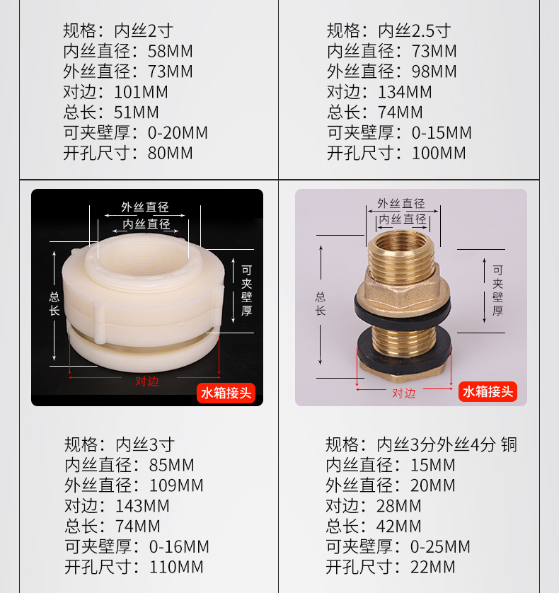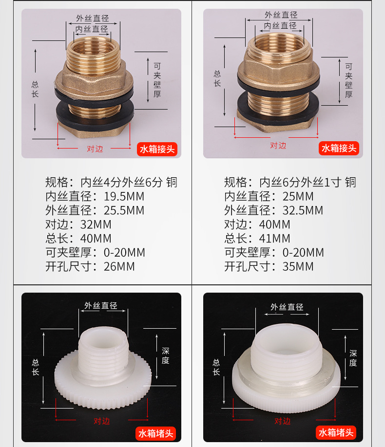 | Especificaciones del producto | 4 puntos de rosca interna conector del tanque de agua con 1 Junta,Conector externo del tanque de agua del hilo de 4 puntos con 1 Junta,Conector del tanque de agua de rosca interna de 6 puntos con 1 Junta,(DN25) conector interno del tanque de agua del hilo de 1 pulgada con 1 Junta,Conector del tanque de agua 4 puntos de cobre (alambre interior 3 puntos de alambre exterior 4 puntos) con 2 juntas,Conector del tanque de agua 6 puntos de cobre (cable interior 4 puntos de cable exterior 6 puntos) con 2 juntas,Conector del tanque de agua 1 pulgada de cobre (cable interno 6 puntos cable externo 1 pulgada) con 2 juntas,(DN32) conector interno del tanque de agua del hilo de 1,2 pulgadas con 1 Junta,(DN40) conector interno del tanque de agua del hilo de 1,5 pulgadas con 1 Junta,(DN50) conector interno del tanque de agua del hilo de 2 pulgadas con 1 Junta,(DN65) conector interno del tanque de agua del hilo de 2,5 pulgadas con 1 Junta,(DN80) conector interno del tanque de agua del hilo de 3 pulgadas con 1 Junta,(DN100) conector interno del tanque de agua del hilo de 4 pulgadas,Tapón del tanque de agua 4 puntos,Tapón del tanque de agua 6 puntos,Enchufe del tanque de agua 1-inch,Enchufe del tanque de agua 1.2-inch,Enchufe del tanque de agua 1.5-inch,Tapón del tanque de agua de 2 pulgadas,4 puntos junta del conector del tanque de agua del hilo interno,6 puntos de rosca interna conector del tanque de agua Junta,Junta interna del conector del tanque de agua del hilo de 1 pulgada,1,5/1,2 pulgadas rosca interna Junta conector del tanque de agua,Junta interna del conector del tanque de agua del hilo 2-inch |