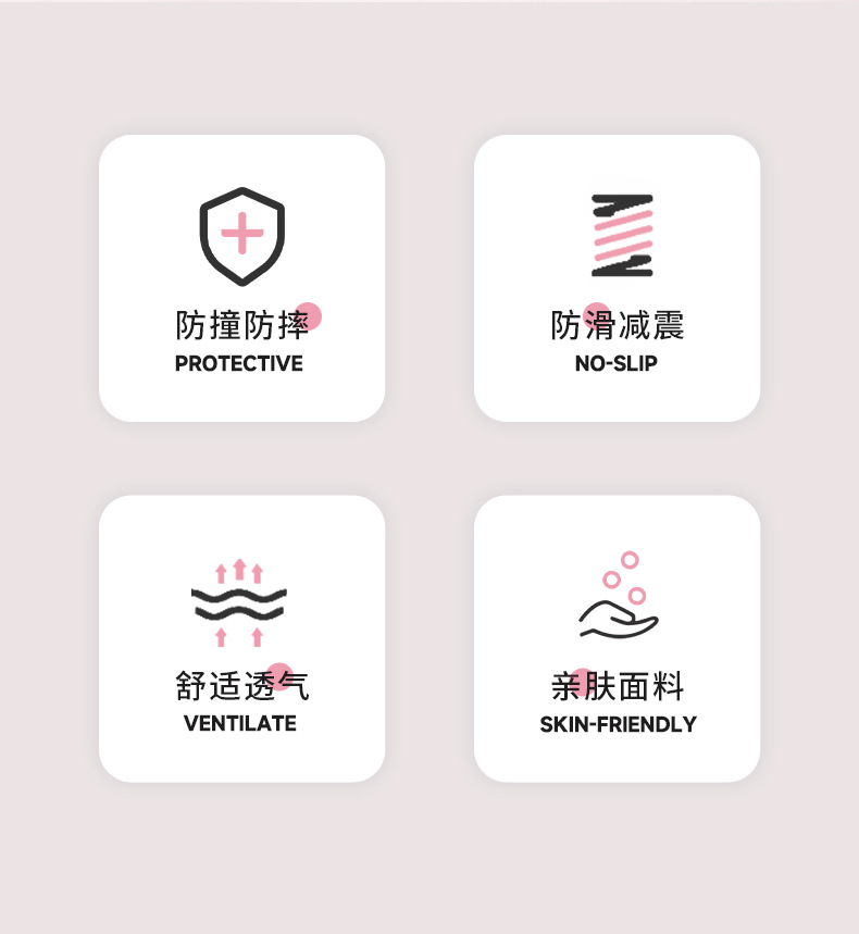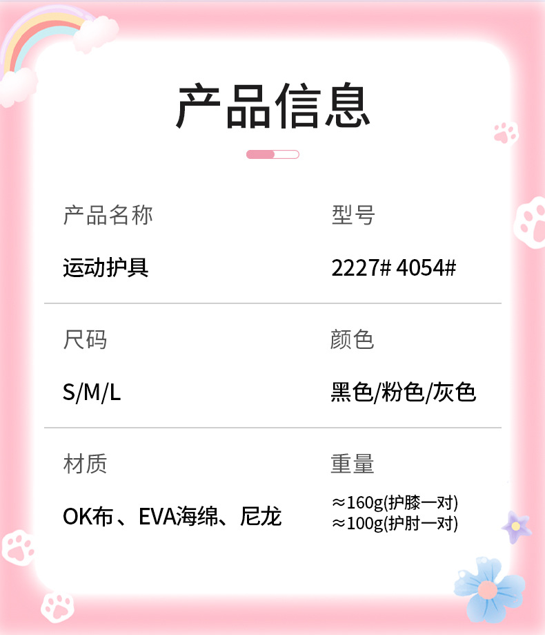 | Color | Rodillera - rosa, rodillera - gris, rodillera - negro, codo - rosa, codo - gris, codo - negro |
