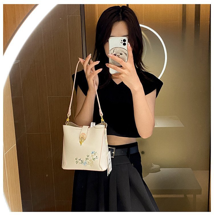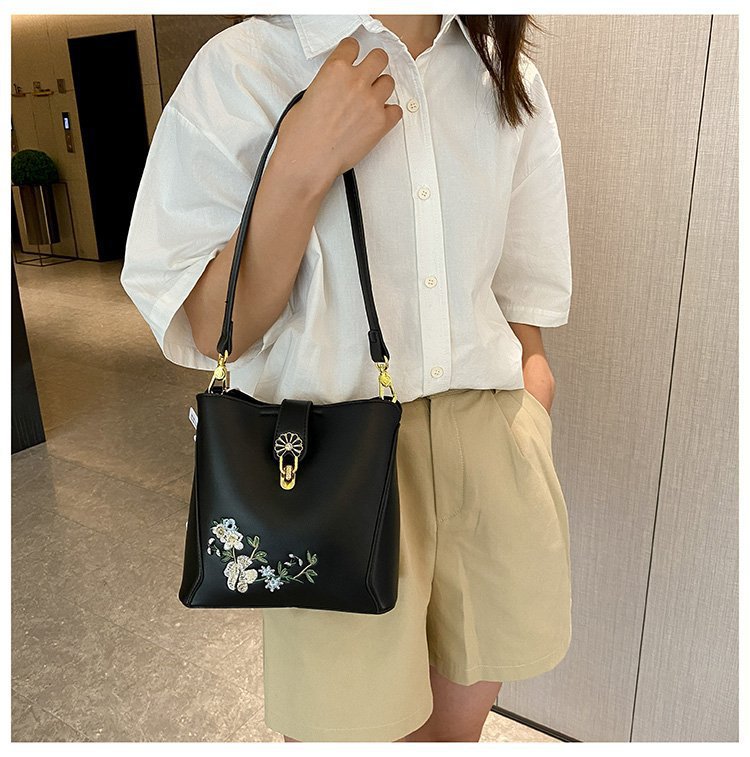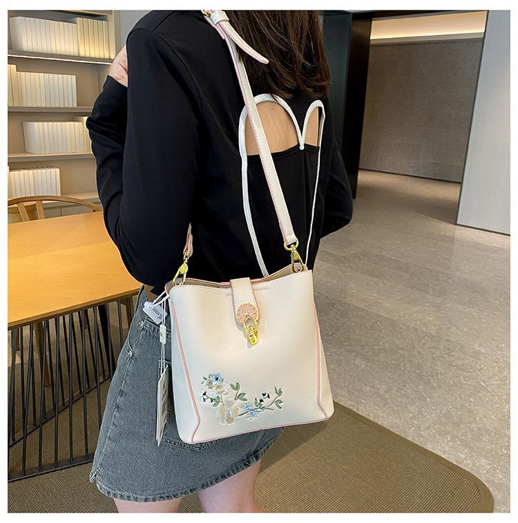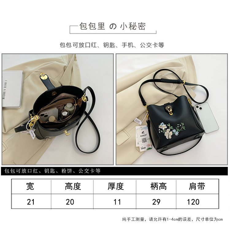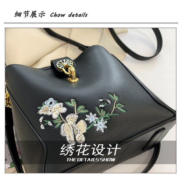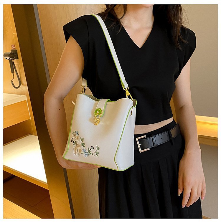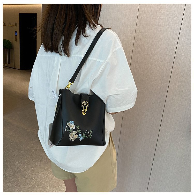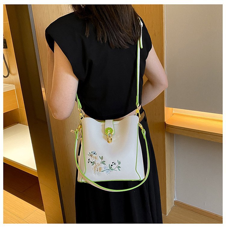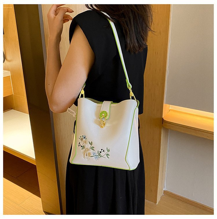 Guofeng bolsa de hombro para mujeres de gran capacidad bolsa de cubo de agua China bordado de color contrastante ocio viaje de otoño nueva bolsa para mujeres