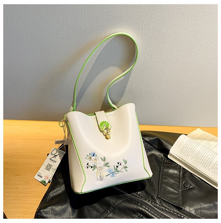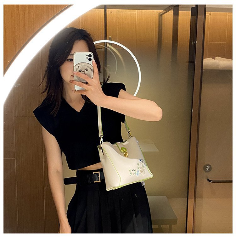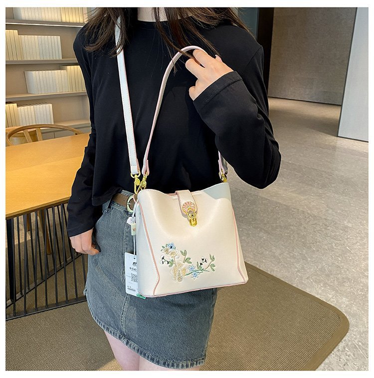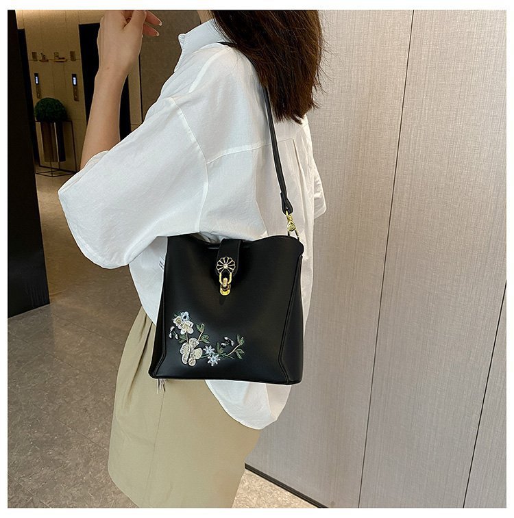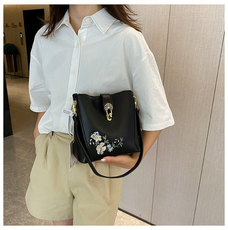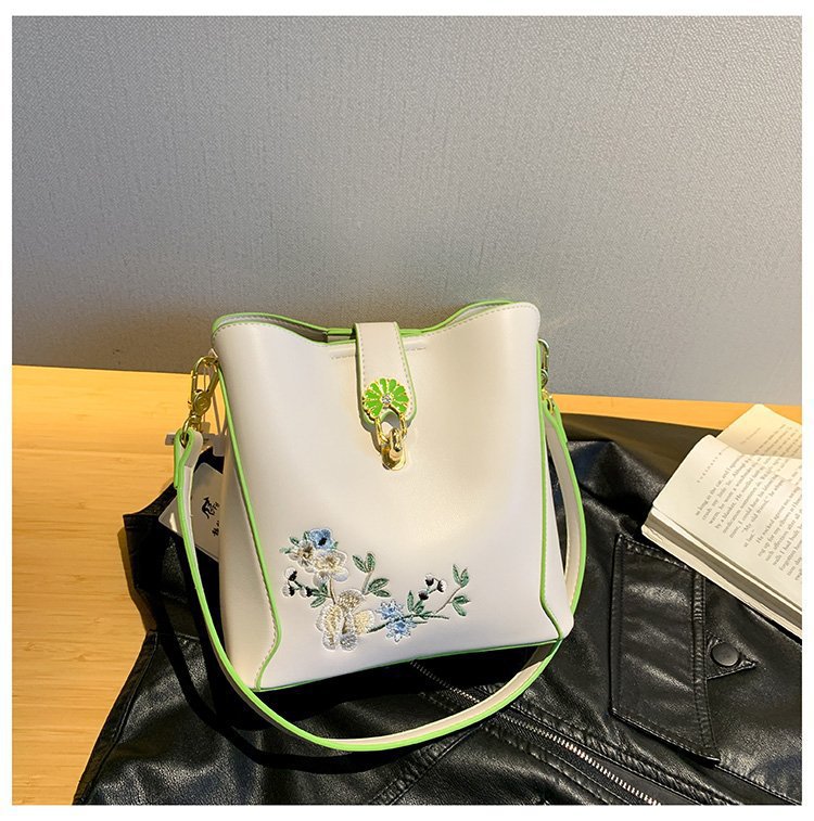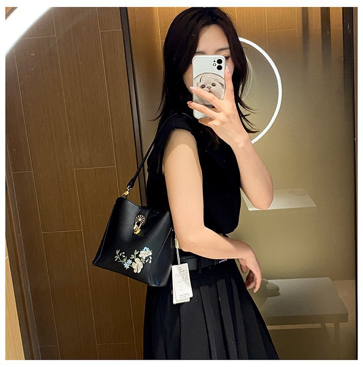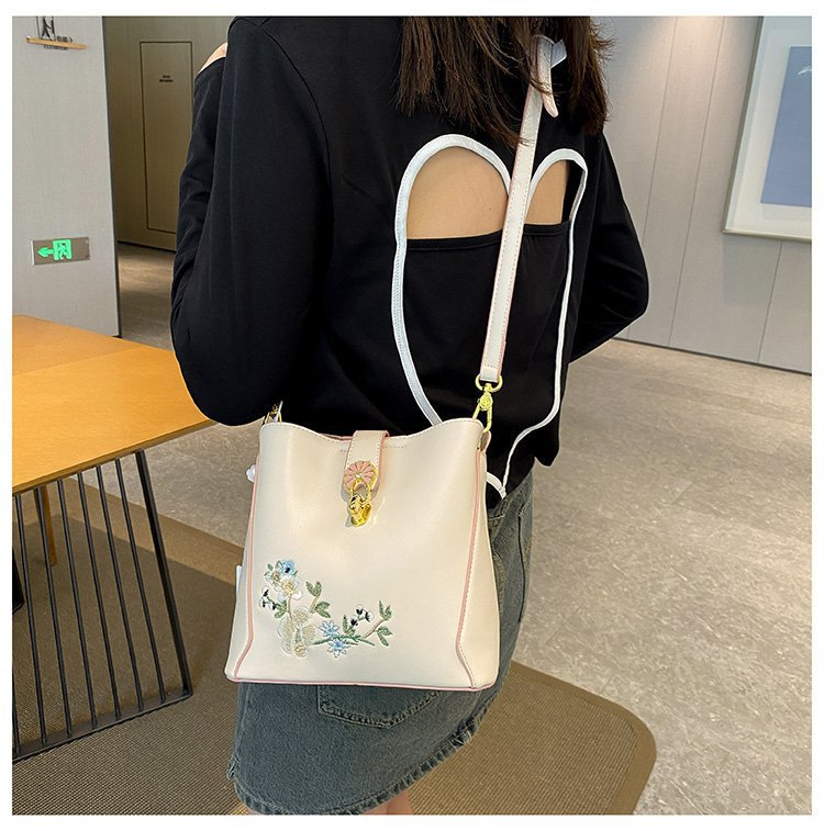 Guofeng bolsa de hombro para mujeres de gran capacidad bolsa de cubo de agua China bordado de color contrastante ocio viaje de otoño nueva bolsa para mujeres
