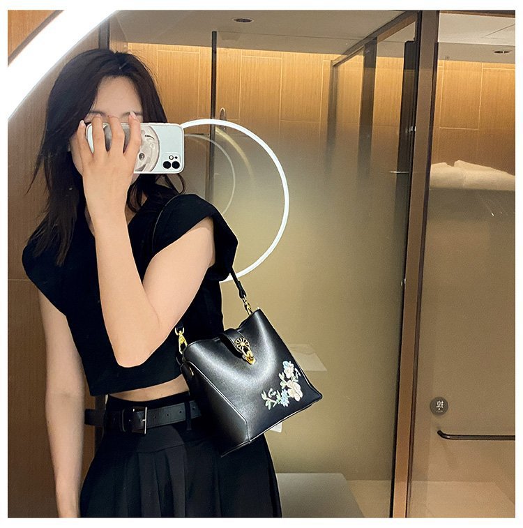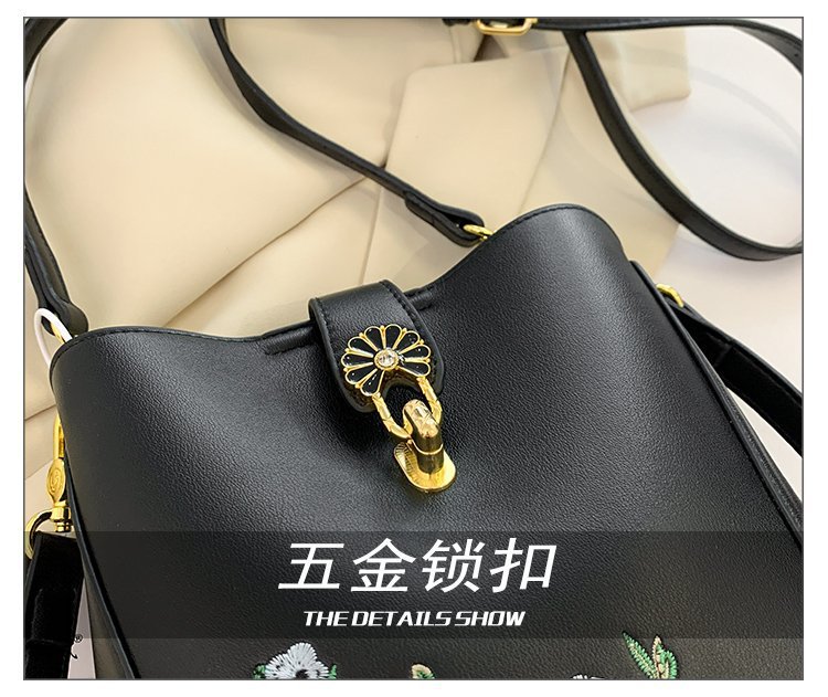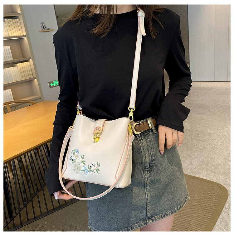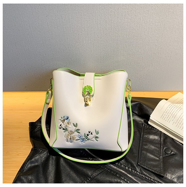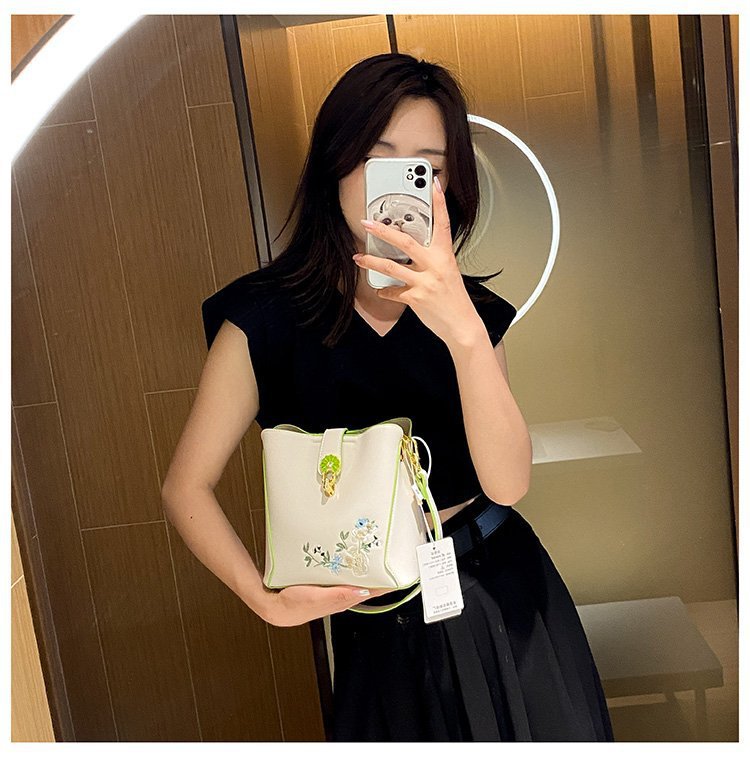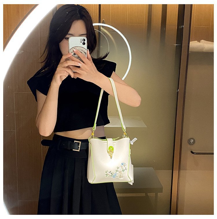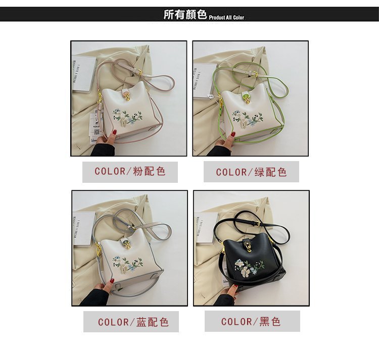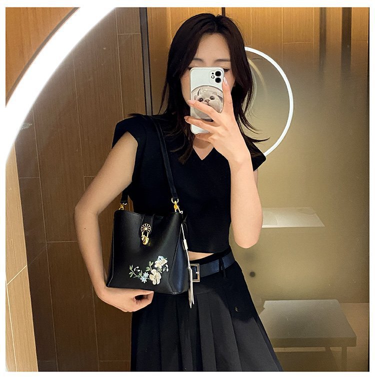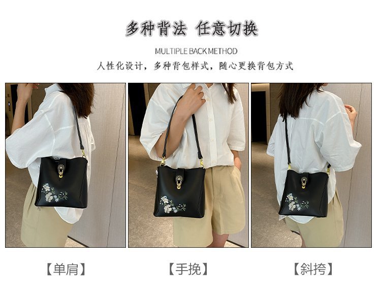 Guofeng bolsa de hombro para mujeres de gran capacidad bolsa de cubo de agua China bordado de color contrastante ocio viaje de otoño nueva bolsa para mujeres