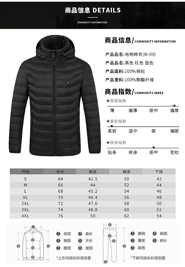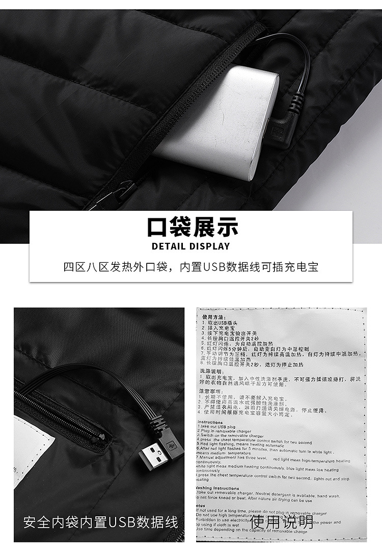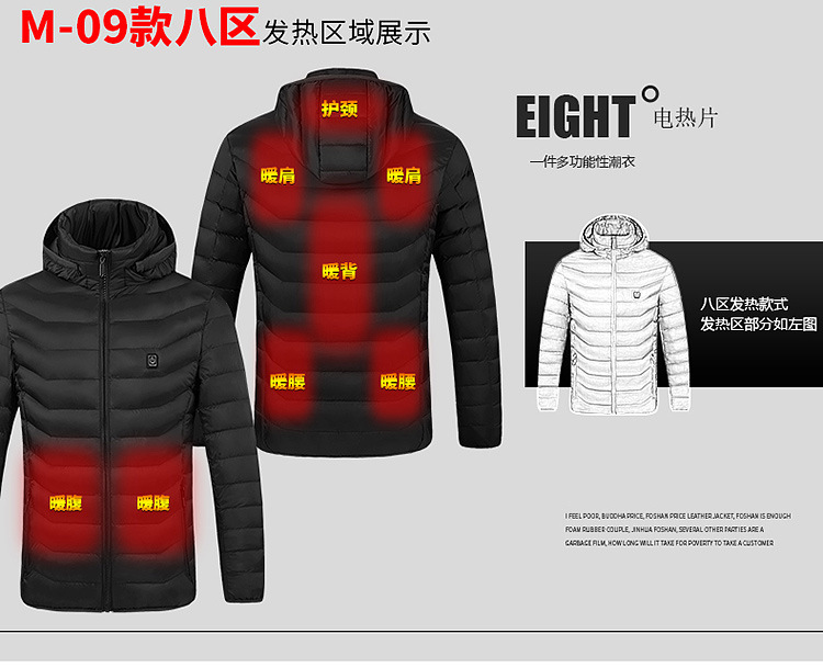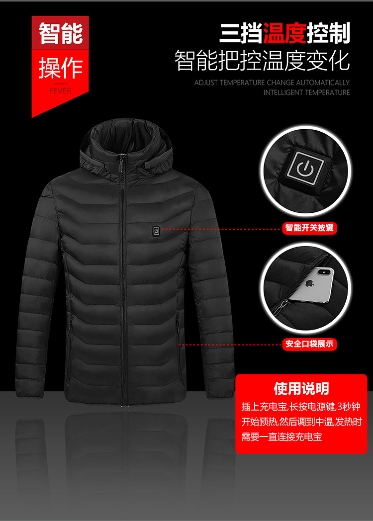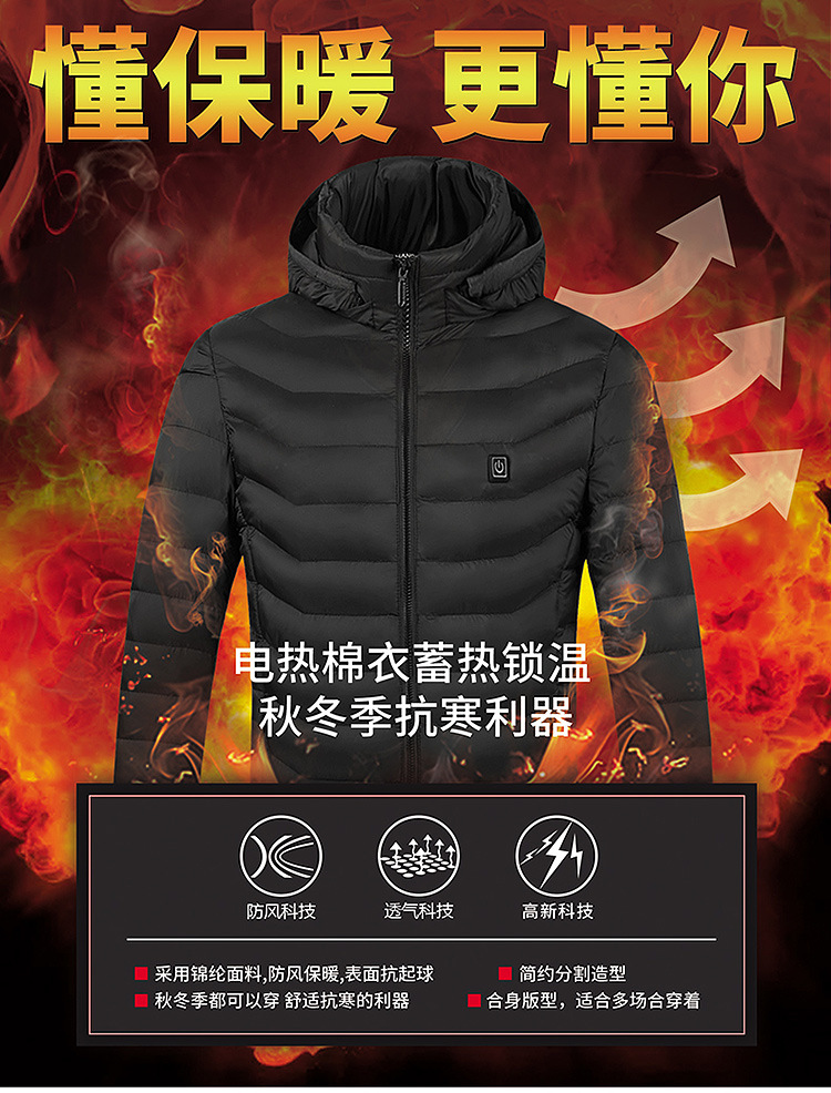 Venta caliente de la zona inteligente 9 de calefacción de carga ropa acolchada de algodón ropa de calefacción de los hombres con capucha ropa acolchada de algodón ropa de calefacción transfronteriza al por mayor