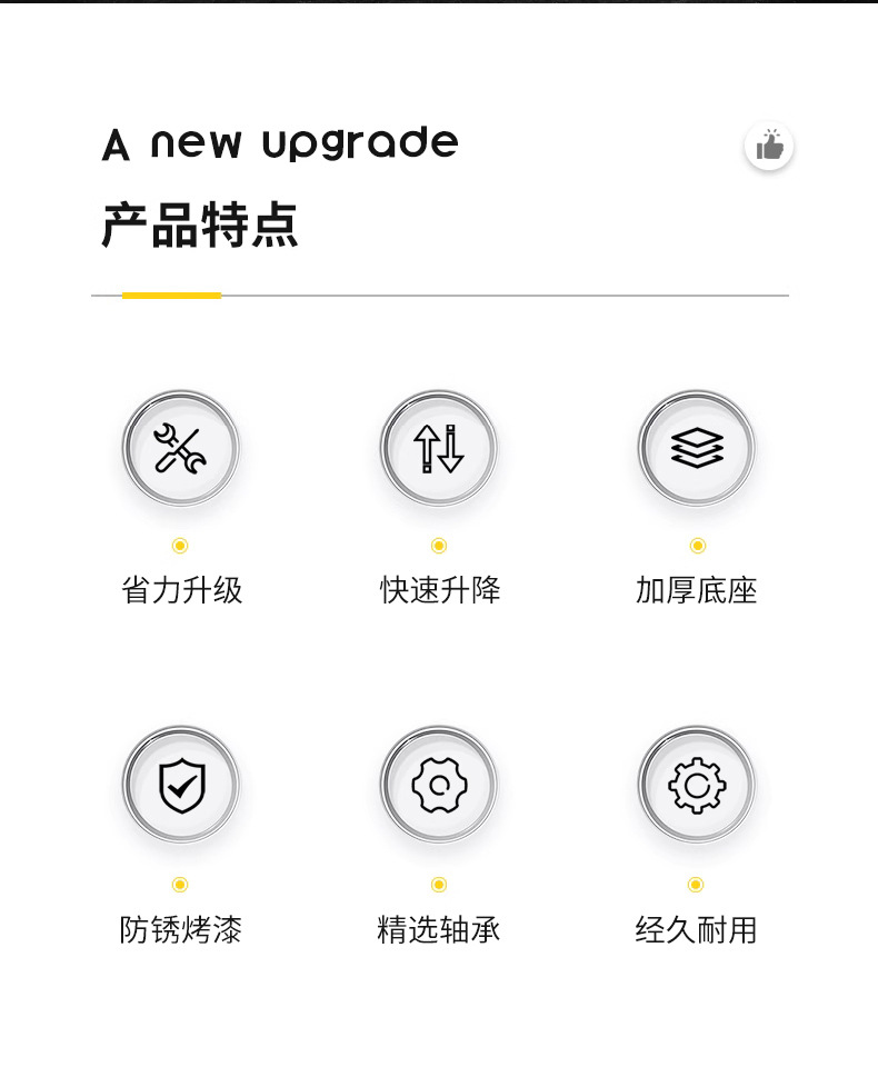 | Modelo | Modelo de 1 tonelada que ahorra mano de obra [sin balancín],Modelo de 1.5 toneladas que ahorra mano de obra [sin balancín].,Modelo reforzado de 1.5 toneladas [sin balancín],Versión mejorada de 2 toneladas [sin balancín],Modelo reforzado de 2.5 toneladas [sin balancín],Versión mejorada de 3 toneladas [sin balancín],Joystick Estándar,Balancín extendido,Llave de trinquete Jack |