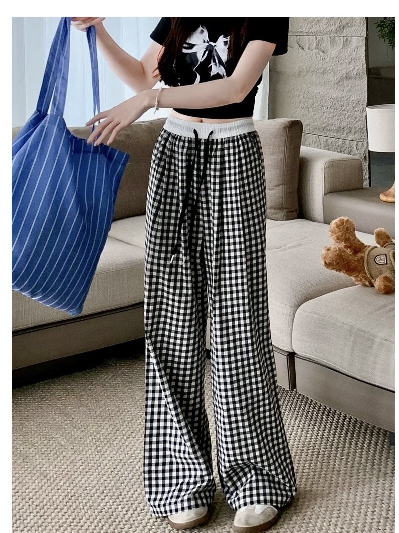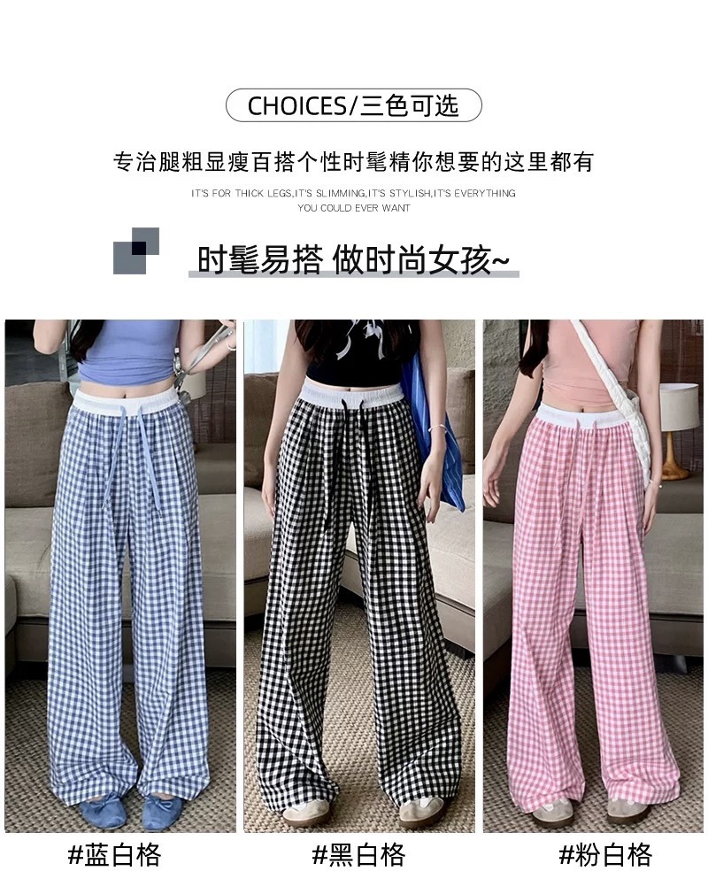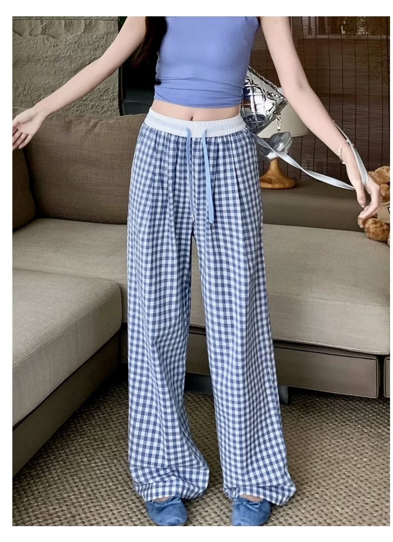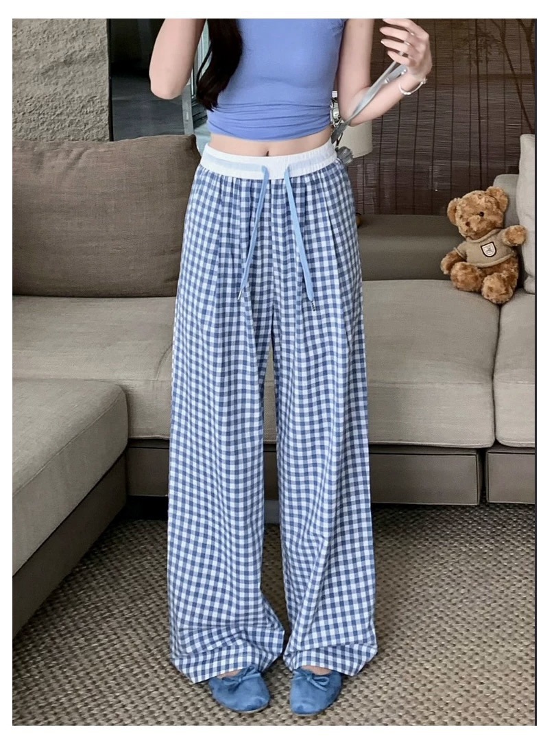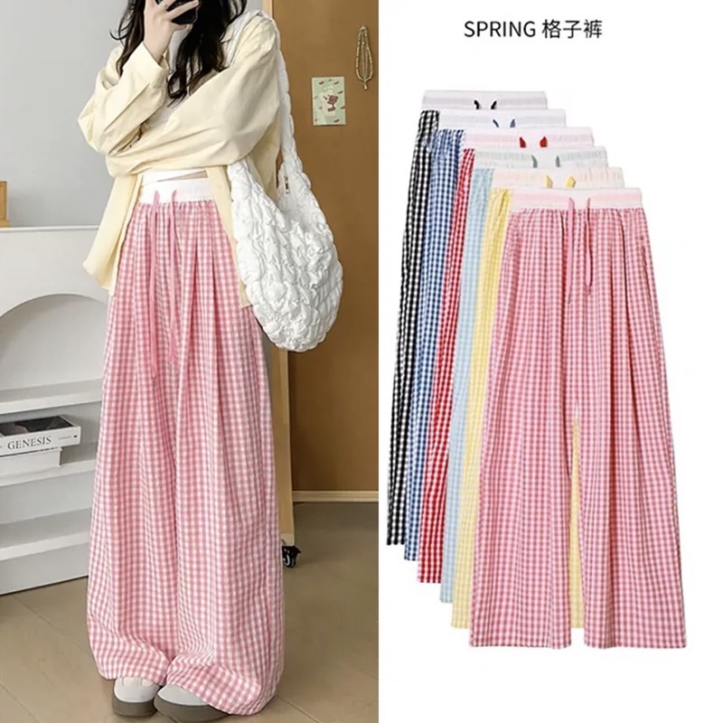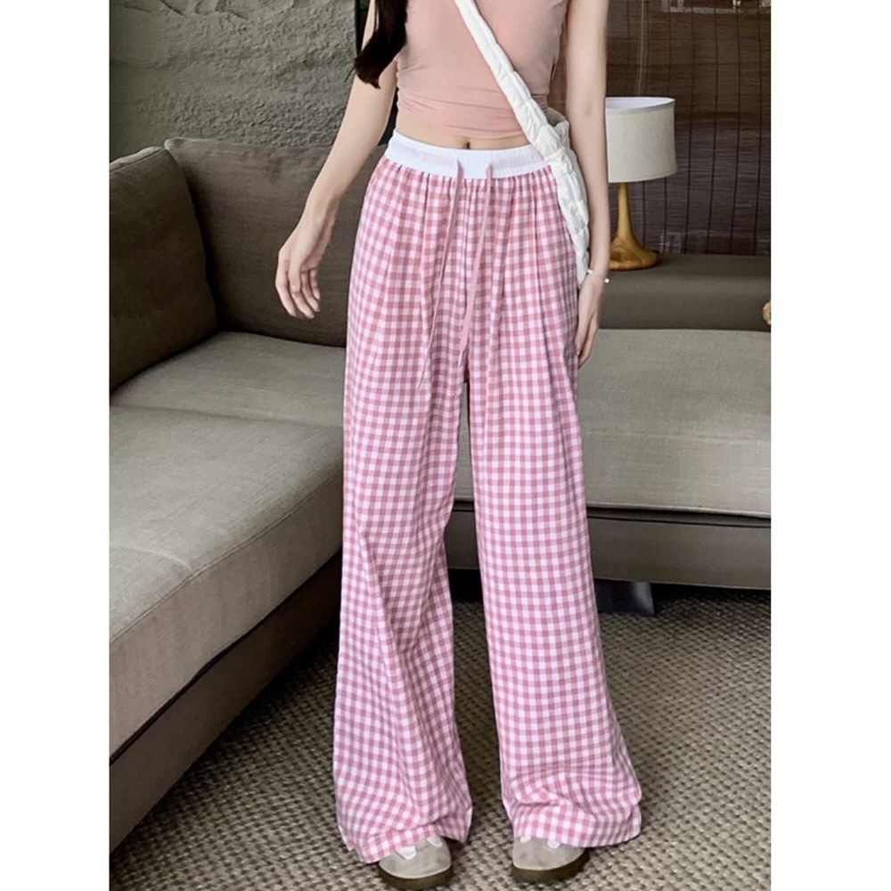 Pantalones a cuadros perezosos de dopamina de color en contraste para mujer, estilo fino de verano, cintura alta, cordón suelto, pantalones anchos de caída rosa casuales
