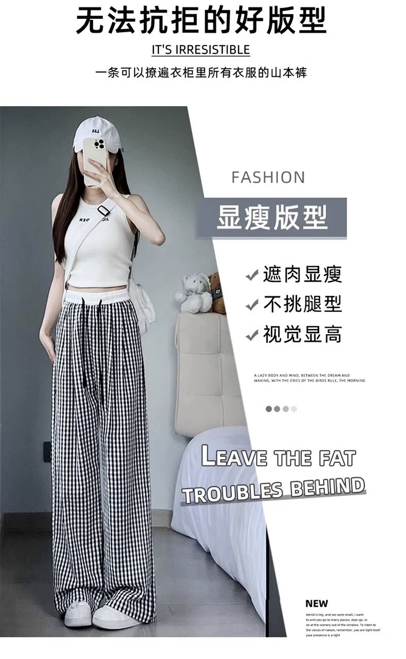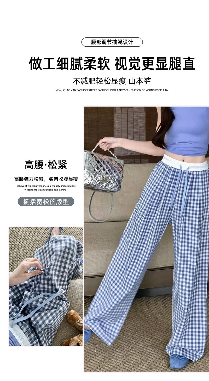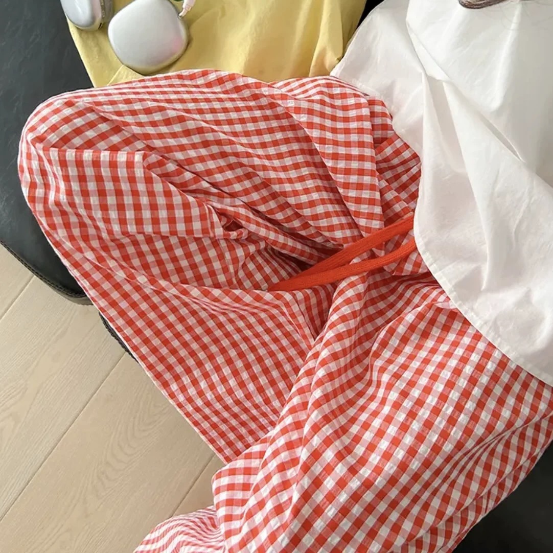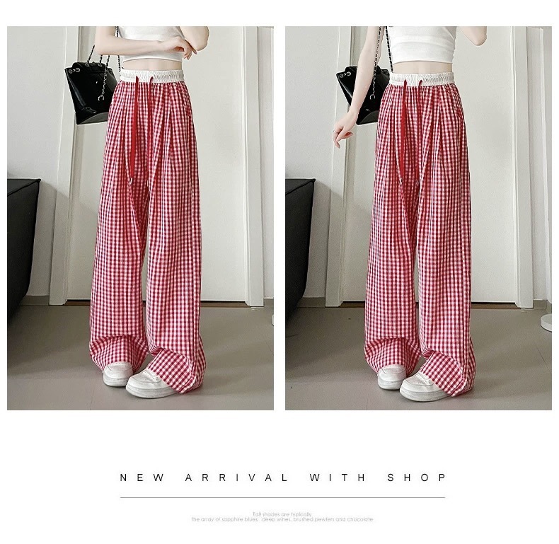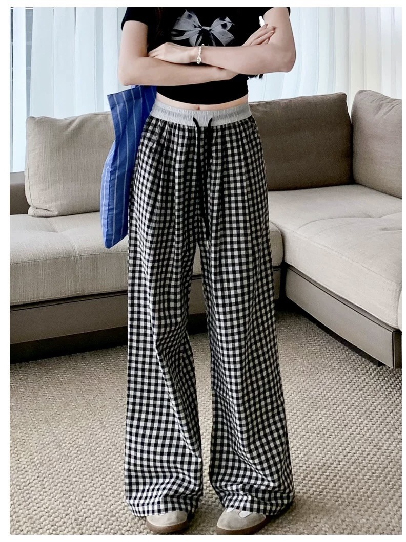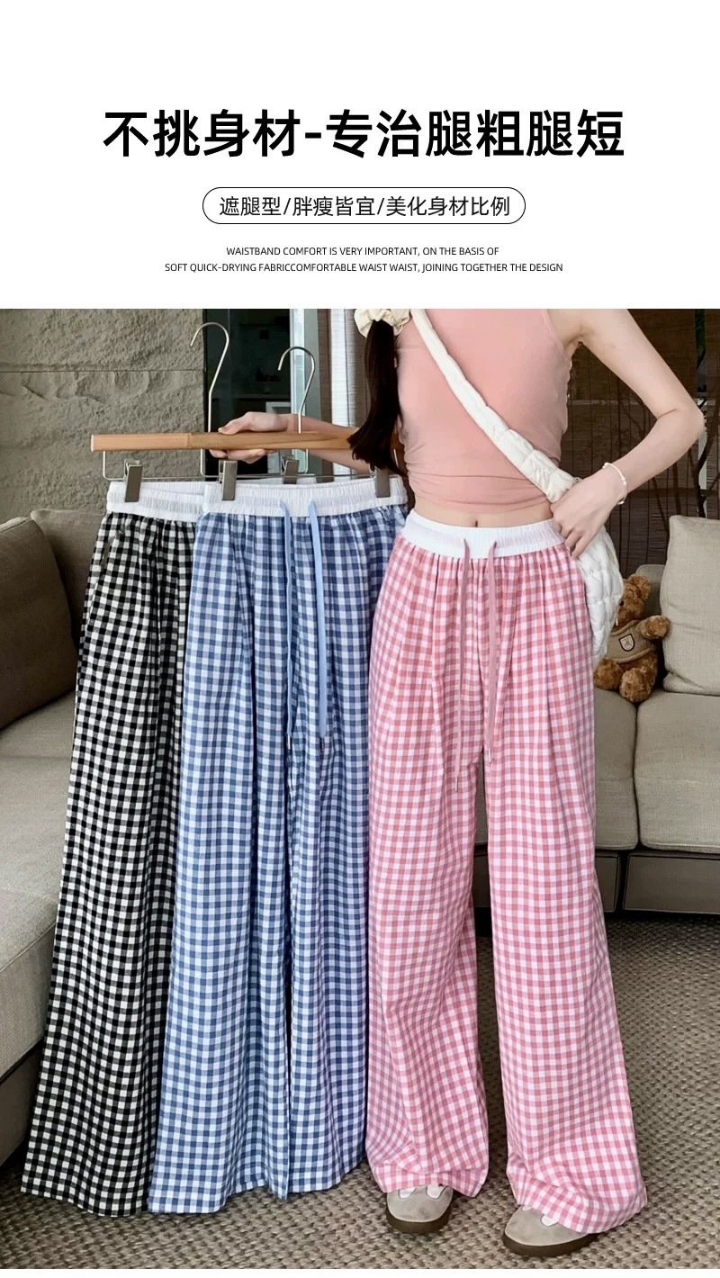 Pantalones a cuadros perezosos de dopamina de color en contraste para mujer, estilo fino de verano, cintura alta, cordón suelto, pantalones anchos de caída rosa casuales