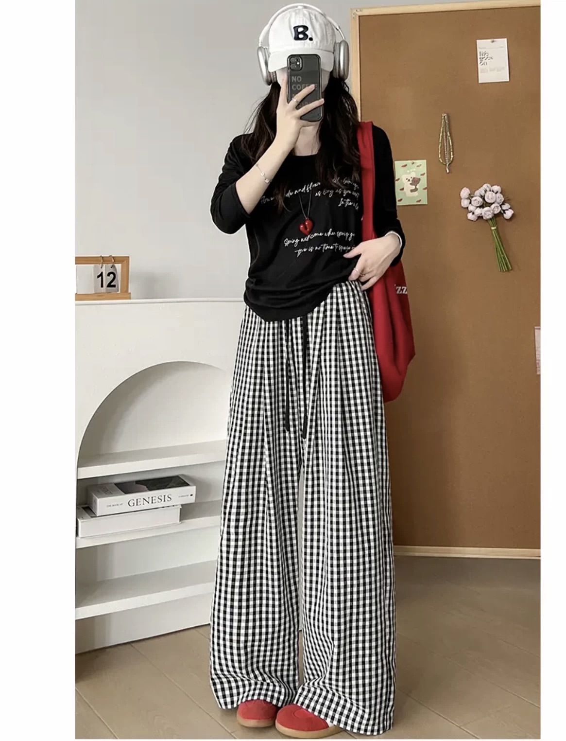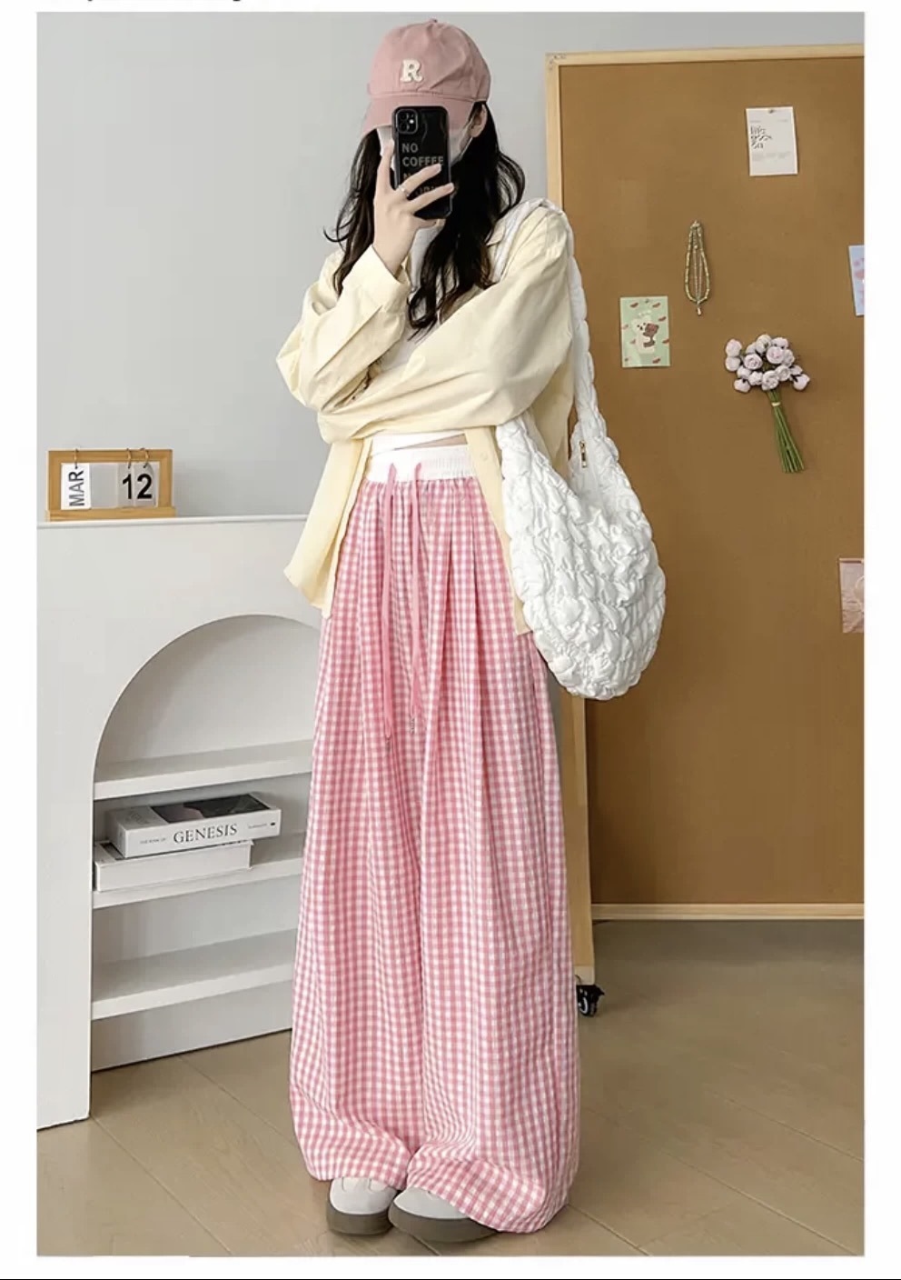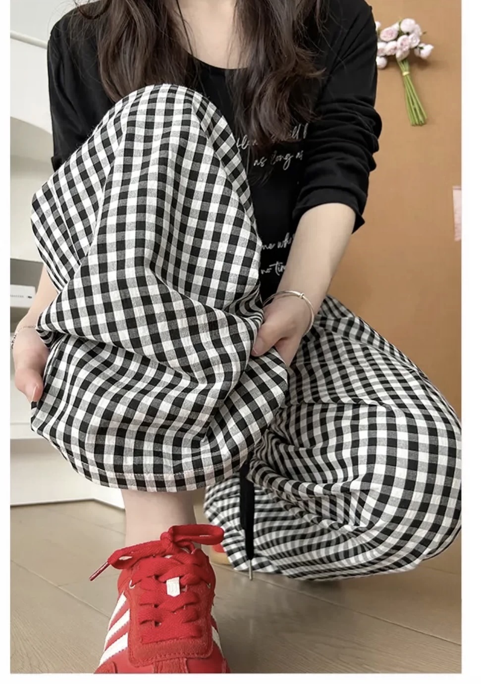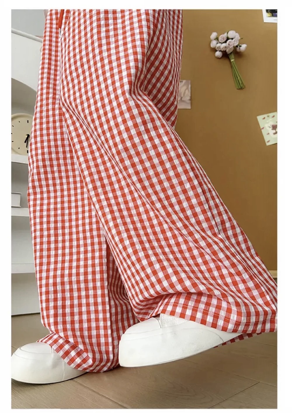 Pantalones a cuadros perezosos de dopamina de color en contraste para mujer, estilo fino de verano, cintura alta, cordón suelto, pantalones anchos de caída rosa casuales