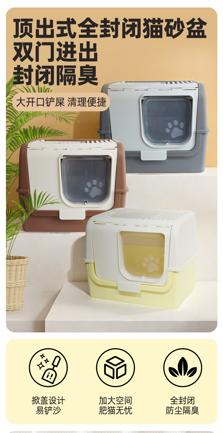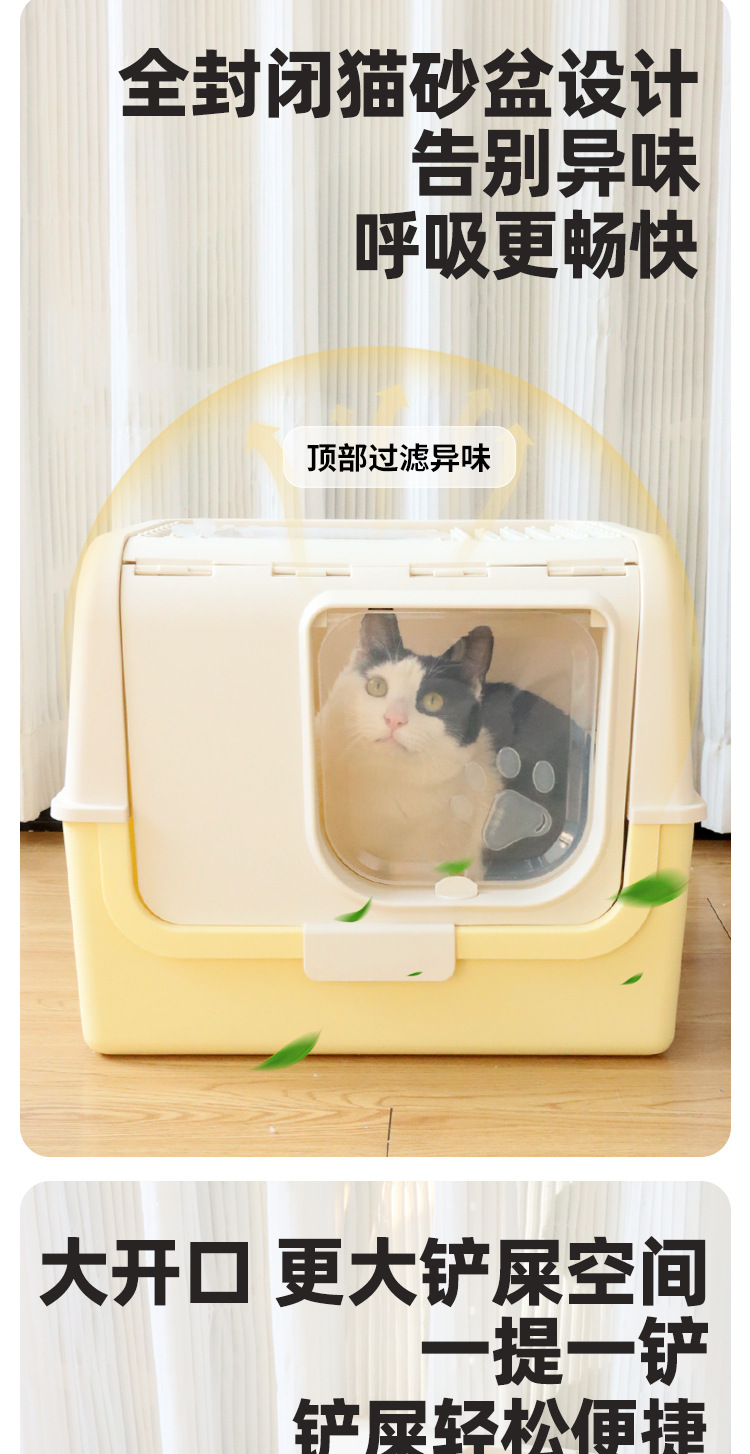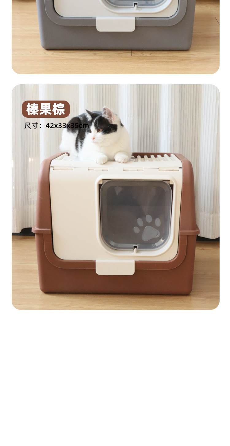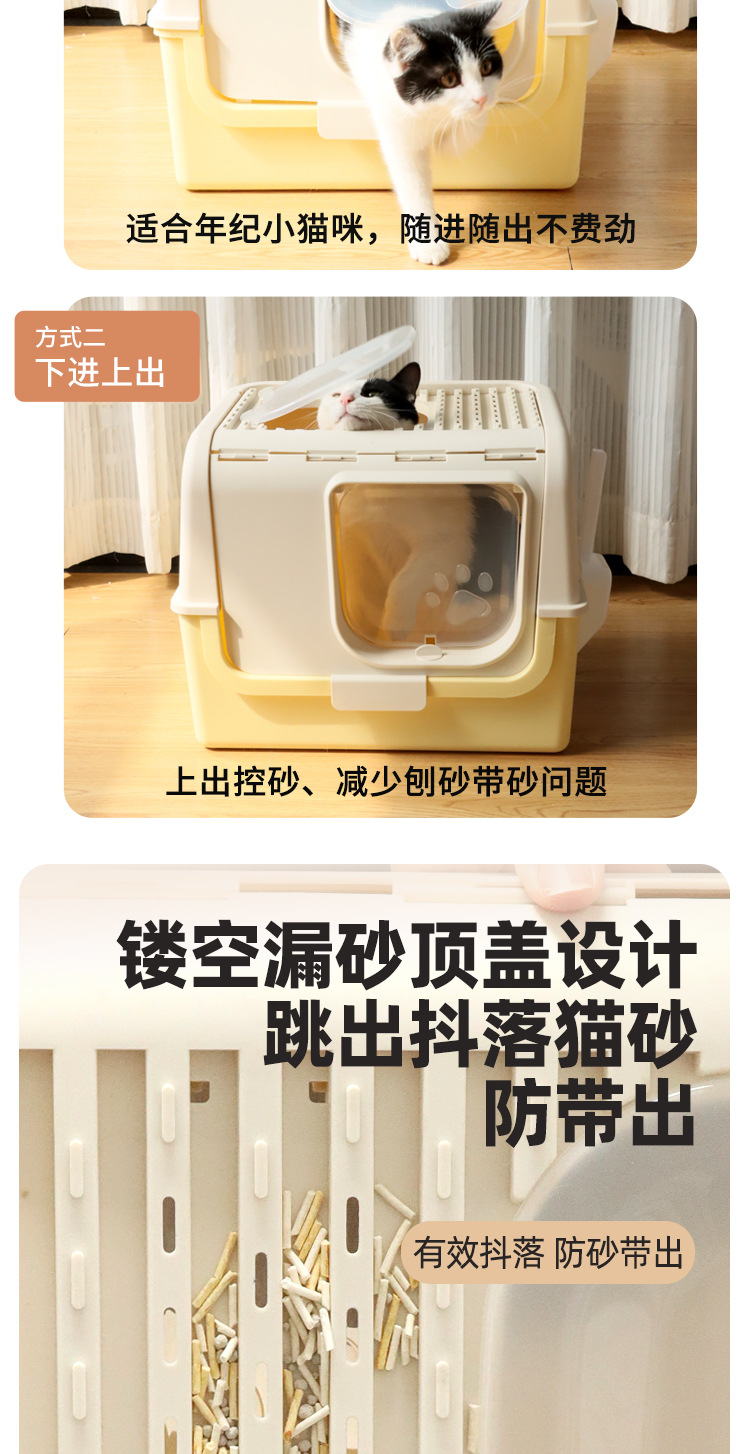 La caja de arena para gatos completamente cerrada es de gran tamaño, a prueba de salpicaduras externas, la entrada superior, la caja de heces para gatos abierta, evita que el inodoro para gatos se desodore
