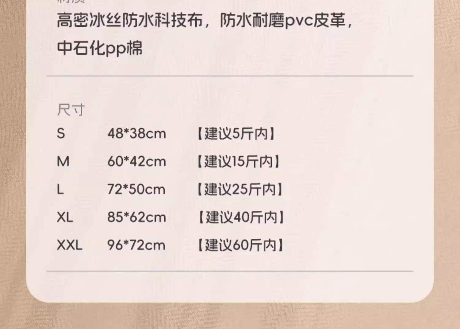 | Colores | Código S recomendado dentro de 5 kg (48*38cm),Código M recomendado dentro de 15 kg (60*42cm),Código L recomendado dentro de 25 kg (72*50cm),Código XL recomendado dentro de 40 kg (85*62cm),Código XXL recomendado dentro de 60 kg (96*72cm) |