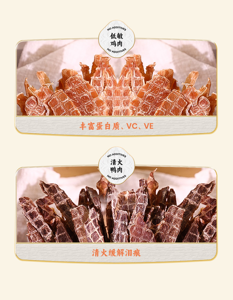 | Especificaciones | 0 Añadir pechuga de pollo seca 50g,0 Añadir pato seco 50g,Yema de huevo hígado de pollo en rodajas de pollo 80g,Rodajas de pato Sydney wolfberry 80g |