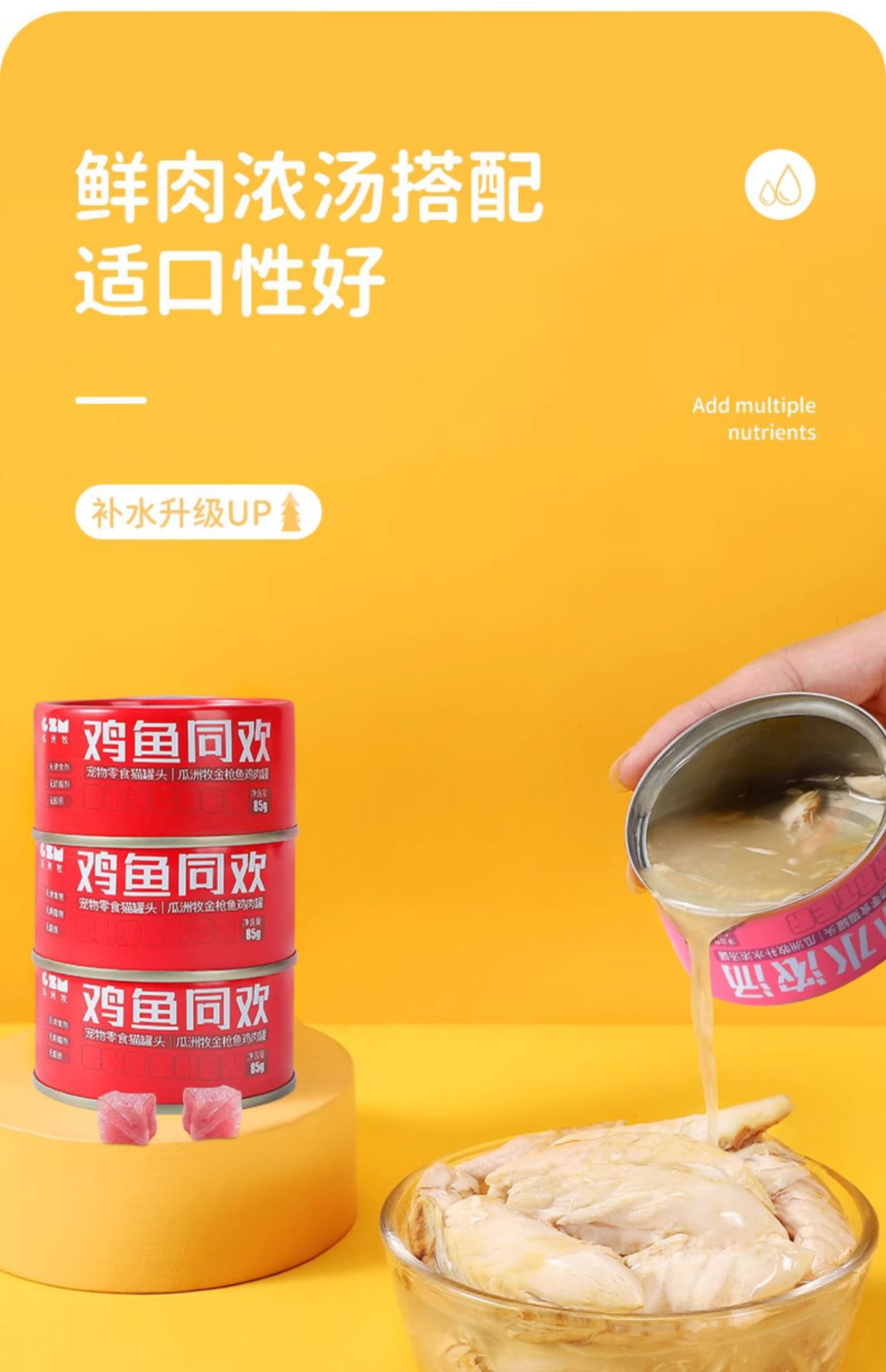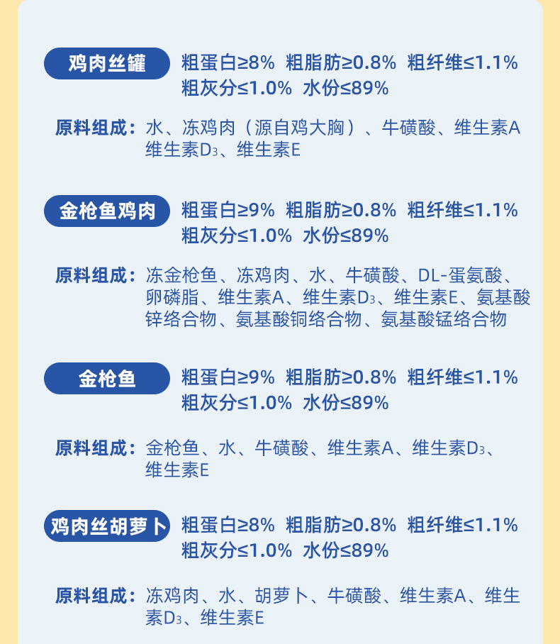 | Sabor | Tarro de sopa hidratante 85g * 5 latas,Tarro de sopa hidratante 85g * 6 latas,Pollo desmenuzado Zanahoria 85g * 6 latas,Latas de yema de huevo de krill de pollo 85g * 6 latas,Latas de calabaza de pollo con leche de coco 85g * 6 latas,2 latas de pollo desmenuzado, 2 latas de pollo desmenuzado, 2 latas de pollo con atún,Atún 3 latas de pollo atún 3 latas de pollo desmenuzado 6 latas.,Lata pura de cerdo desmenuzado con sabor a pollo 85g * 12 latas [0 pegamento 0 señuelo 0 lago],Mezcla de 4 sabores: un total de 85g * 24 latas [hidratación y engorde],Mezcla de 4 sabores 85g * 24 latas [cabello hermoso y cabello brillante],Tarro de sopa hidratante 85g * 1 lata,Sabor mixto [versión de caldo mejorada] 170g/12 latas,Pollo de atún [caldo mejorado] 170g/12 latas,Bonito de atún [versión de caldo mejorada] 170g/12 latas,Atún morral [versión de caldo mejorada] 170g/12 latas,Camarones de atún [caldo mejorado] 170g/12 latas,Sabor a salmón [versión de caldo mejorada] 170g/12 latas,Carne de atún y cangrejo [versión de caldo mejorada] 170g/12 latas |