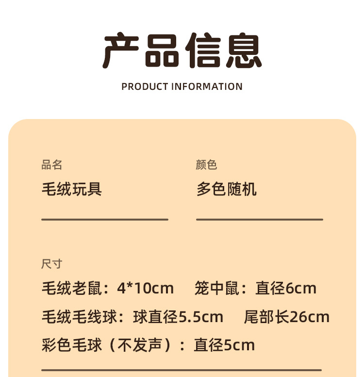 | Colores | Ratón de felpa de unos 10cm,Bola elástica de aproximadamente 5,5 CM,Rata en jaula unos 6cm,Bolas de lana de aproximadamente 6cm |