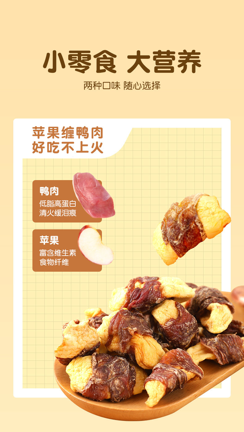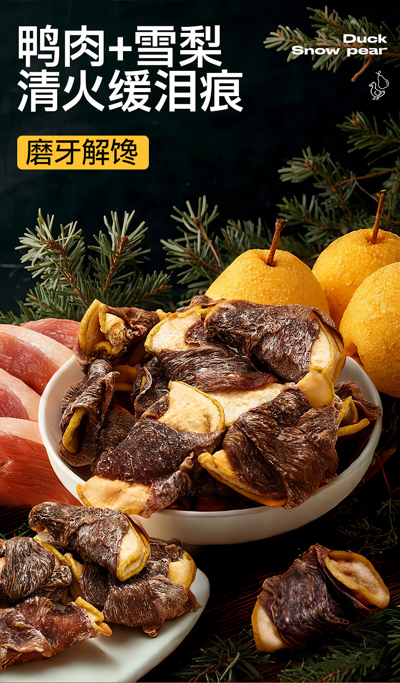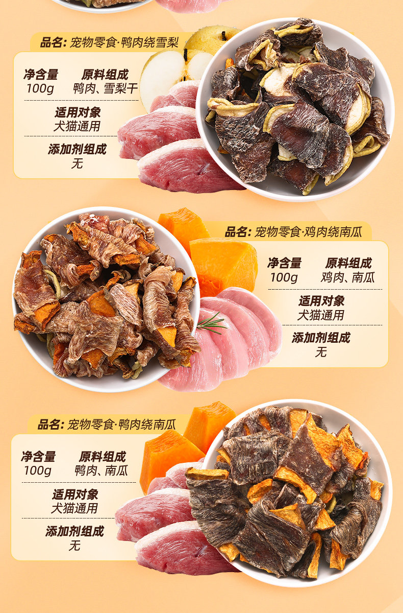 | Especificaciones | 100g de carne de pato envuelta en Sydney (reducir las lágrimas, eliminar el calor y eliminar el fuego),Pato envuelto en manzana 100g (suplemento vitamínico),Pollo alrededor de coco 80g (nutritivo),Pollo alrededor de la col 50g (comida equilibrada) |