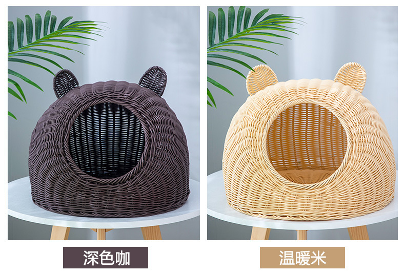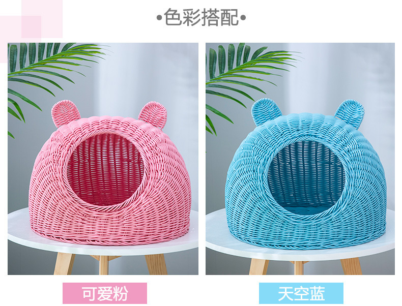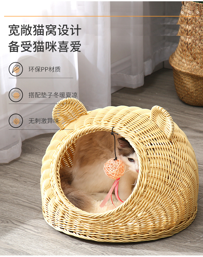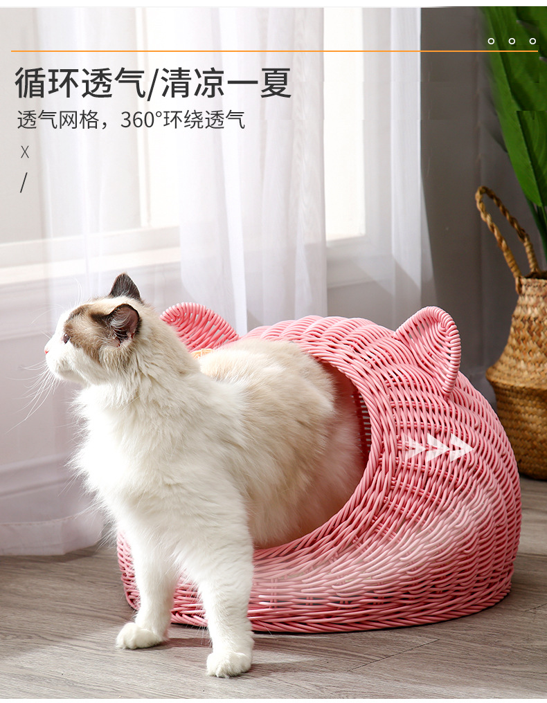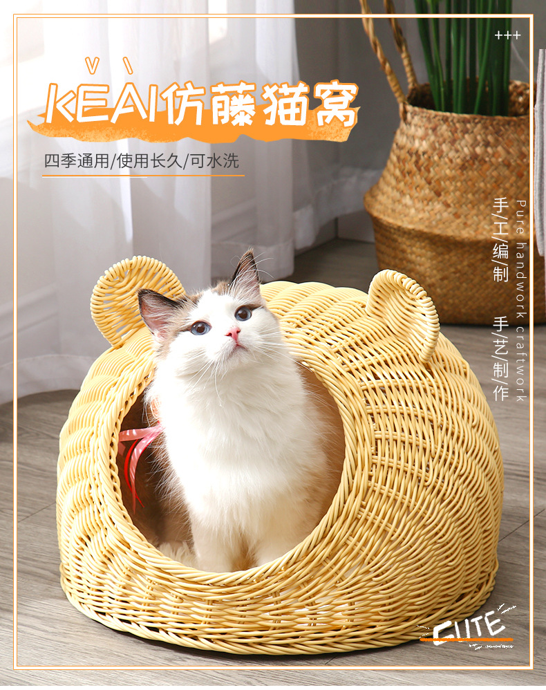 Nido de gato de ratán de imitación de pelo de una pieza lavable, nido de ratán de verano universal de cuatro estaciones, nido para mascotas transpirable semicerrado