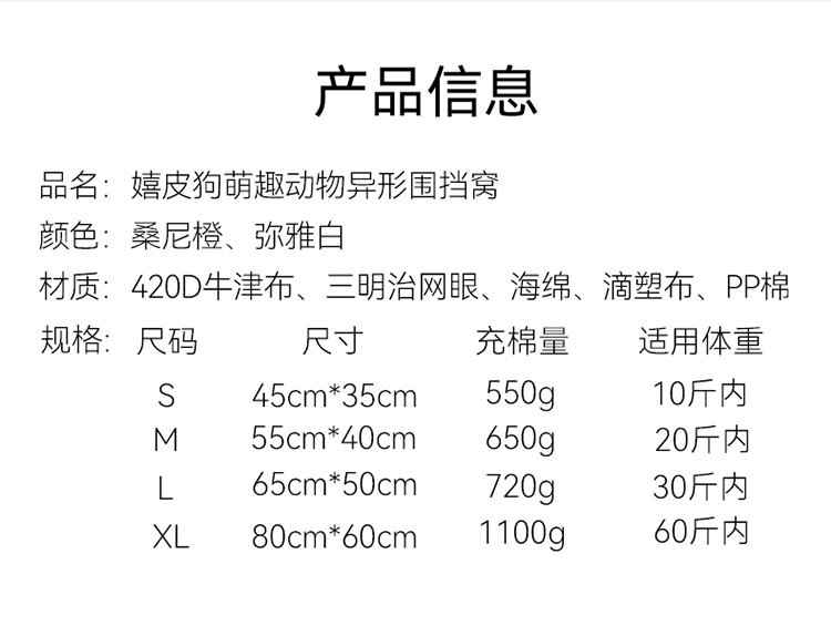| Colores | S (peso recomendado dentro de 5 kg),M (peso recomendado dentro de los 12 kg),L (peso recomendado dentro de los 20 kg),XL (peso recomendado dentro de 40 kg) |