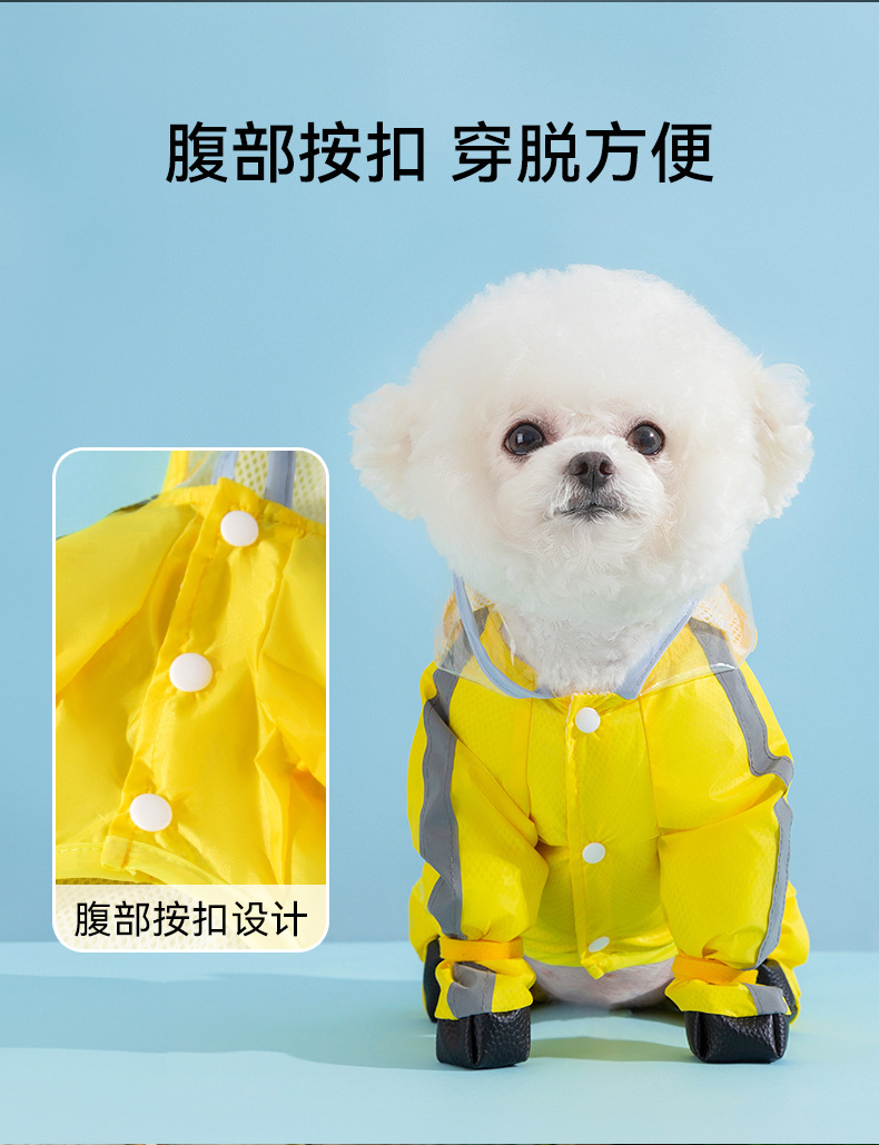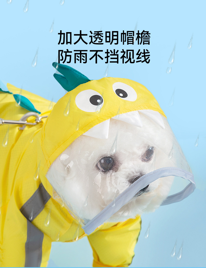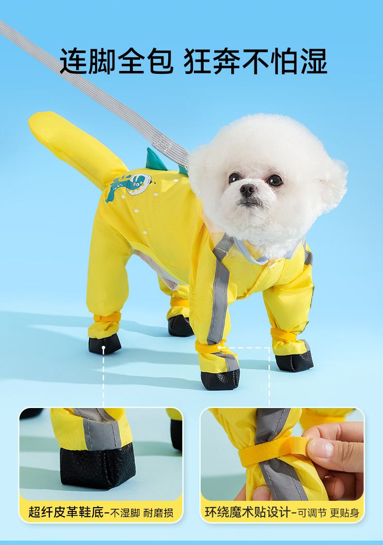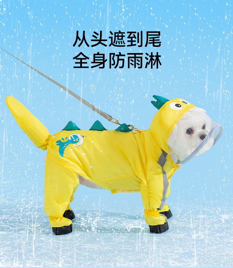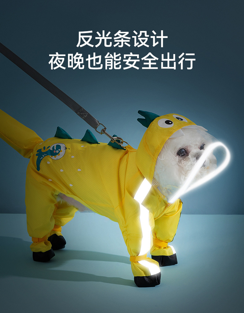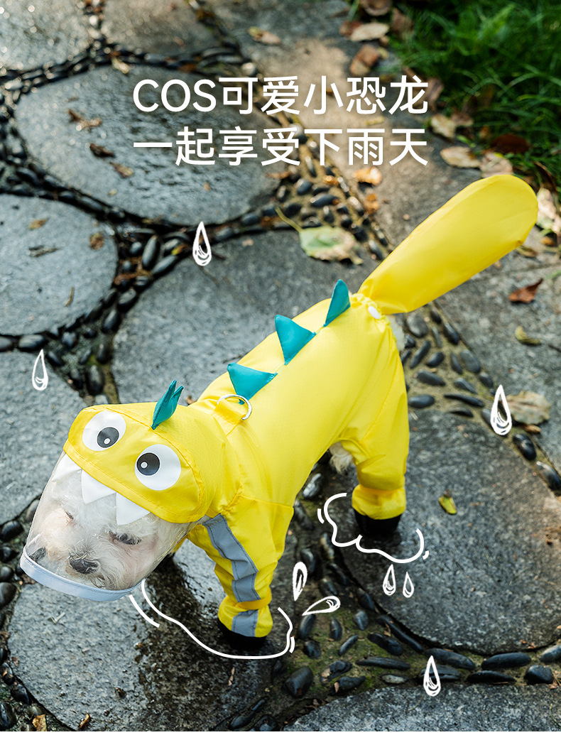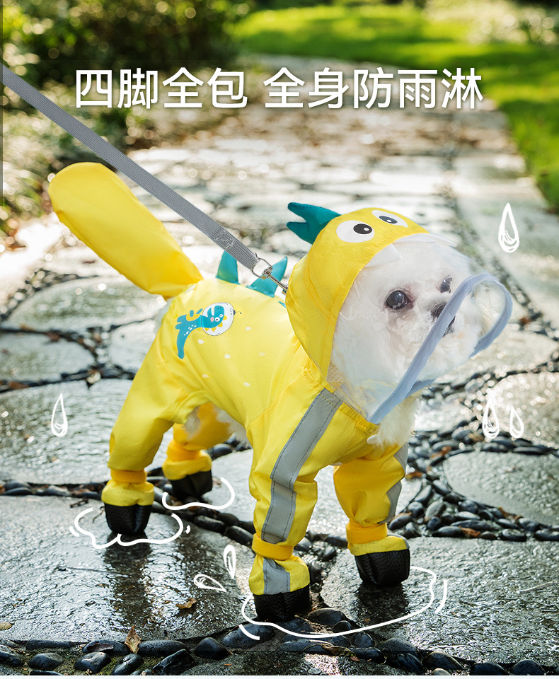 Perro de cuatro patas todo incluido pequeño dinosaurio con tracción impermeable con cola impermeable poncho de peluche ropa para mascotas