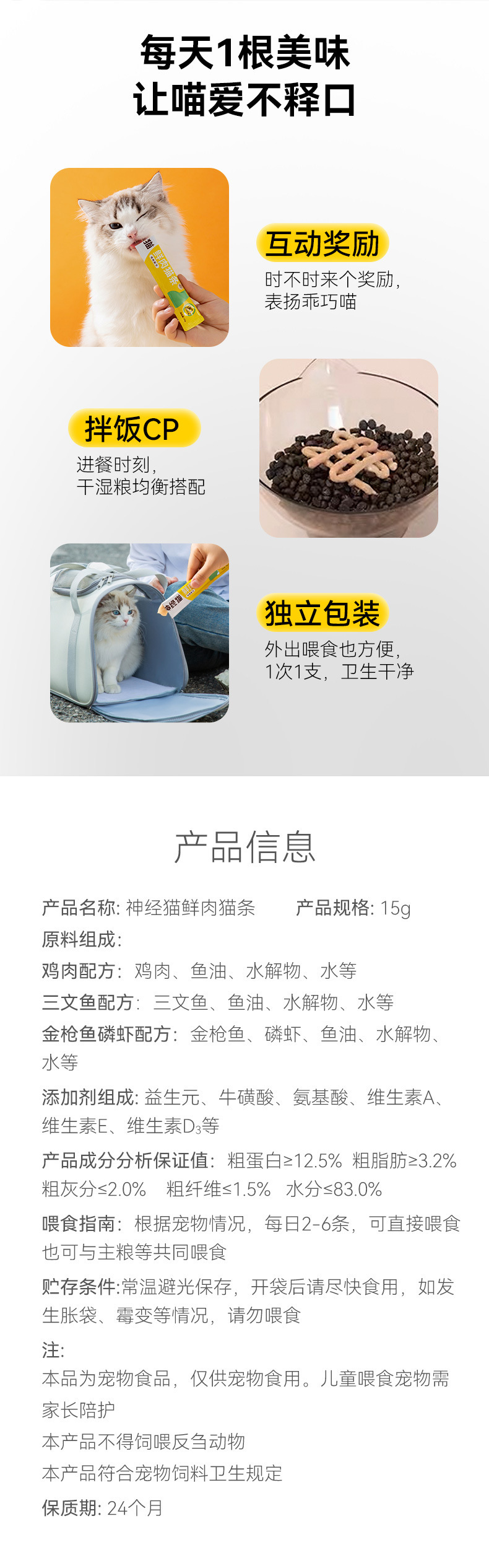 | Sabor | El contenido de carne de pollo es del 65% = 15 gramos * 30 piezas,Sabor a salmón 65% de carne = 15 gramos * 30 piezas,Sabor a atún y camarón, contenido de carne 65% = 15 gramos * 30 piezas,Sabor a pollo, contenido de carne 90g * 30 piezas,Sabor a salmón con carne 90g * 30 piezas,Sabor a atún y camarón, contenido de carne 90% = 15 gramos * 30 piezas,Sabor de atún y camarón (90% de carne) 5 paquetes (sin embalaje),Sabor a salmón (90% de carne incluida) 5 paquetes (sin embalaje),Pollo (90% de carne incluida) 5 paquetes (sin embalaje),Pollo (90% de carne incluida) 100 barriles,Salmón (90% de carne) 100 barriles,Atún fósforo (90% de carne) 100 barriles,Mezclado (90% de carne) 100 barriles,Sabor a huevas de salmón = 15g * 5 (bolsa),Sabor de huevas de atún = 15g * 5 (bolsa),Sabor a huevas de pescado con columna de vieira = 15g * 5 (bolsa),Sabor a huevas de calamar = 15g * 5 (bolsa),Lactoferrina 15g * 10 tiras,Arándano antocianinas 15g * 10 tiras,Fibra de cebada de las tierras altas 15g * 10,Aceite de pescado de aguas profundas 15g * 10 tiras |