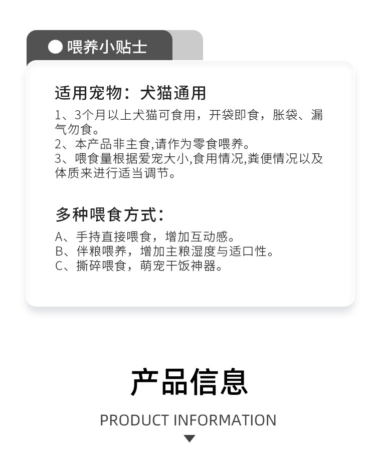 | Sabor | Pechuga de pollo al vapor 40 ± 2g,Paquete de carne de leche gruesa Paquete de carne de leche de cabra 70g,Hígado de pollo al vapor |