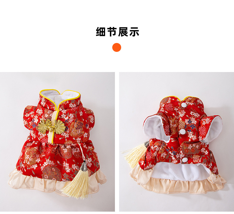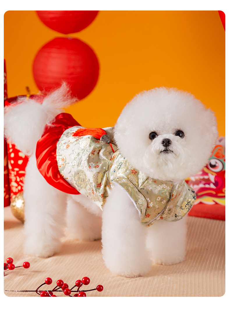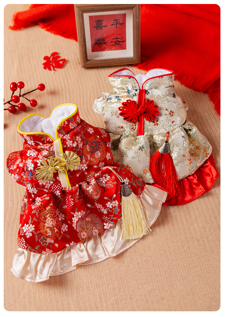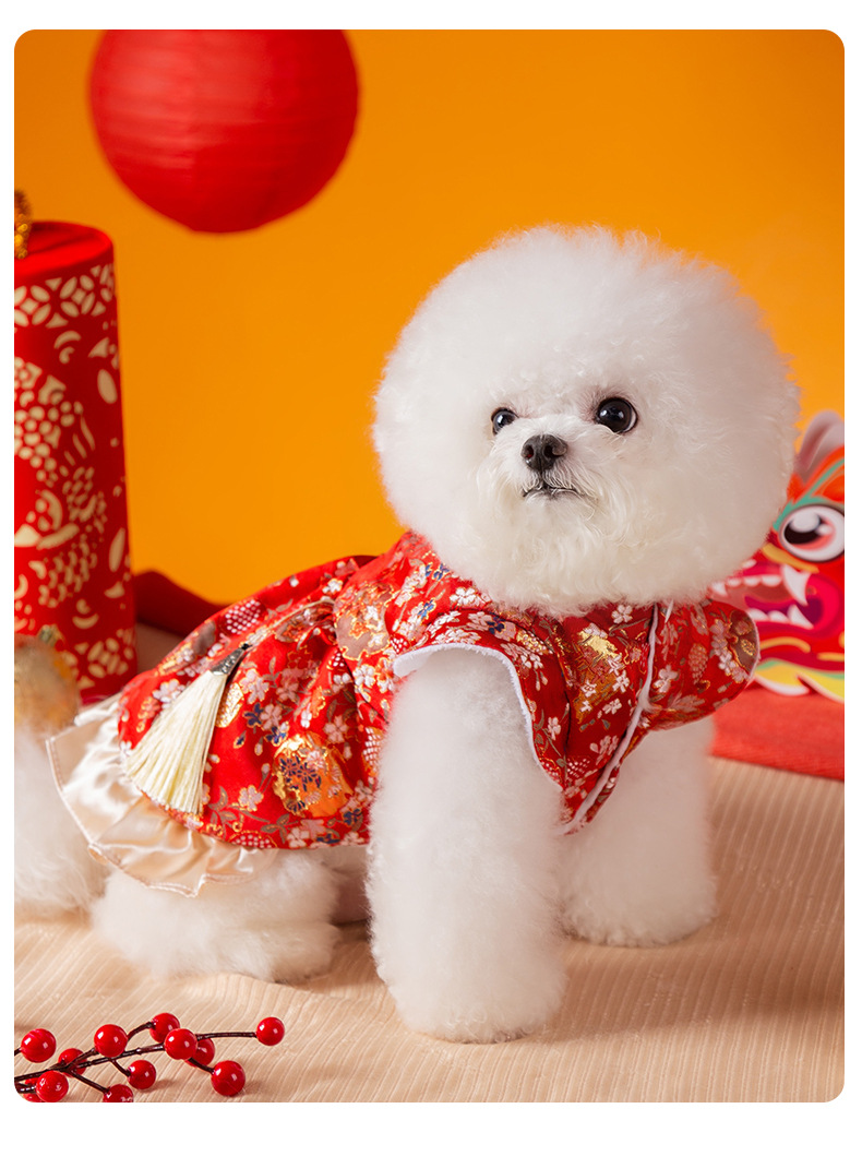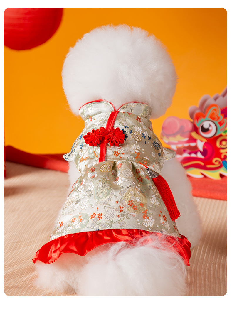 Otoño e invierno perro cien flores borlas vestido de traje Tang gato de dos pies año nuevo festivo año nuevo falda ropa para mascotas