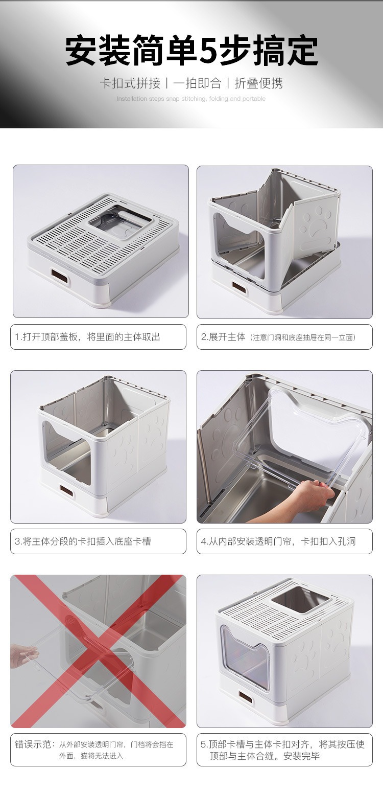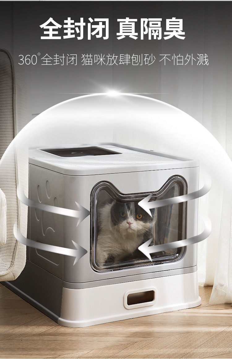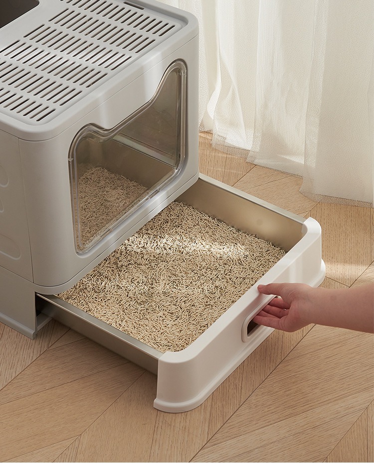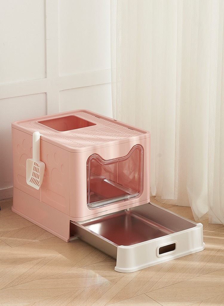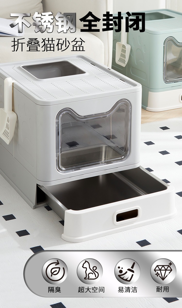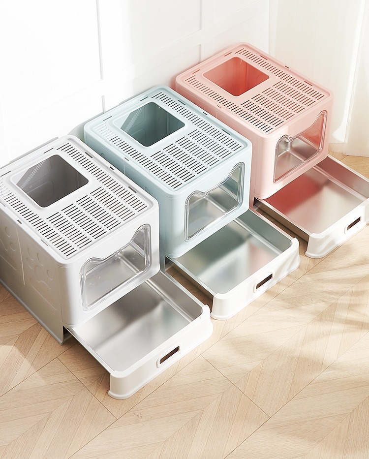 Cuenca de arena de gato de acero inoxidable totalmente cerrada, cubierta frontal anti-derrames transfronterizos tipo cajón super grande inodoro para gatos al por mayor