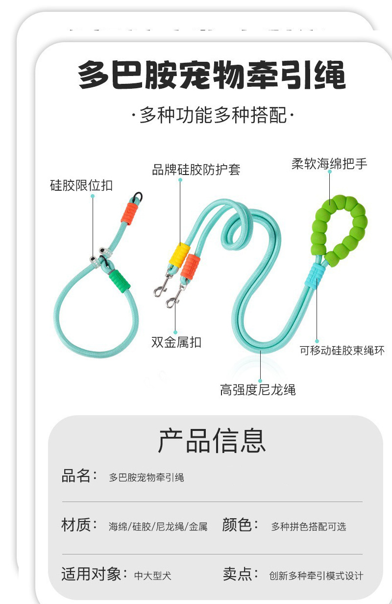| Color | Naranja de tracción de doble cabeza, rosa de tracción de doble cabeza, negro de tracción de doble cabeza, amarillo de tracción de doble cabeza, azul de tracción de doble cabeza, morado de tracción de doble cabeza, naranja de collar de cuerda p, rosa de collar de cuerda p, negro de collar de cuerda p, amarillo de collar de cuerda p, azul de collar de cuerda p, morado de collar de cuerda P |