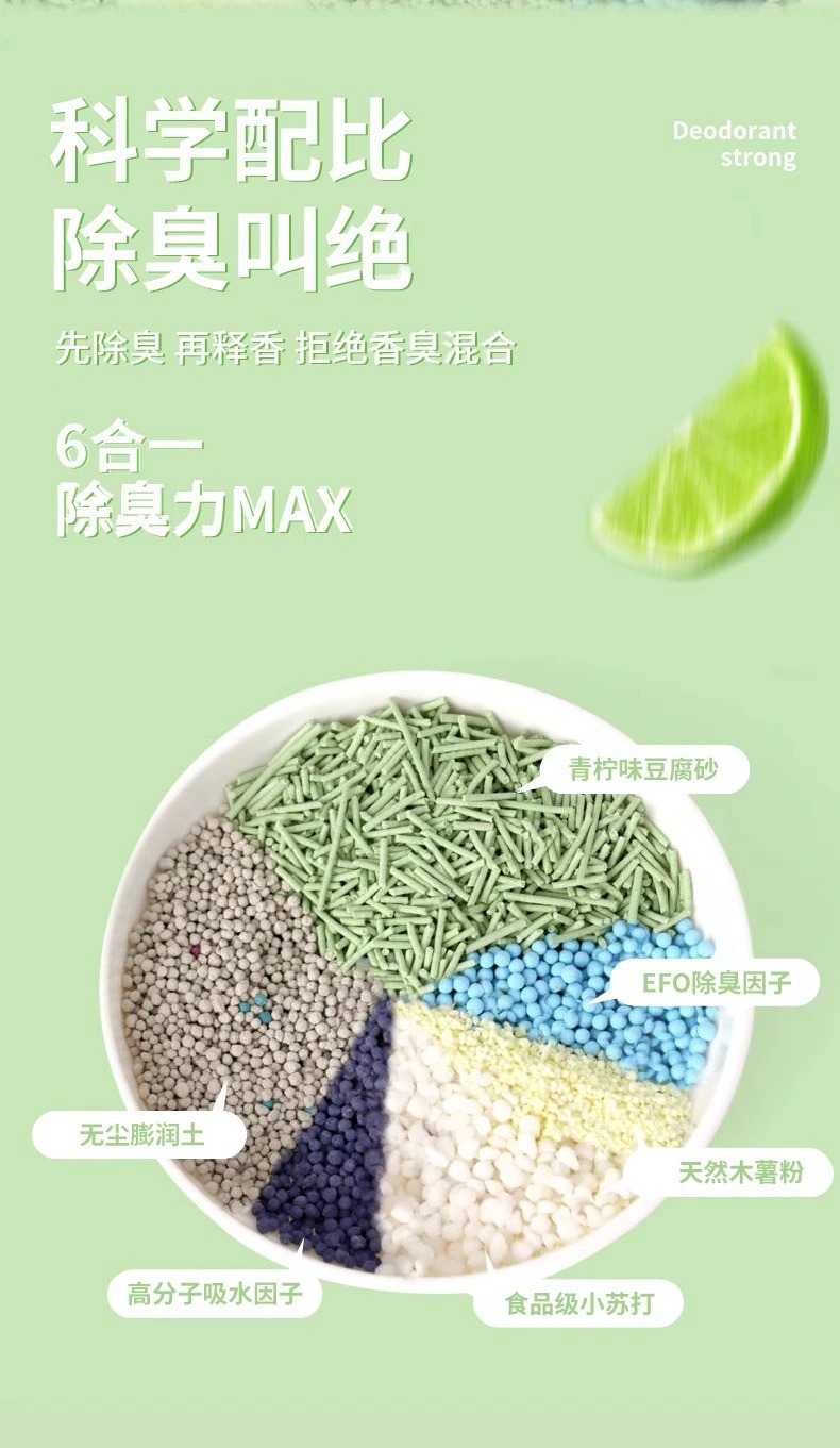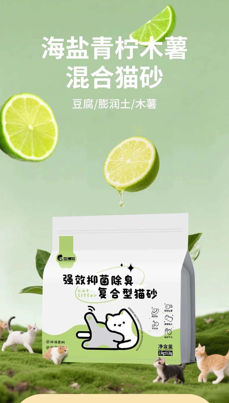 Guazhou Mu Cat Sand, sabor a lima, grupo antibacteriano, antiadherente, se puede descargar para desodorizar, tapioca sin polvo, mezcla de tofu, arena para gatos