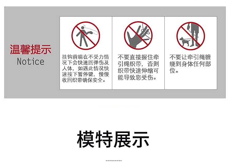 | Especificación (longitud * anchura) | S: longitud de la cuerda 5m, ancho de banda 1cm, recomendado para perros pequeños dentro de 20kg,M: longitud de la cuerda 5M, ancho de banda 1,1 cm, recomendado 50kg perro de tamaño mediano,L: longitud de la cuerda 5m, 1,2 cm Ancho de banda, recomendado para perros grandes más de 50 Jin |