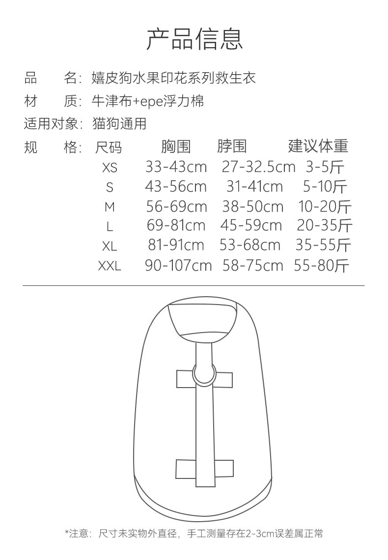XS (circunferencia del pecho 33-43, circunferencia del cuello 27-32 peso recomendado 1,50 kg-2,50 kg
