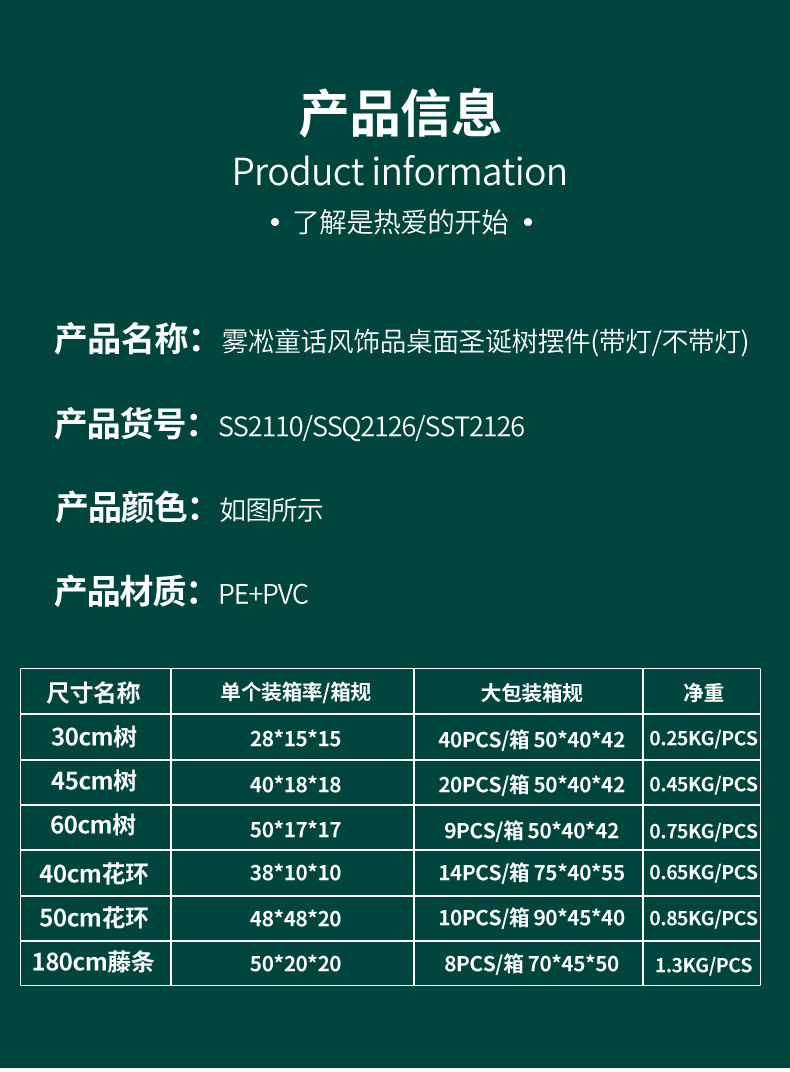 | Colores | Árbol de Navidad de 30CM sin luces,Árbol de Navidad de 45CM sin luces,Árbol de Navidad de 60CM sin luces,Árbol de Navidad de 30cm con luz,Árbol de Navidad de 45cm con luz,Árbol de Navidad de 60cm con luz,40CM sin corona de luz,50CM sin corona de luz,40CM con guirnalda ligera,50CM con guirnalda ligera,180CM sin luz de ratán,180CM de ratán con luz |
