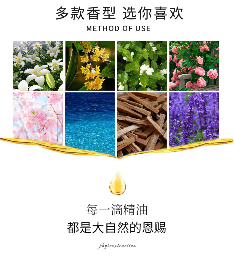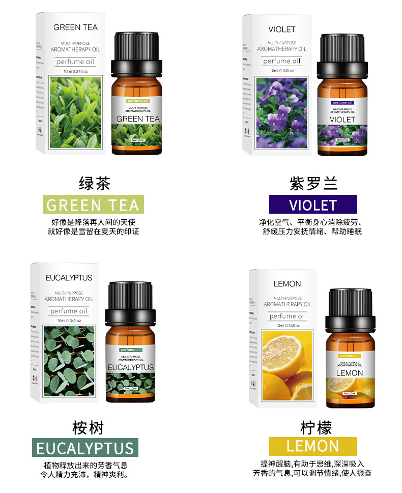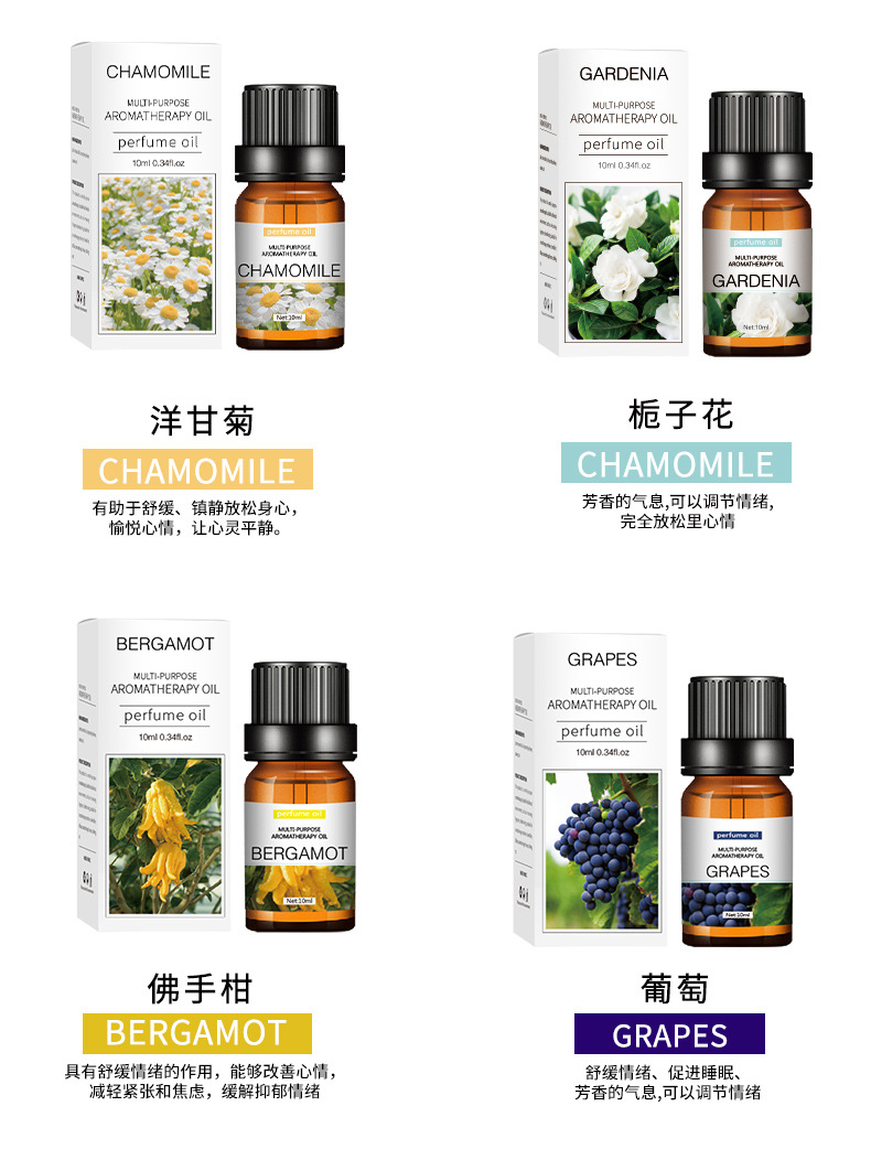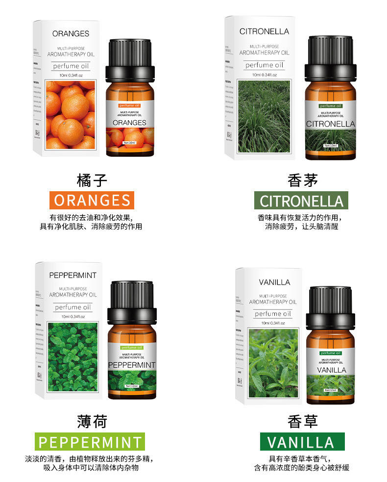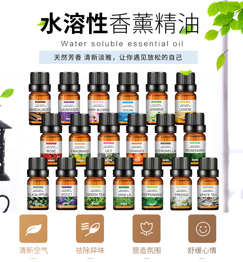Los aceites esenciales de aromaterapia que son solubles en agua son exclusivos para uso doméstico en humidificadores interiores y son adecuados para la aromaterapia en automóviles. Son seguros y no irritantes.