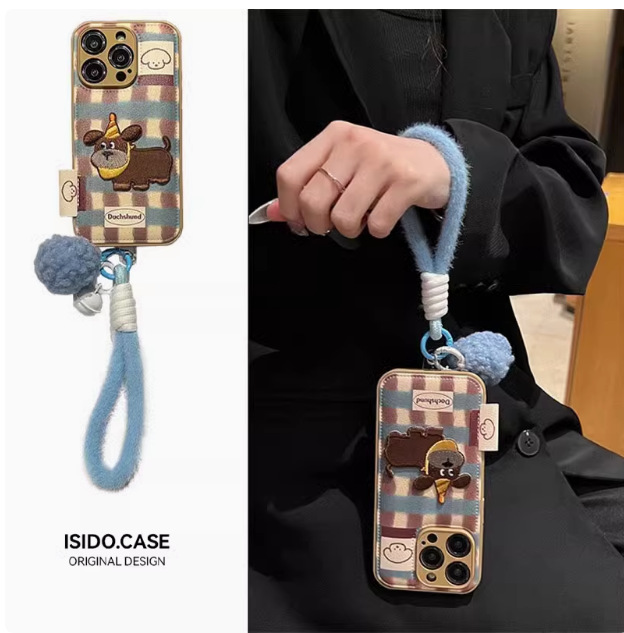 Cachorro bordado de dibujos animados iphone15 cuero 16ProMax funda para teléfono móvil apple 13 pareja 14 cordón 16