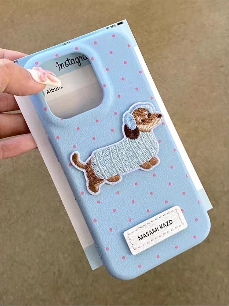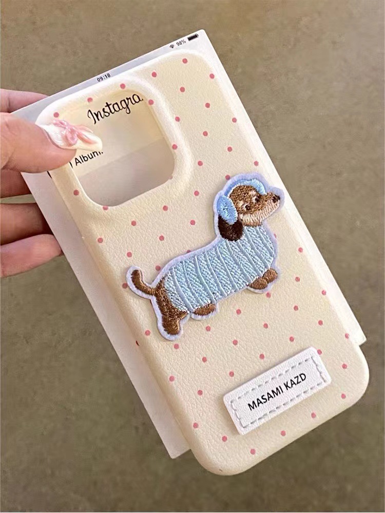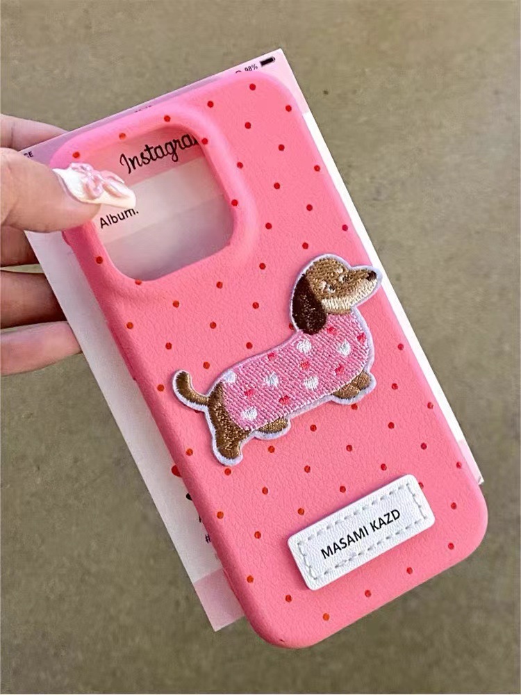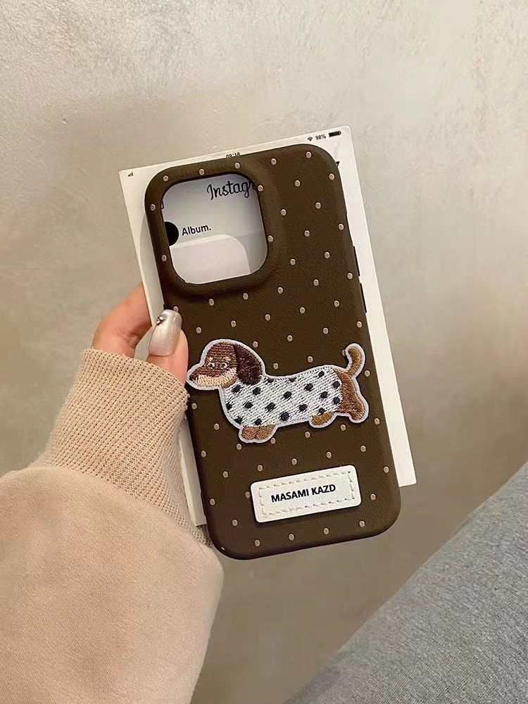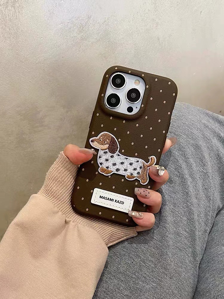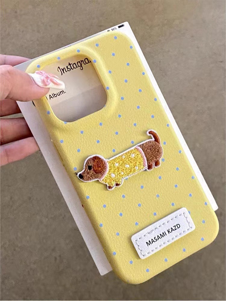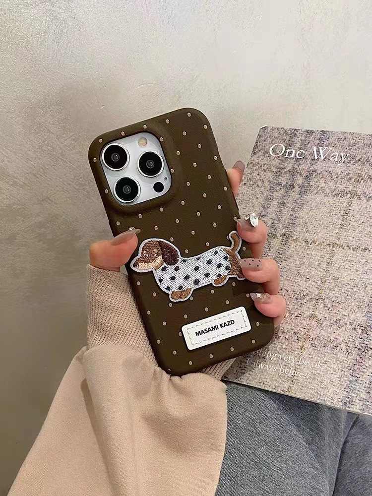 Perro de lunares de cuero ins para iPhone16promax dibujos animados 14 funda para teléfono 13 Apple 15P color sólido 16