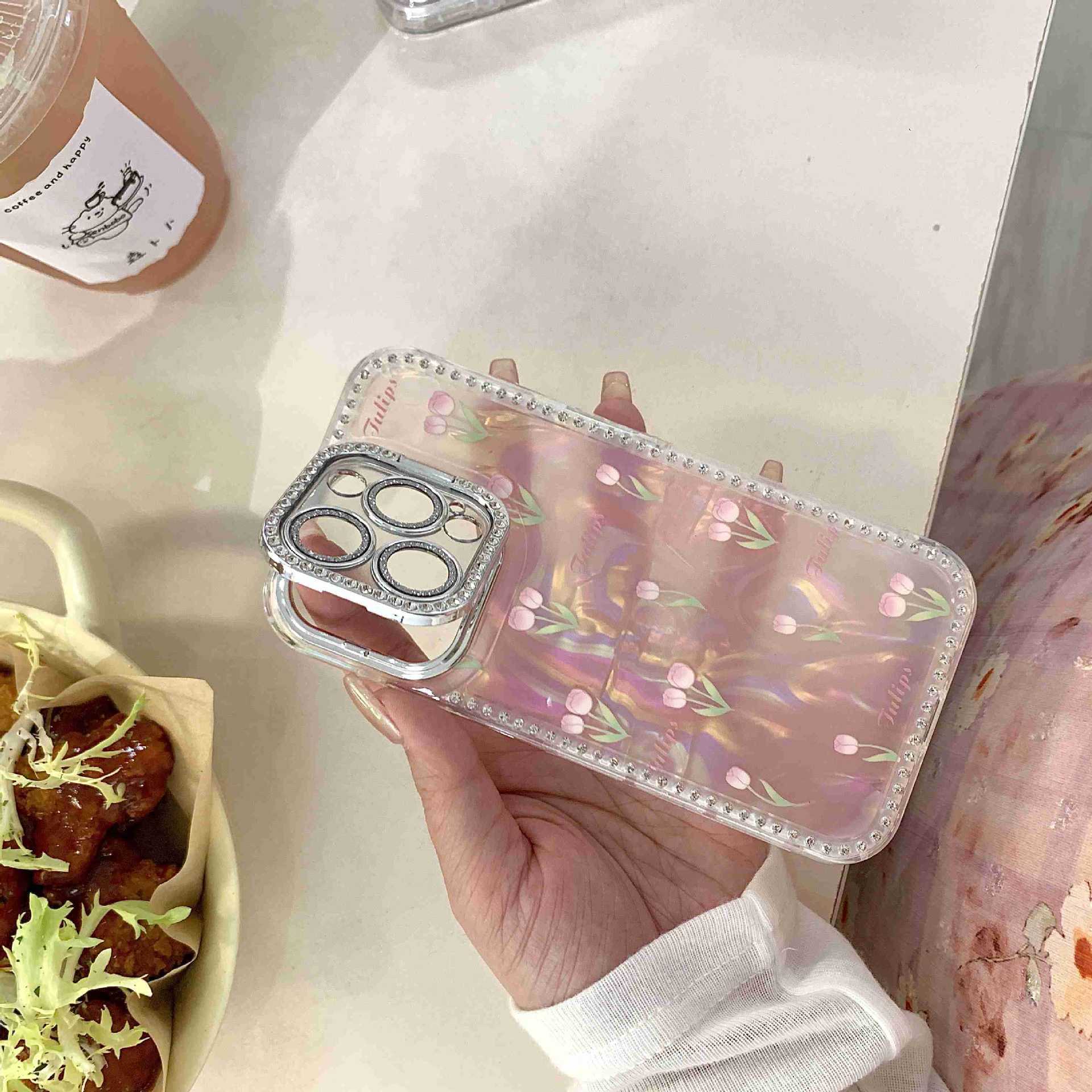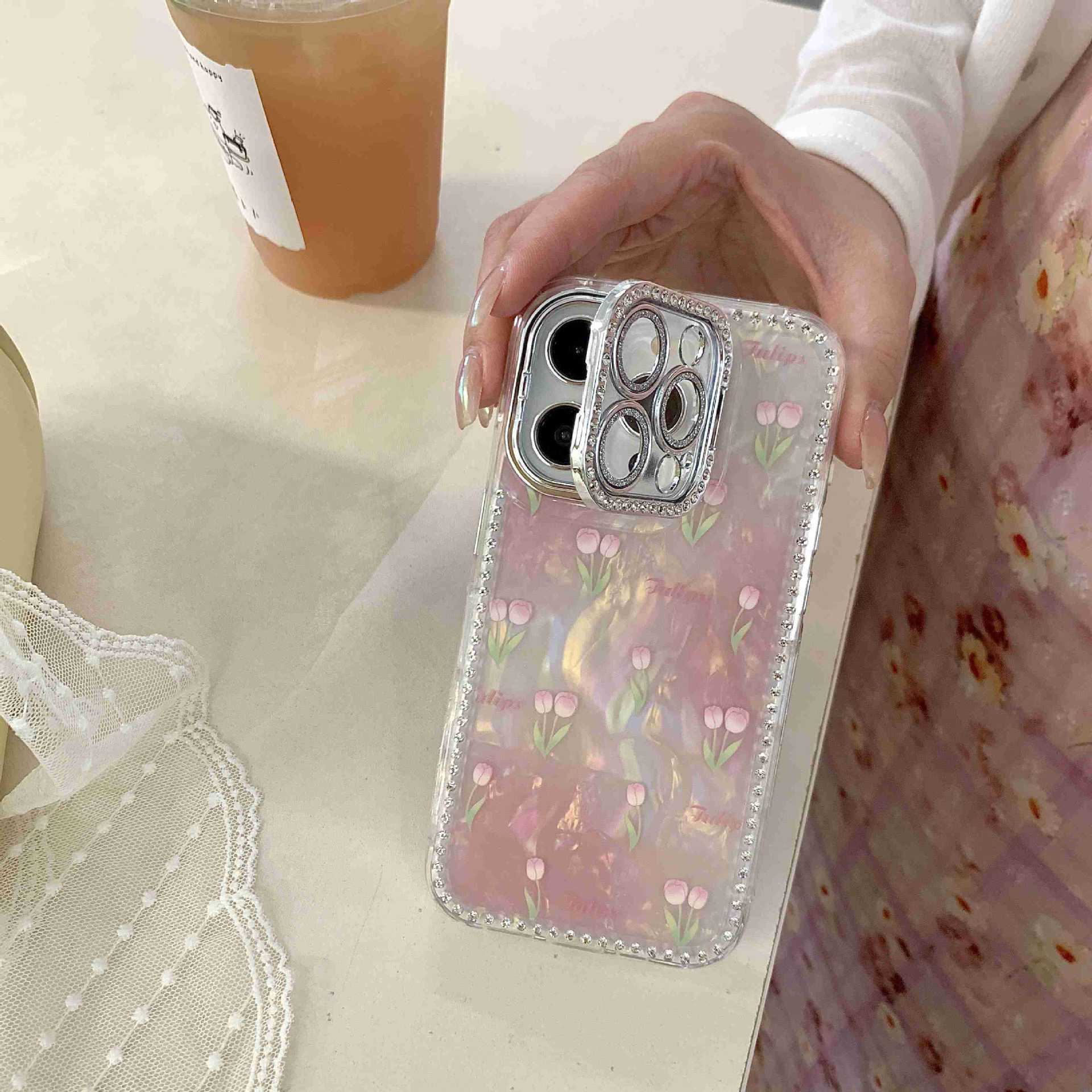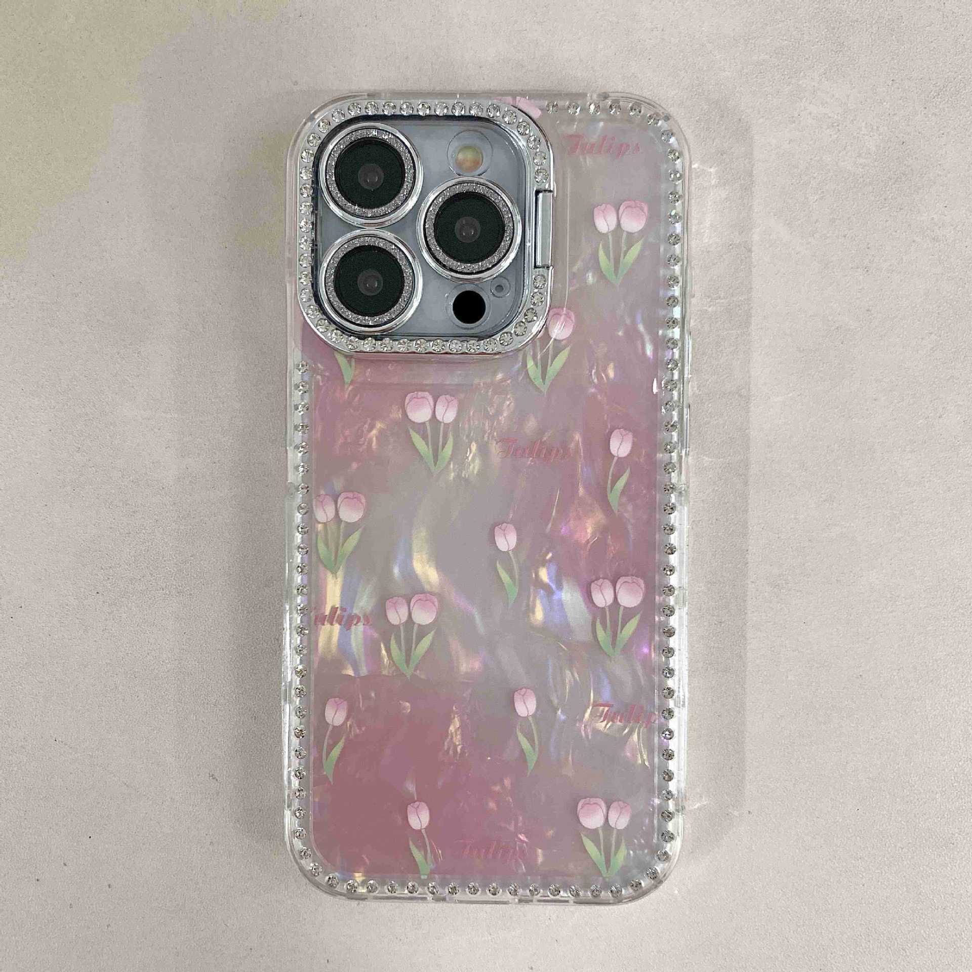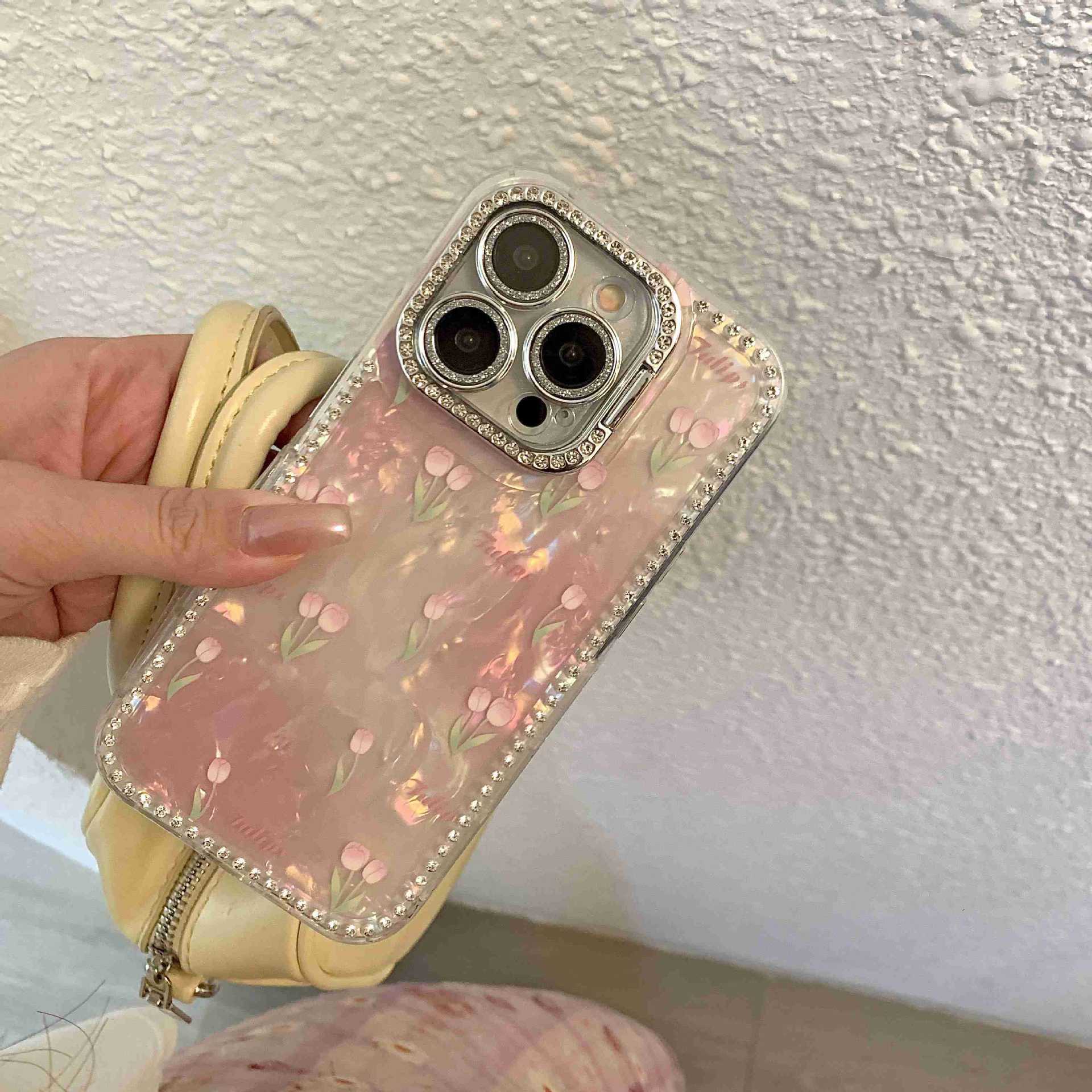 Spring ins Tulip Shell Patrón Adecuado para iphone16ProMax Diamante lateral 14/13 Apple 15 Funda para teléfono móvil Mujer
