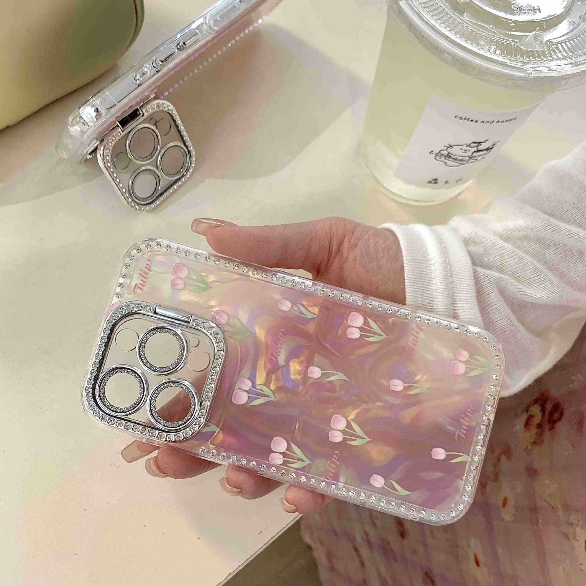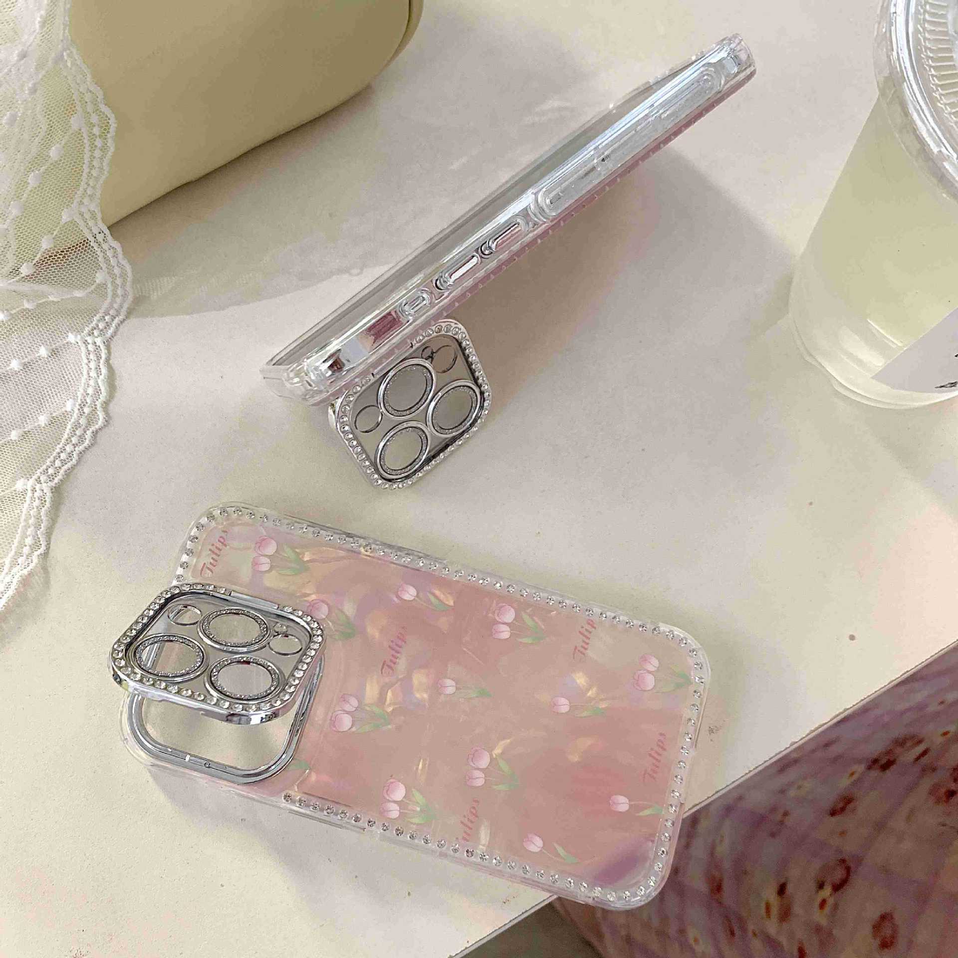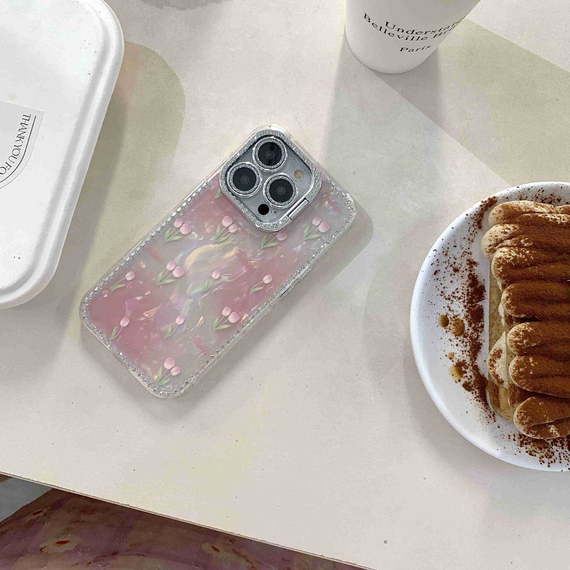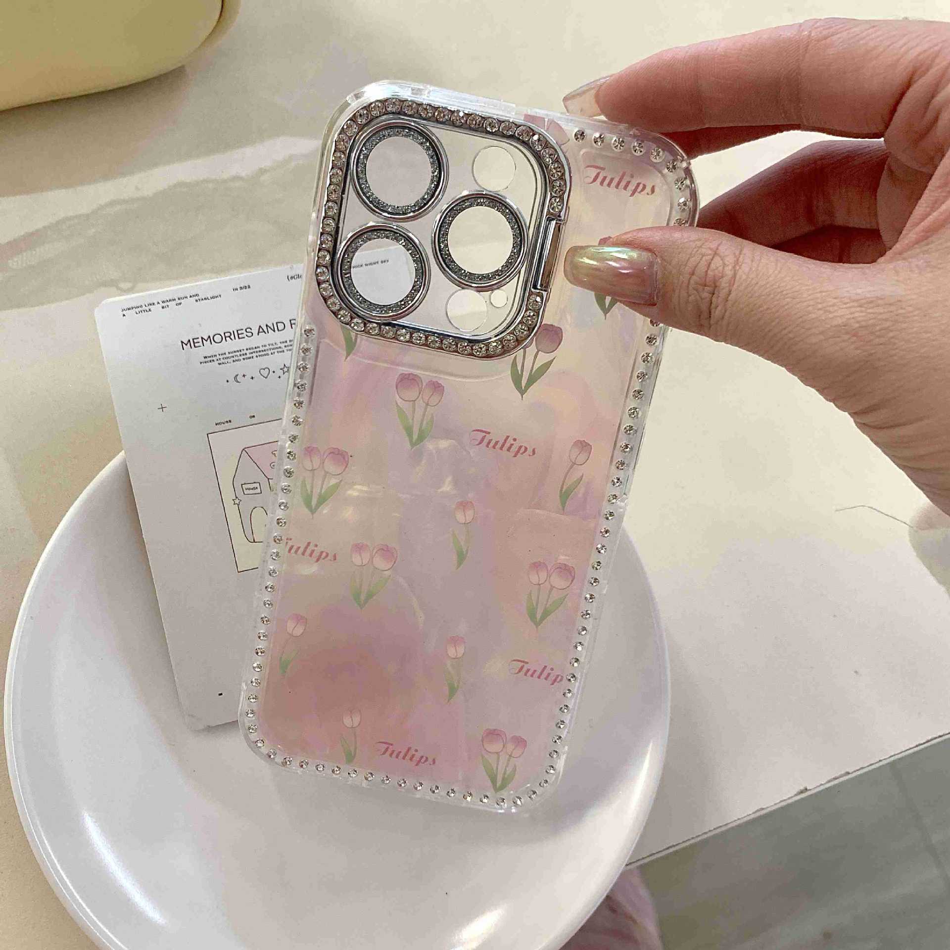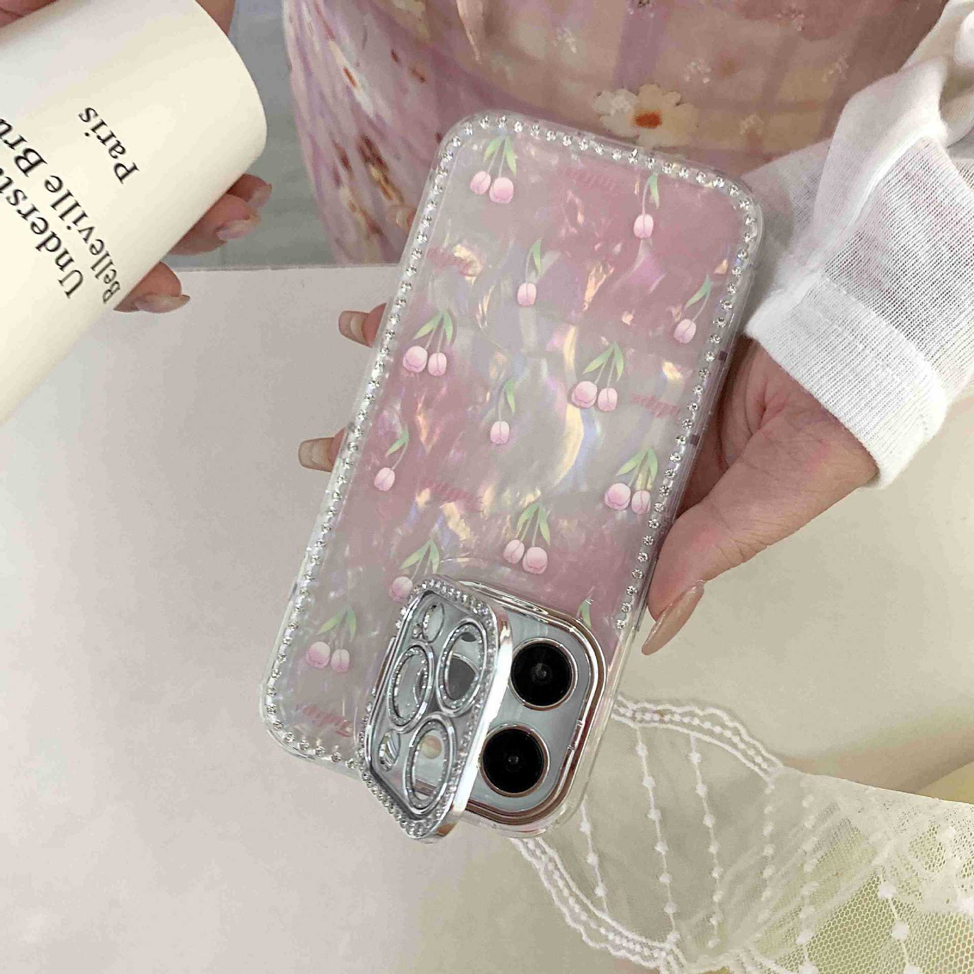 Spring ins Tulip Shell Patrón Adecuado para iphone16ProMax Diamante lateral 14/13 Apple 15 Funda para teléfono móvil Mujer