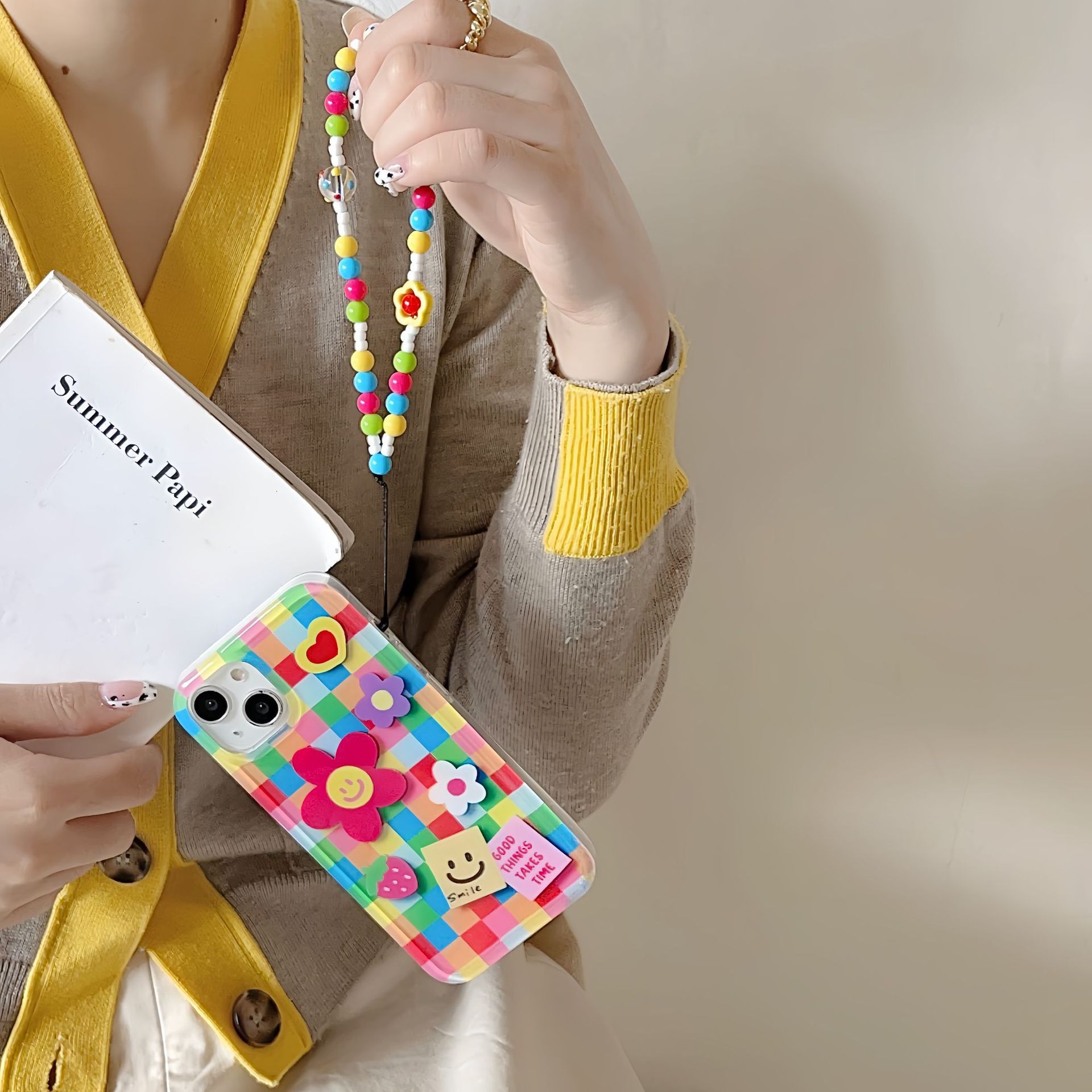 Ins color flor a cuadros cara sonriente para Apple 13 funda para teléfono móvil 15ProMax cadena iPhone14P hembra 12