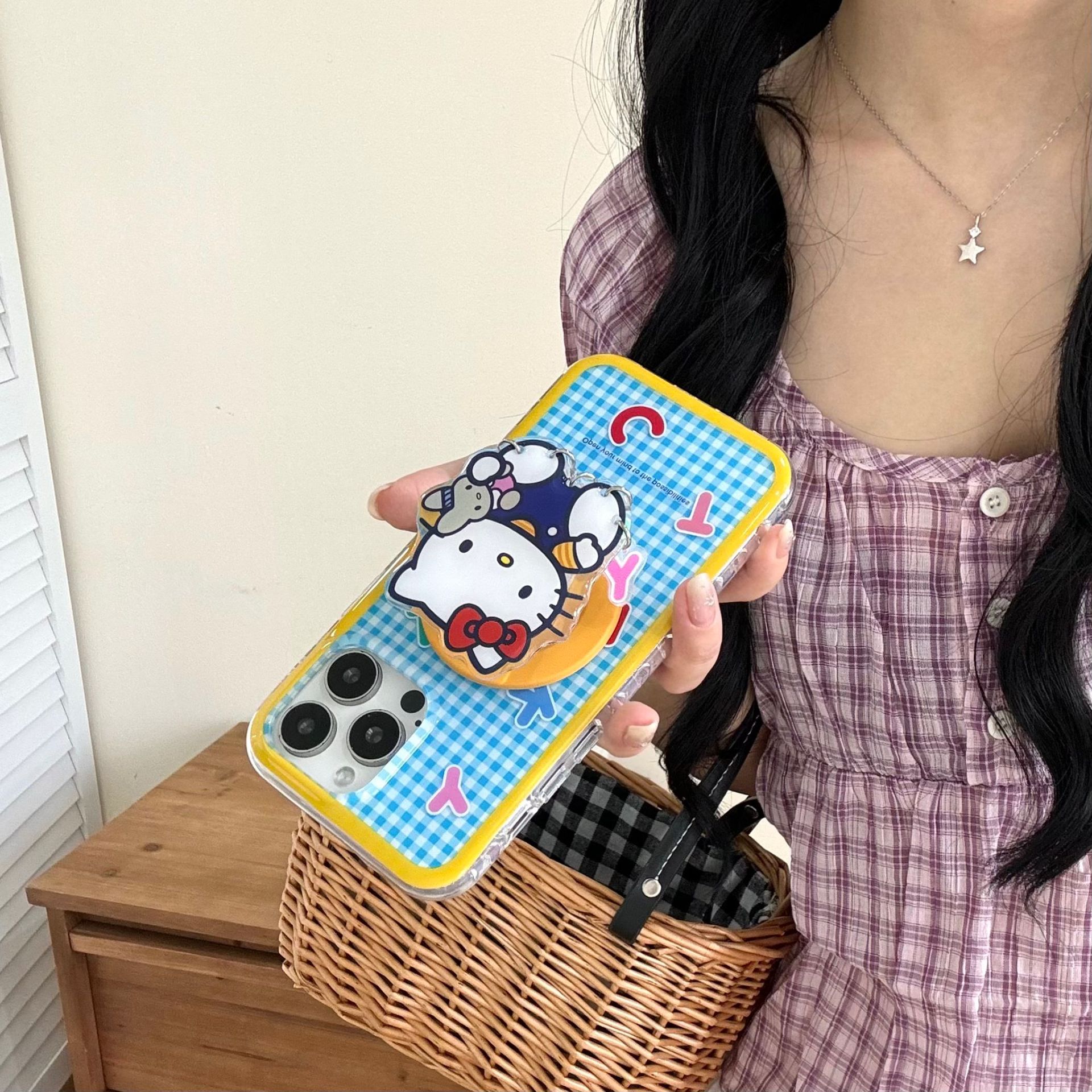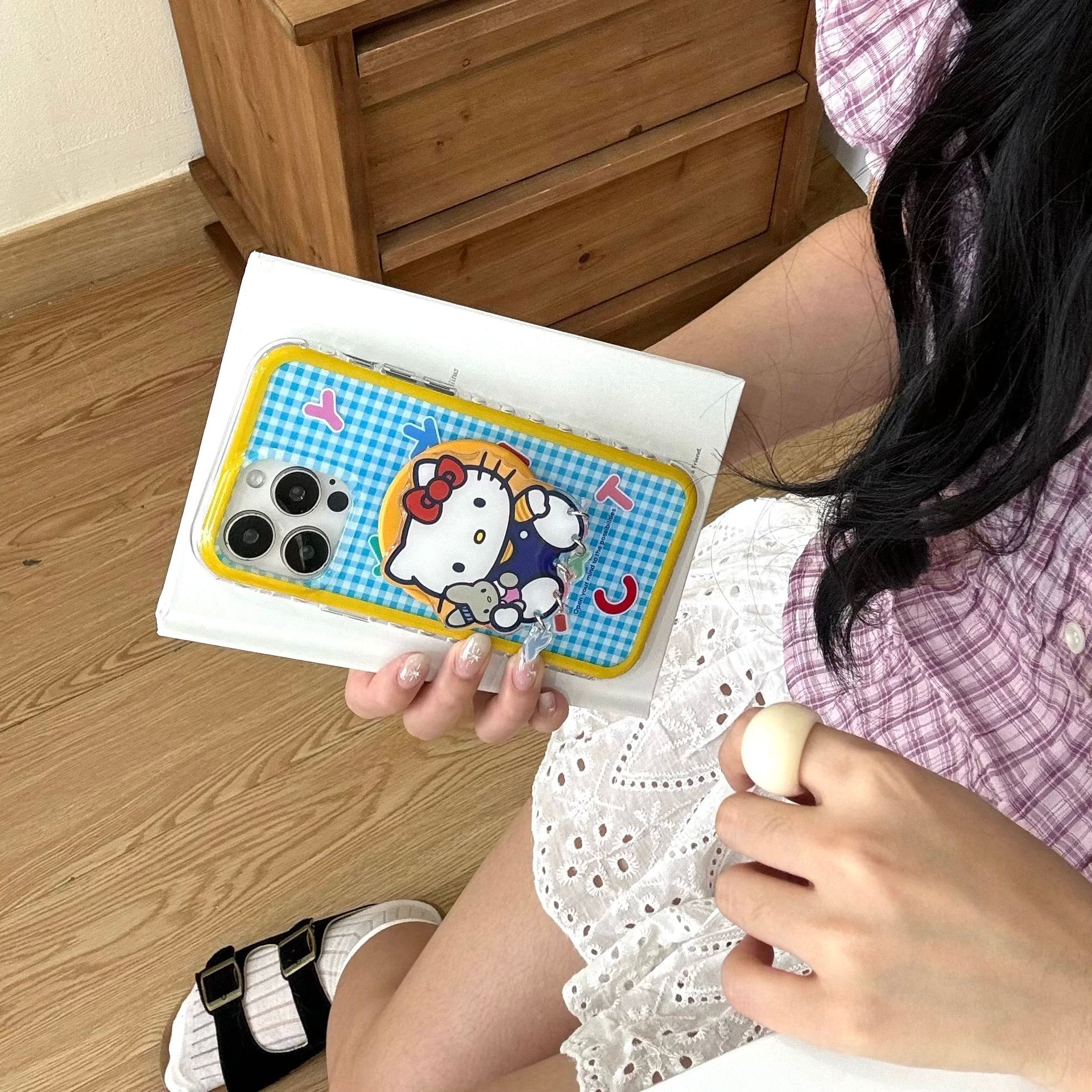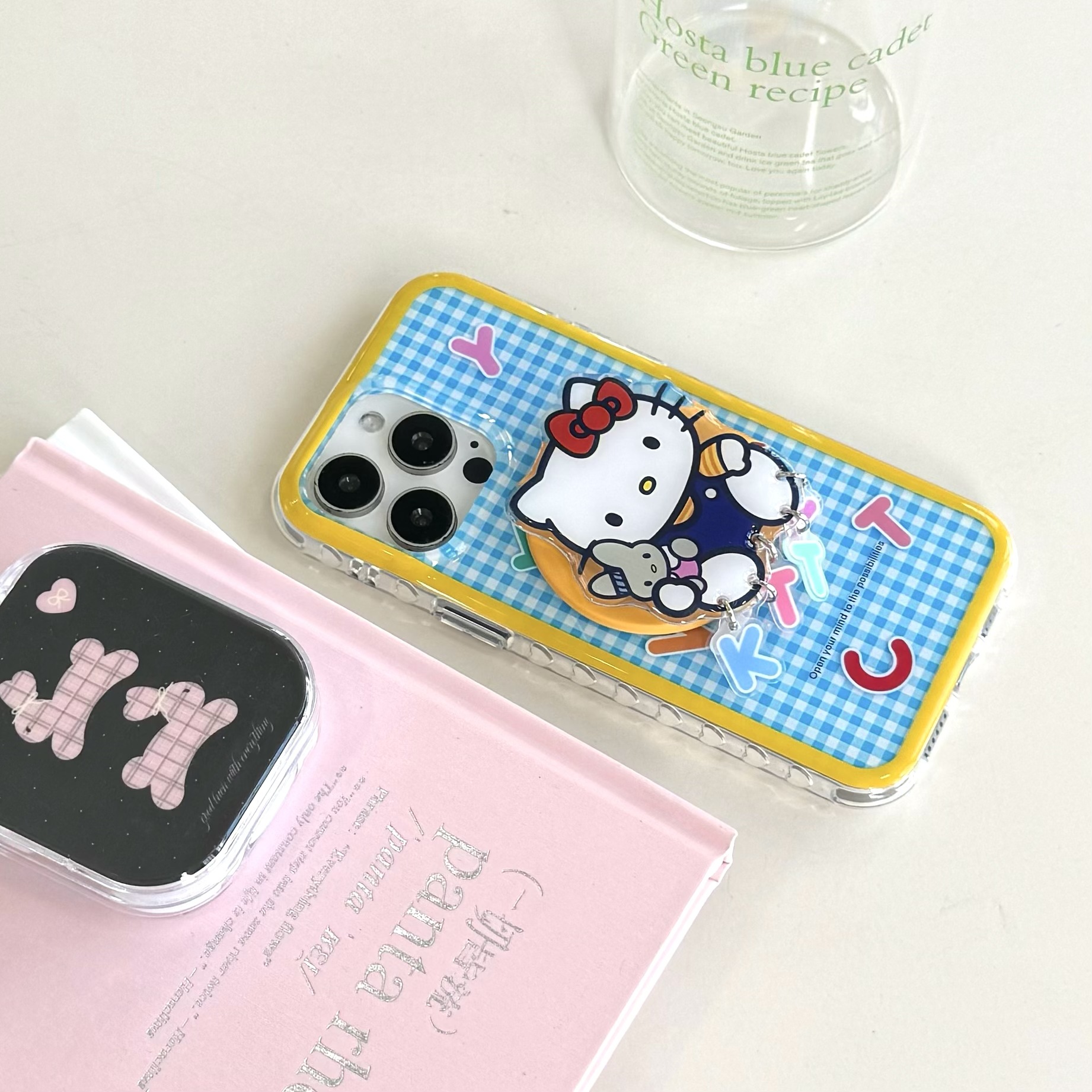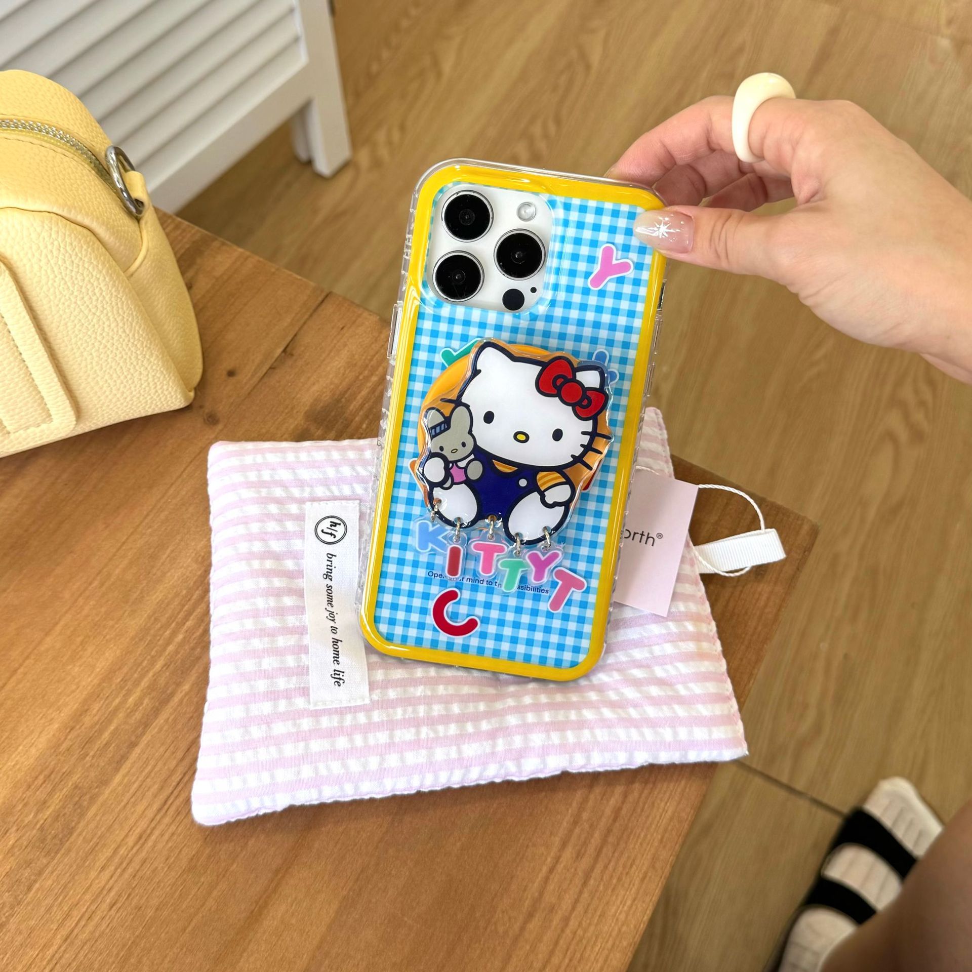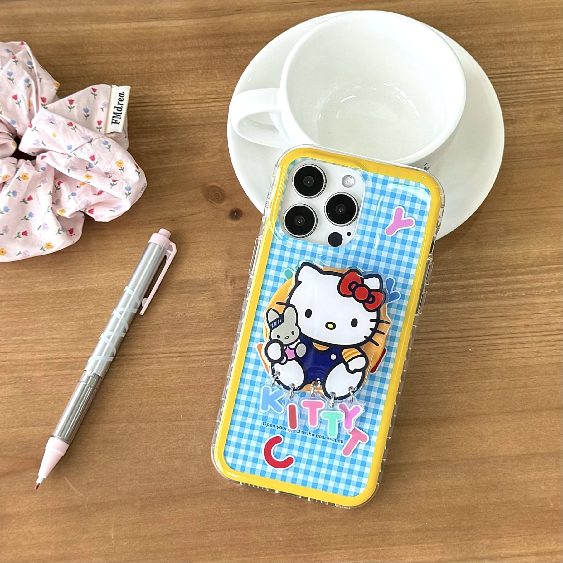 Lindo patrón de cuadros azul y amarillo Inglés KT gato para Apple 15ProMax funda para teléfono móvil 16Pro dibujos animados 14/13 nuevo 16