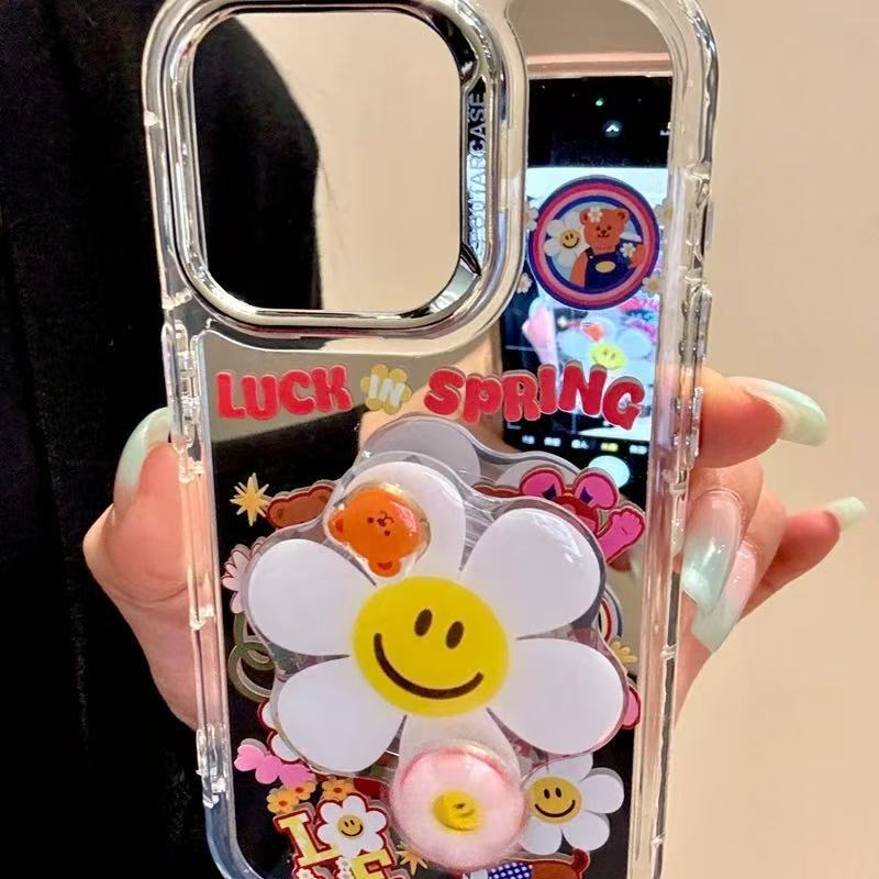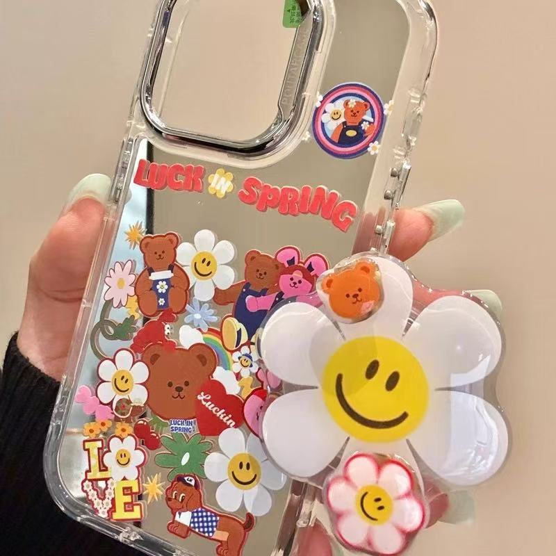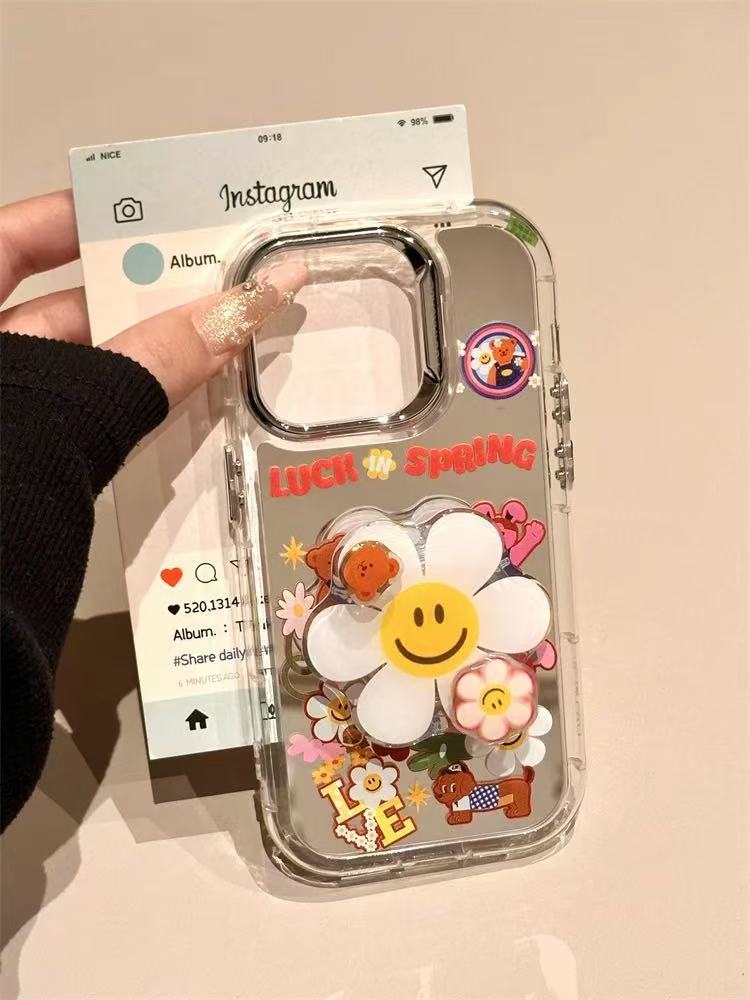 Verano lindo dibujos animados flor oso para iphone15 espejo 16ProMax funda para teléfono móvil Apple 13 femenino 14