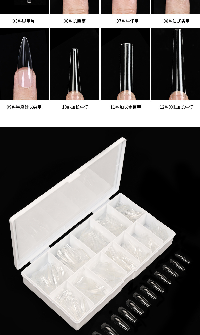 | Color | 01 # cabeza redonda corta (504 piezas),02 # gota de agua clavo (504 piezas),03 # totalmente helado de almendra (504 piezas),04 # Ballet semi-Helado (504 piezas),05 # pieza de clavo pie (504 piezas),06 # Ballet largo (504 piezas),07 # Denim a (504 piezas),08 # clavo de Punta francesa (504 piezas),09 # clavos puntiagudos largos semi-helados (504 piezas),10 # XXL Denim nail (360 piezas),11 # XXL tubo de agua alargado de uñas (360 piezas),12 # 3XL Armadura de mezclilla (300 piezas) |