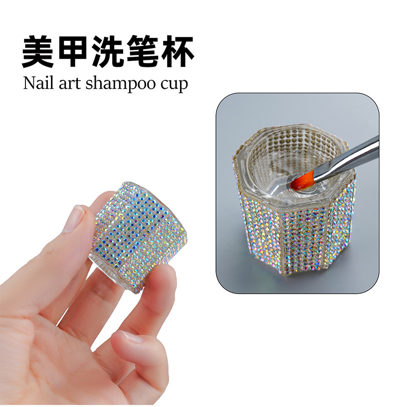 Taza de cristal de manicura taza de lavado de lápiz de alto nivel llena de diamante cuadrado transparente recipiente de limpieza de vidrio con taza de cubierta taza de joyería